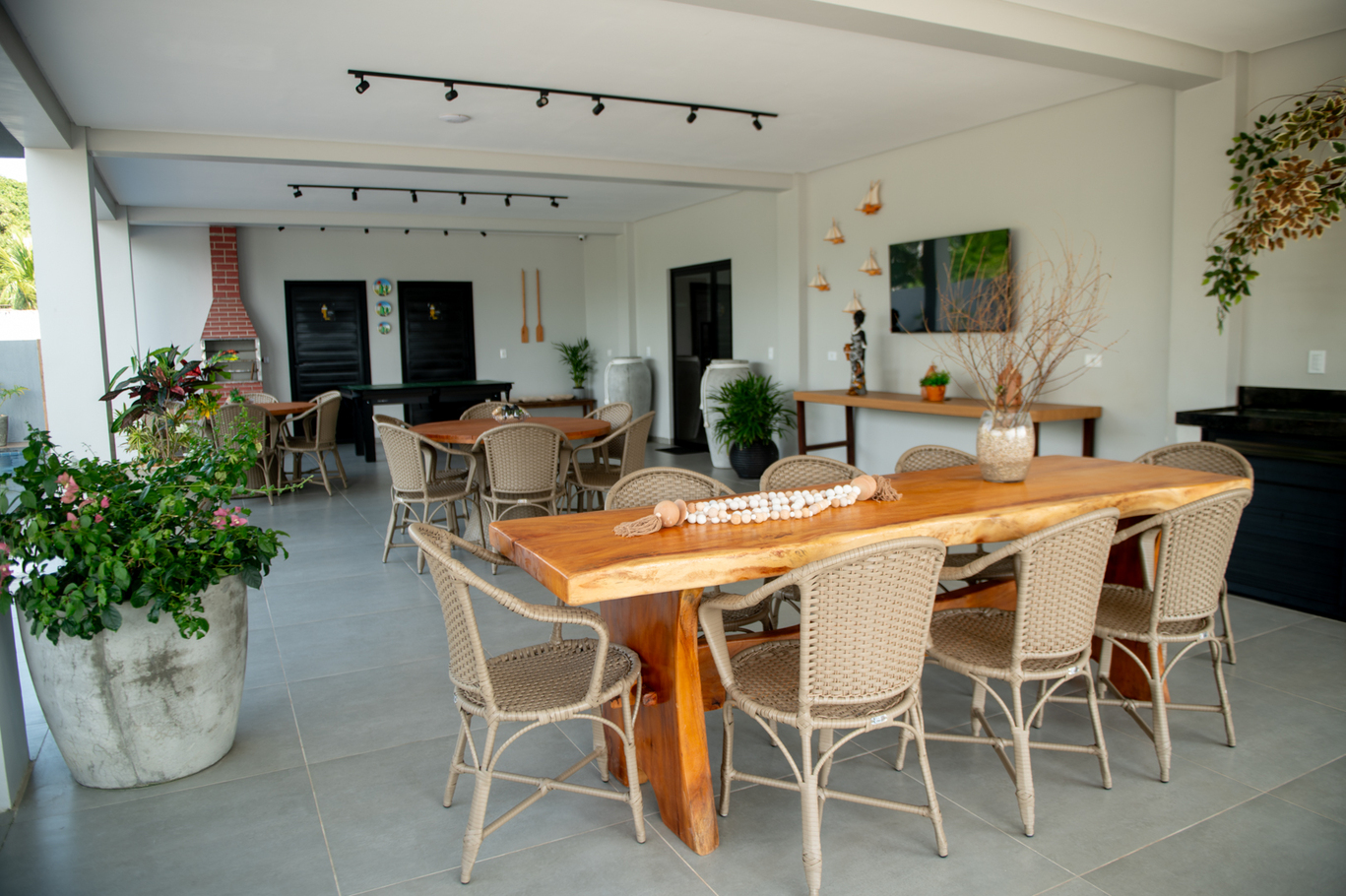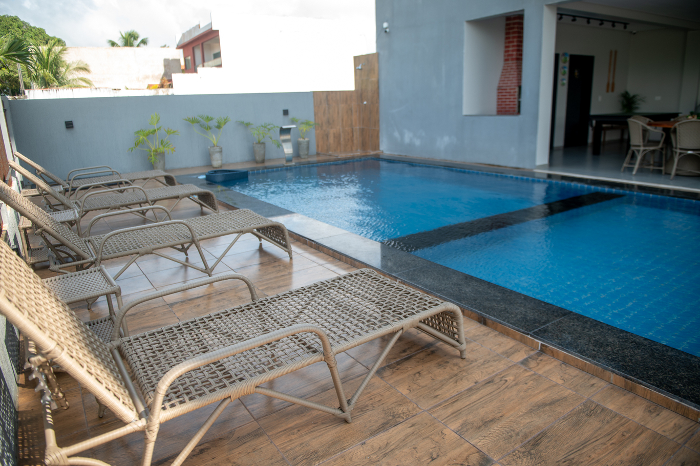 - Área de lazer com piscina, churrasqueira, espreguiçadeiras, Smart TV e salão de jogos