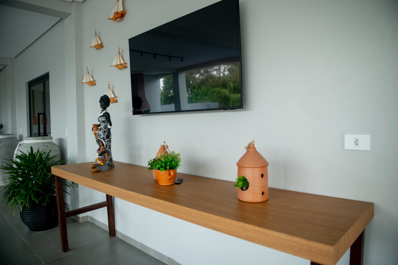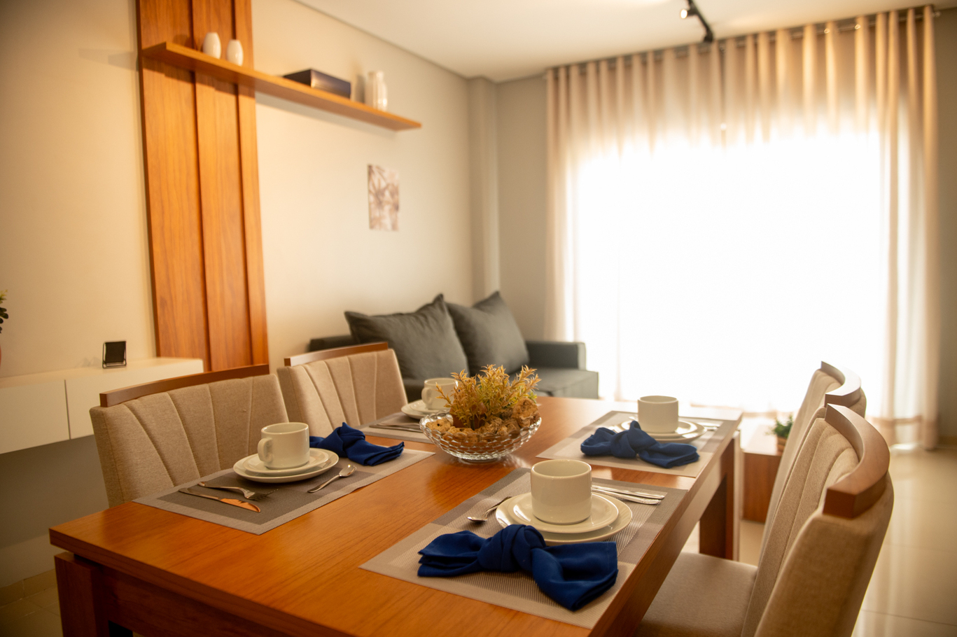- Sala integrada à cozinha com sofá, Smart TV e mesa de refeições