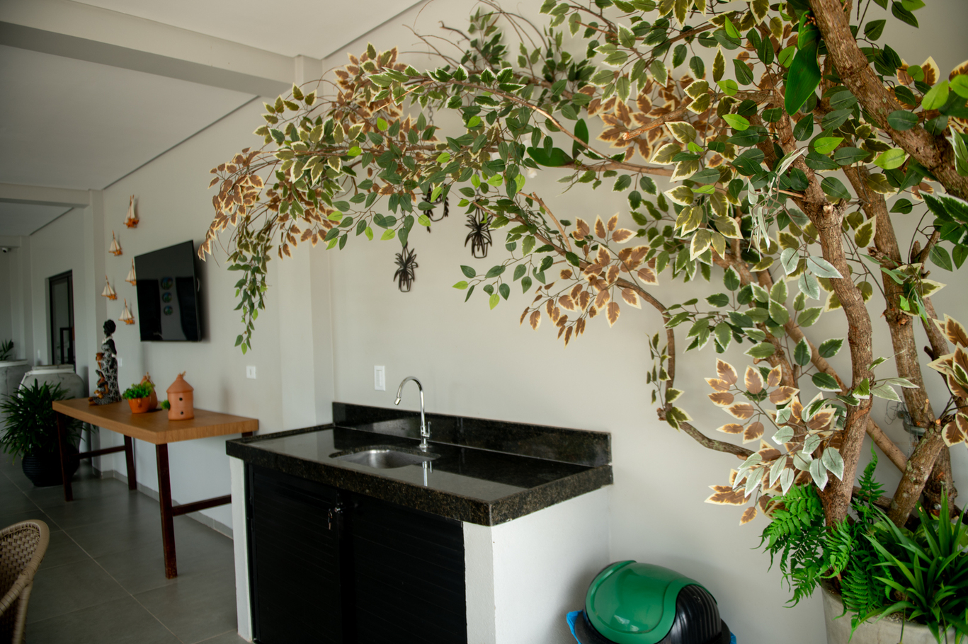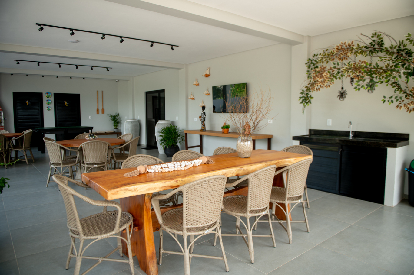 - Área de lazer com piscina, churrasqueira, espreguiçadeiras, Smart TV e salão de jogos