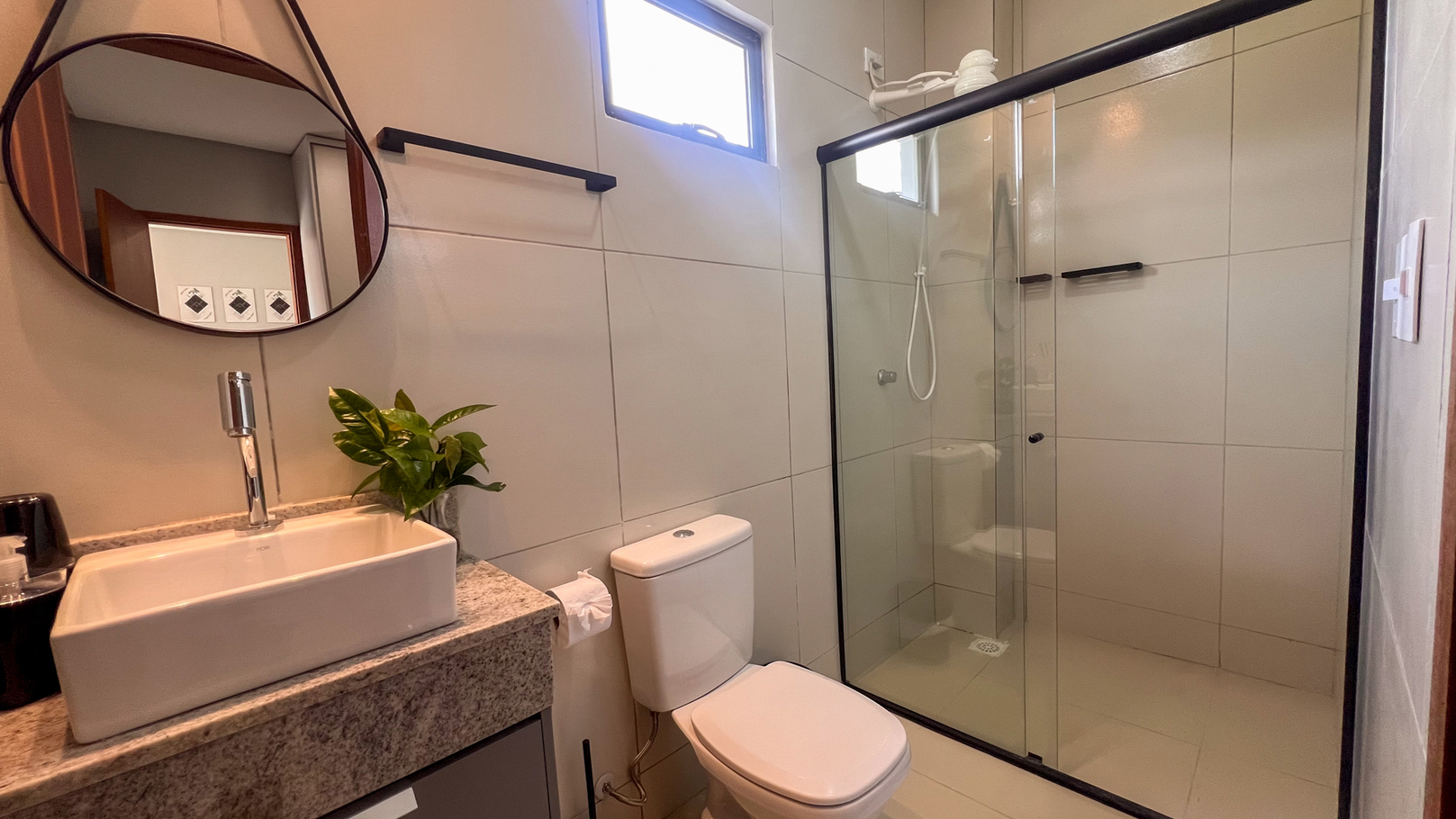 - Quarto 2(suíte): cama de casal, ar-condicionado e banheiro privativo com box de vidro