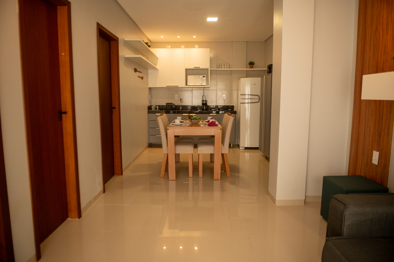 - Sala integrada à cozinha com sofá, Smart TV e varanda