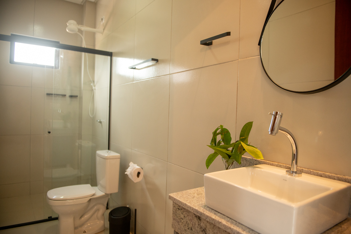 - Banheiro social com chuveiro elétrico e box de vidro