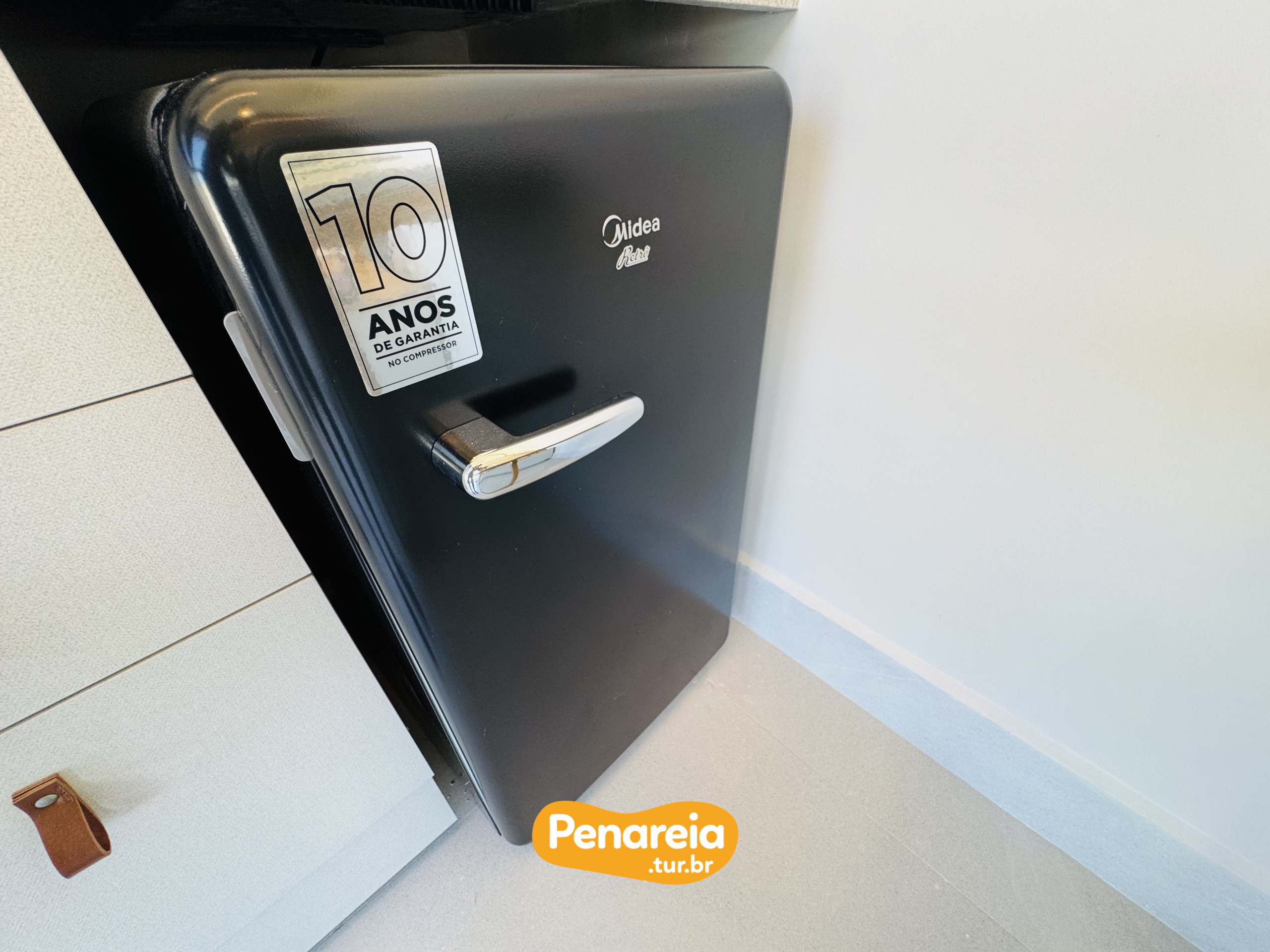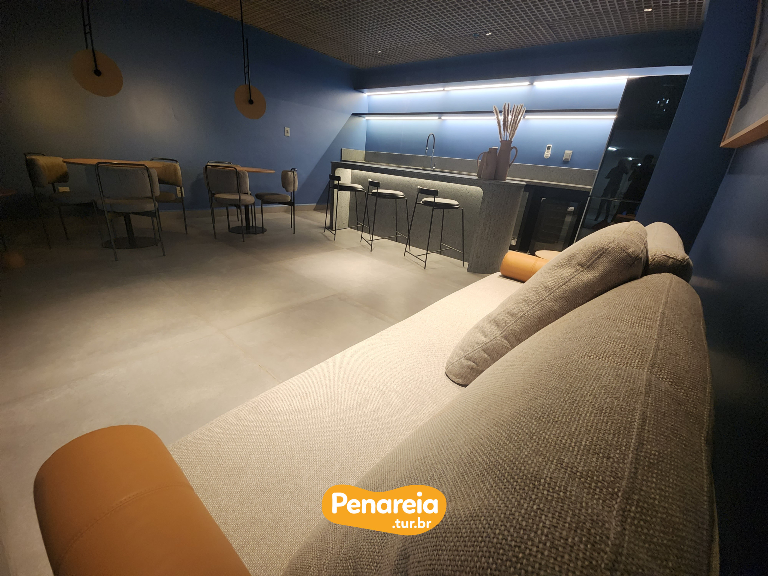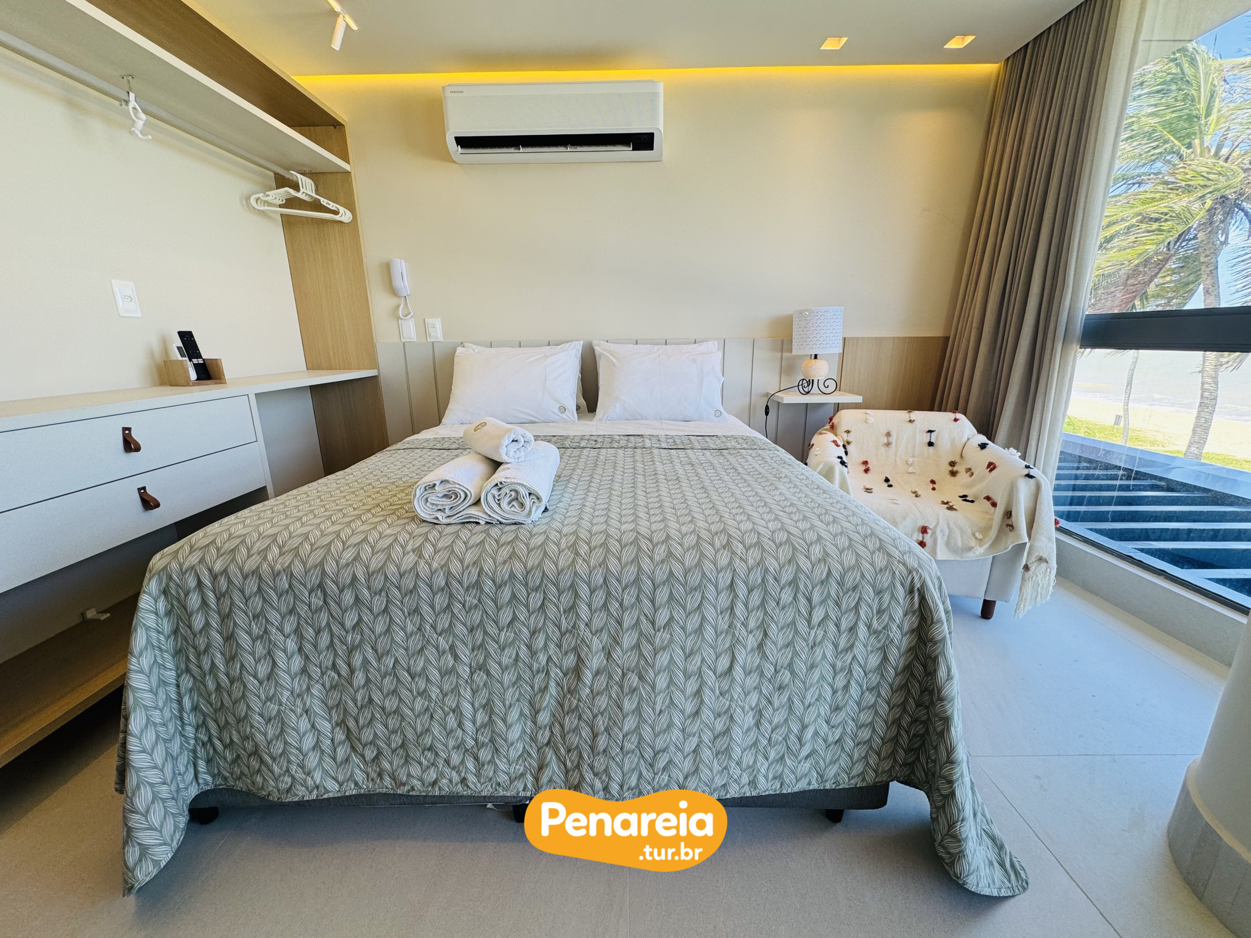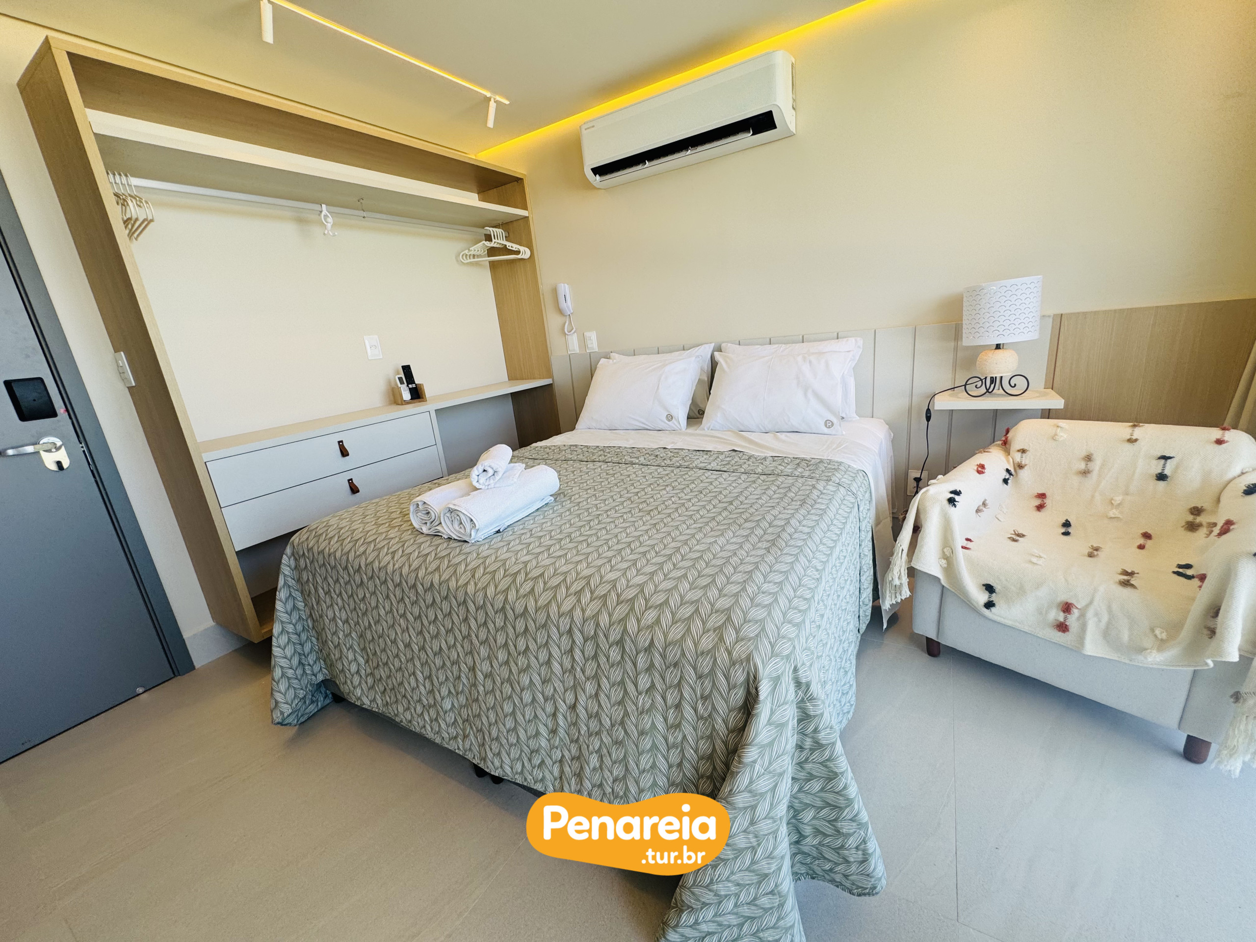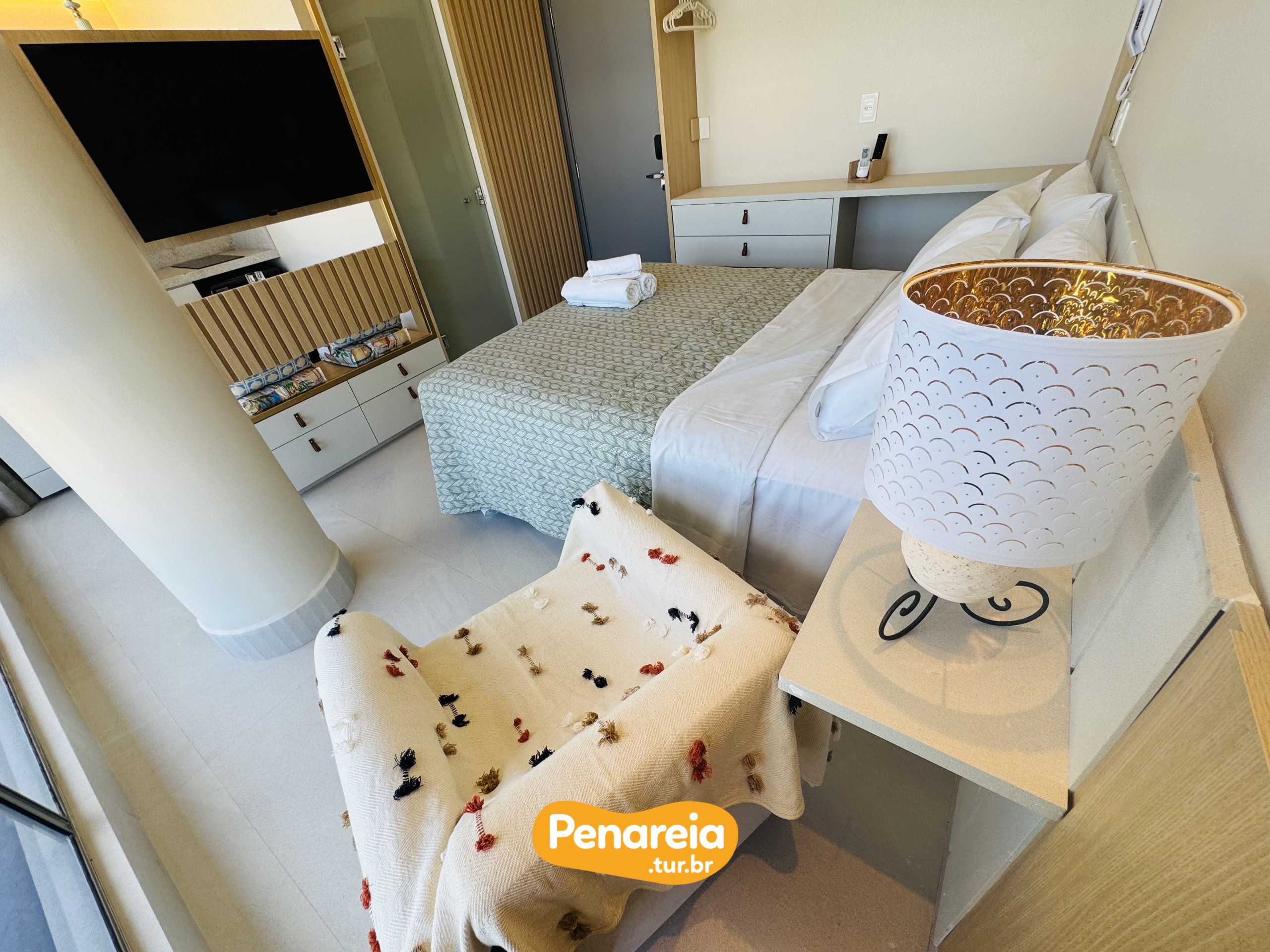 O espaço conta com um quarto elegante equipado com uma cama de casal queen size e uma cama adicional, permitindo acomodar confortavelmente até 3 pessoas. A luminosidade e o design contemporâneo criam um ambiente tranquilo perfeito para descansar após um dia de praia.
