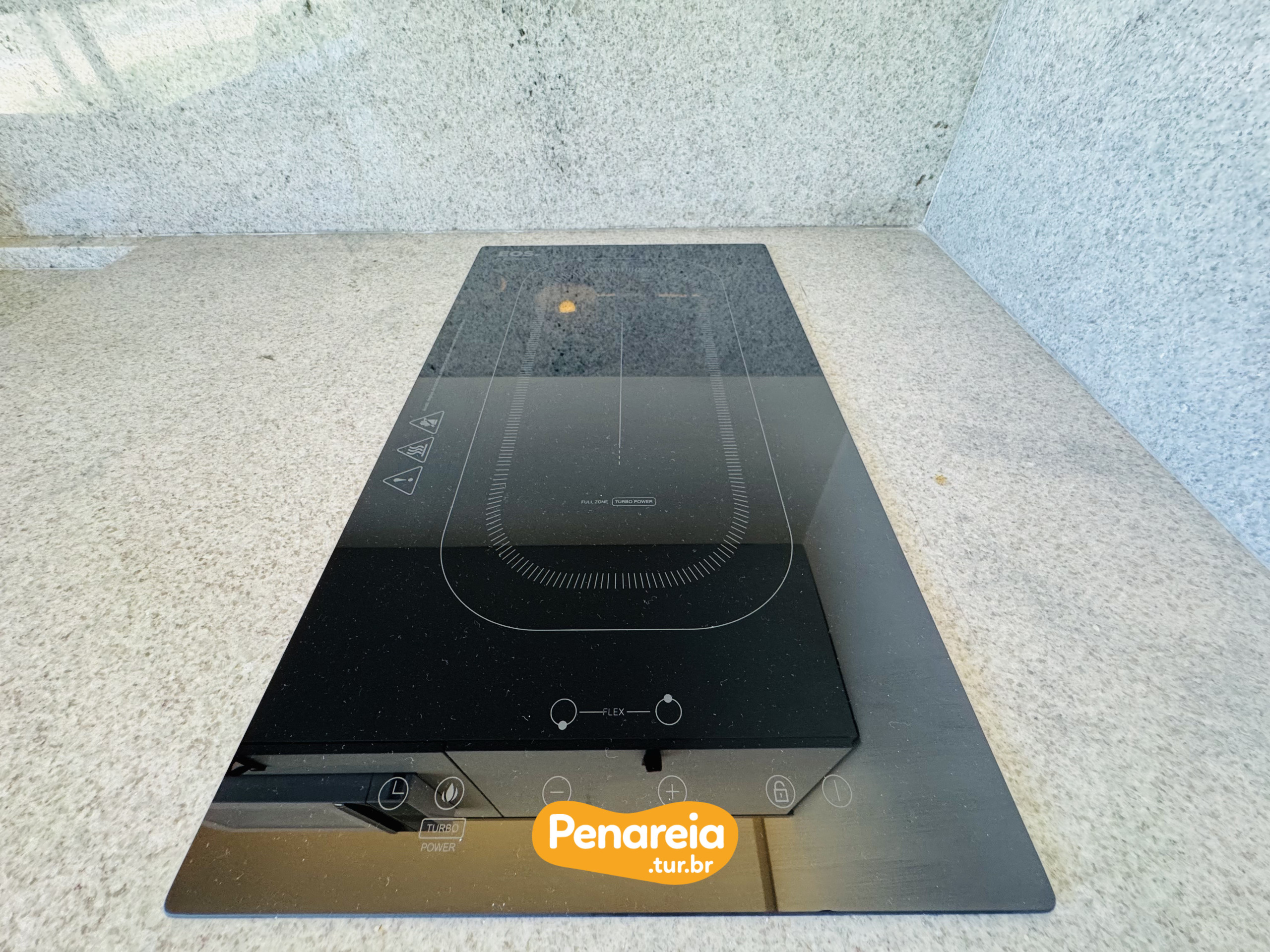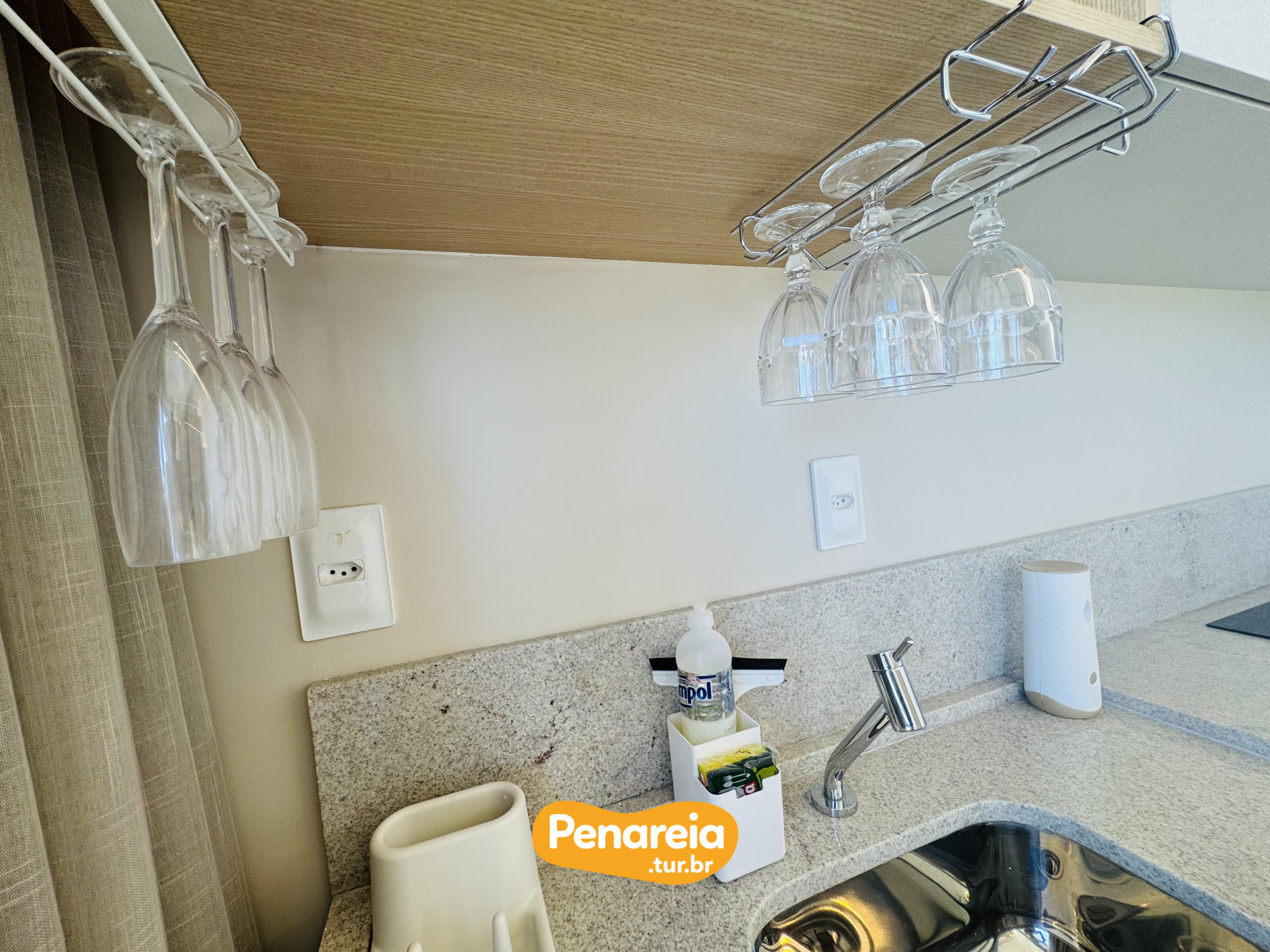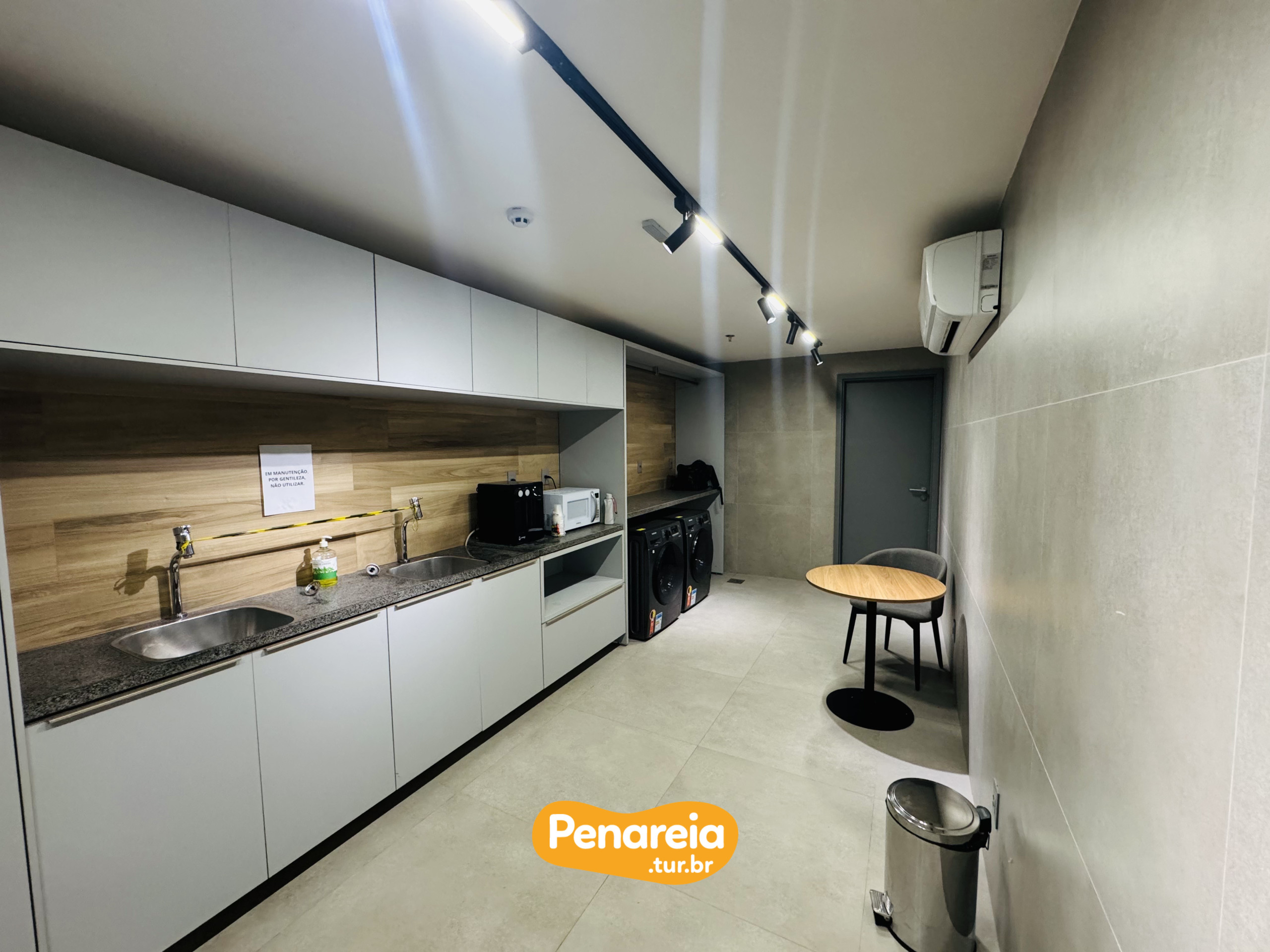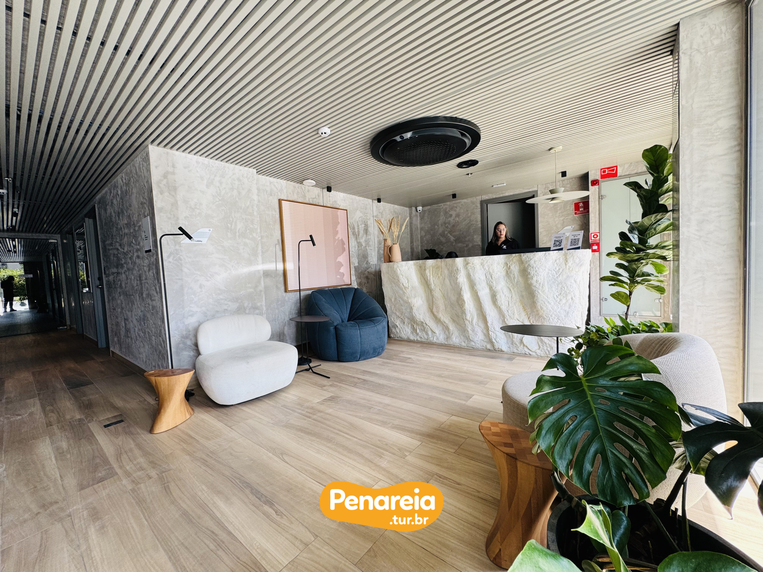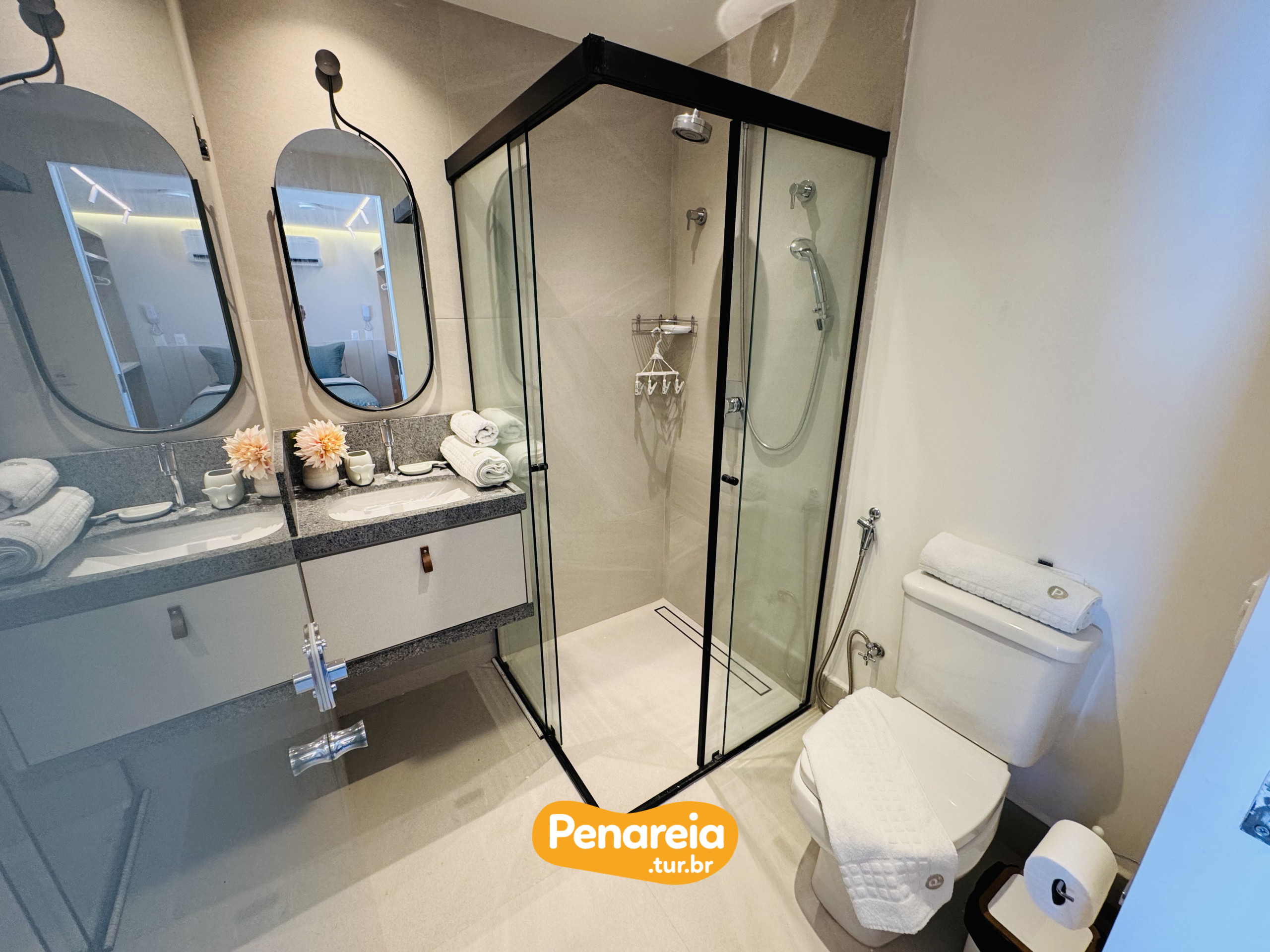 O espaço conta com um quarto elegante equipado com uma cama de casal queen size e uma cama adicional, permitindo acomodar confortavelmente até 3 pessoas. A luminosidade e o design contemporâneo criam um ambiente tranquilo perfeito para descansar após um dia de praia.