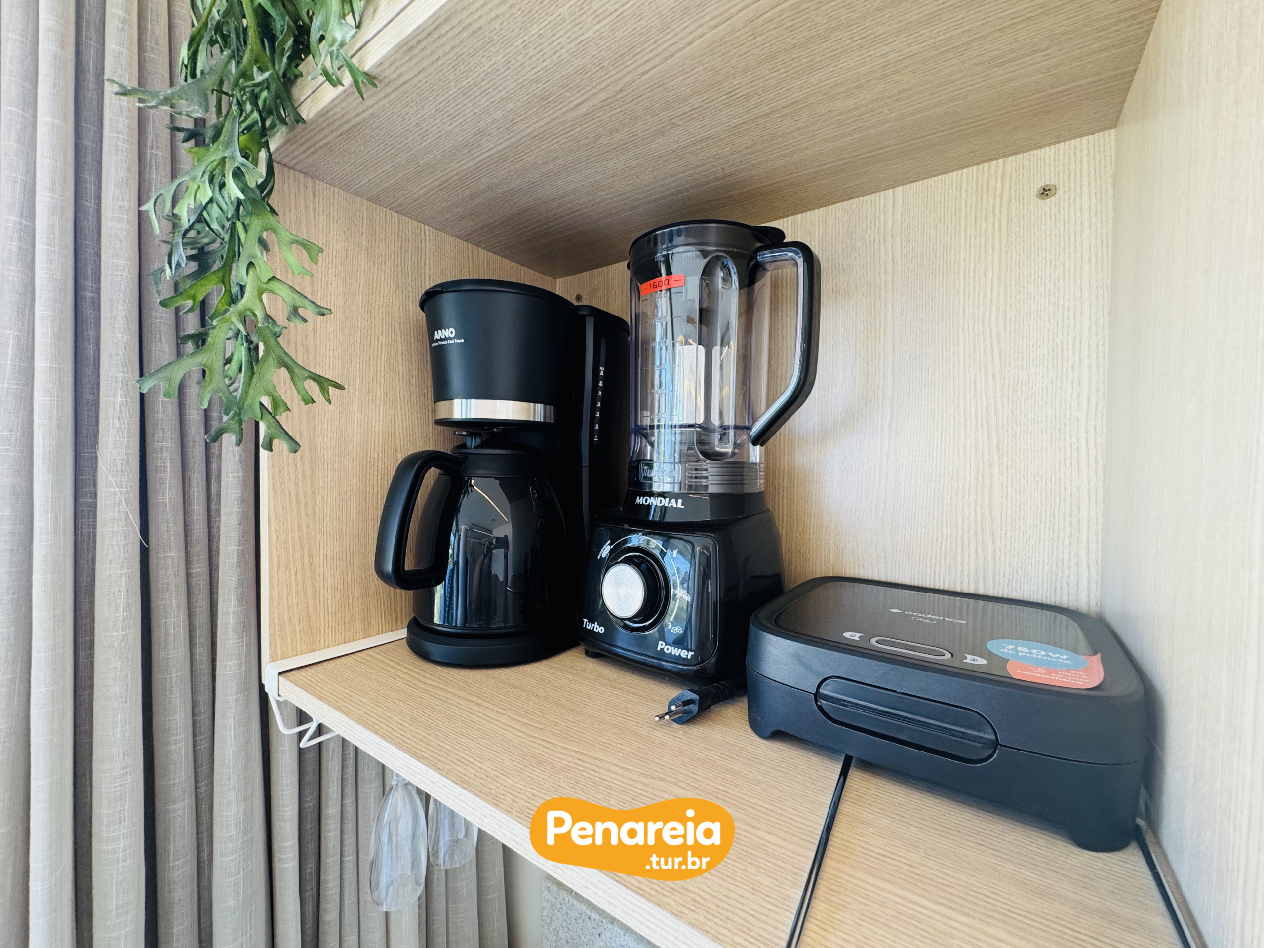 A cozinha, embora compacta, está equipada com utensílios essenciais, incluindo micro-ondas e espremedor de frutas, permitindo preparar refeições rápidas e práticas. O apartamento dispõe ainda de ar condicionado para garantir o máximo conforto, especialmente nos dias mais quentes.