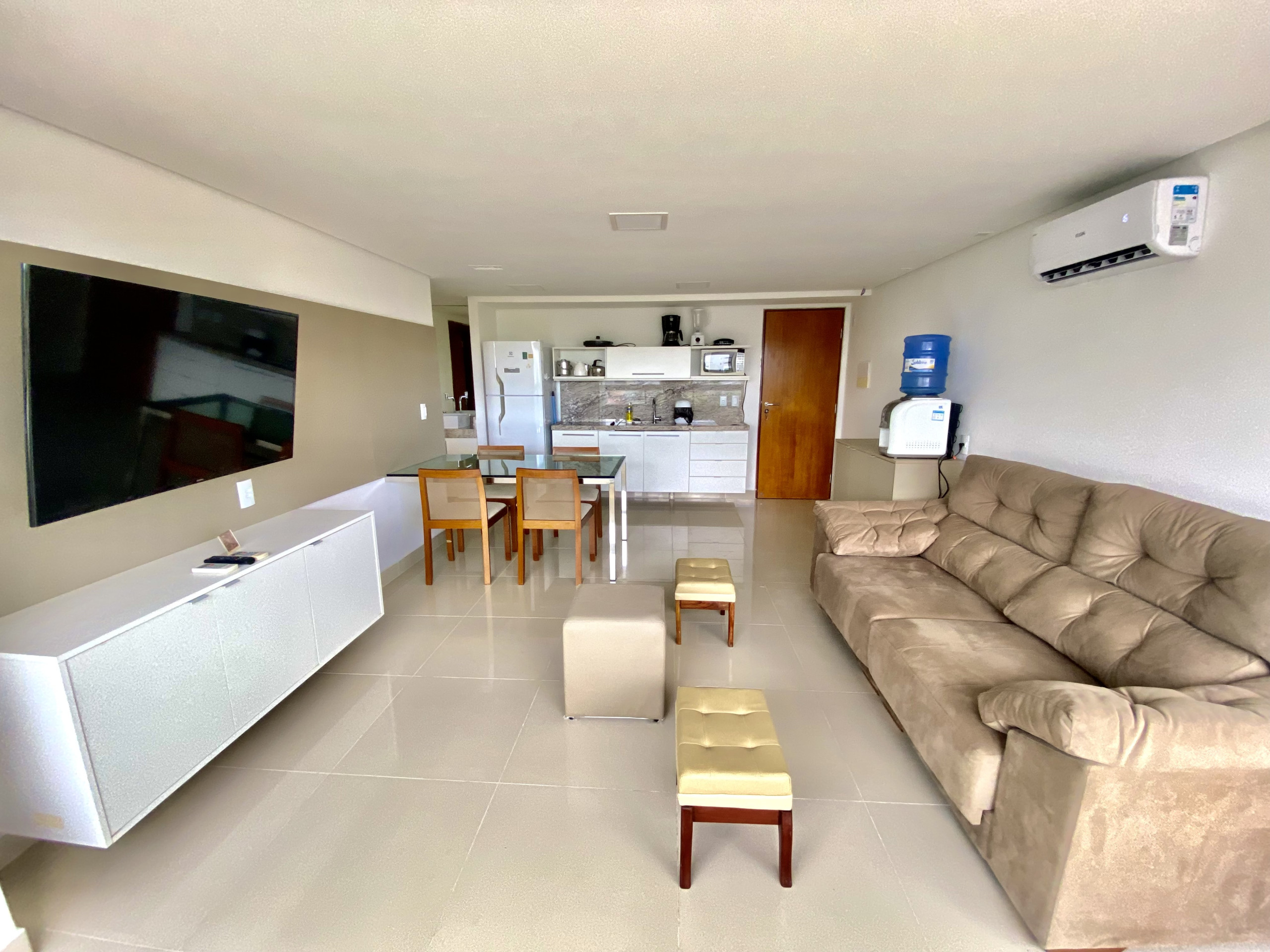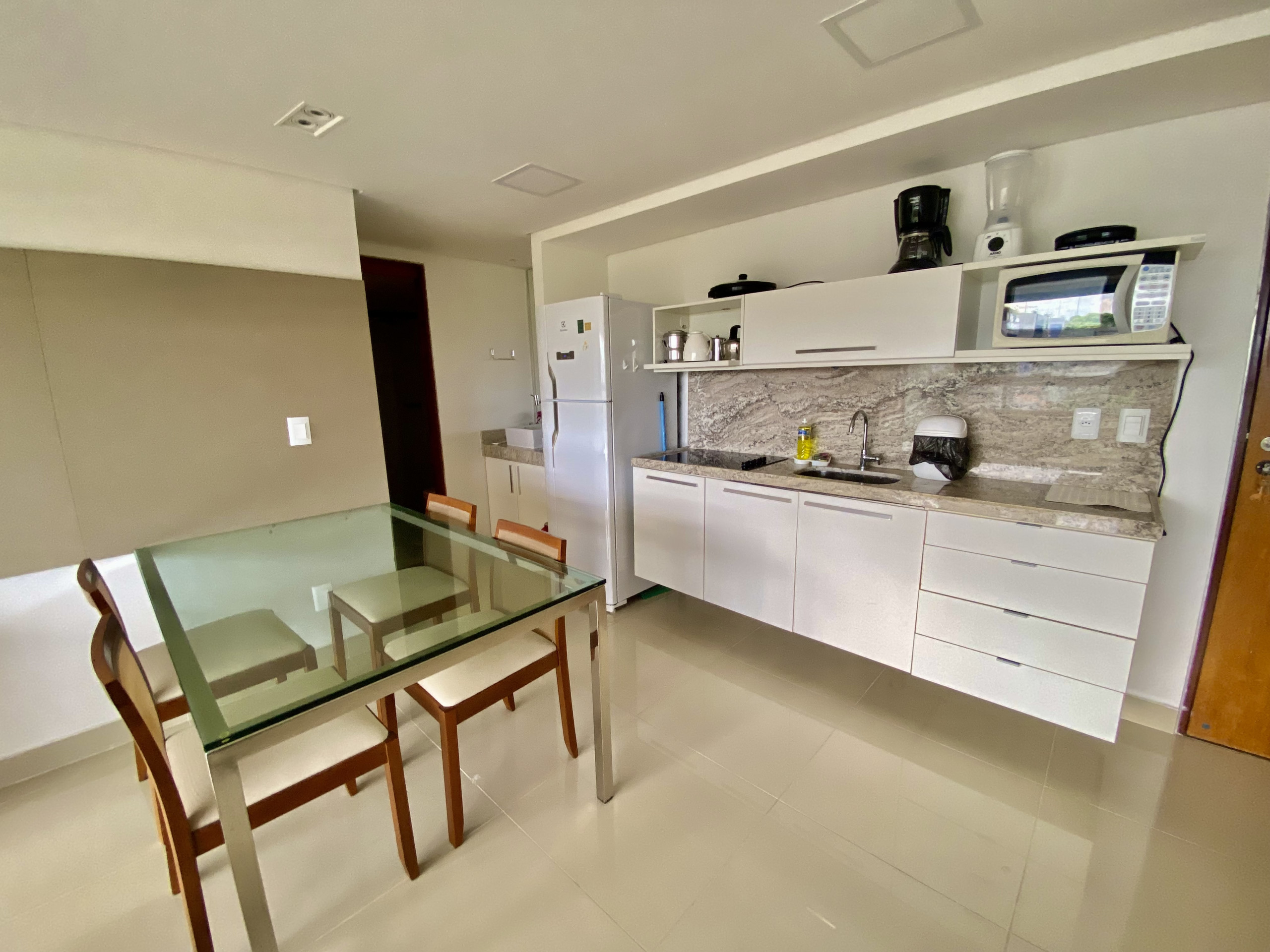 A cozinha americana, totalmente equipada, inclui eletrodomésticos essenciais, como geladeira, cafeteira, torradeira e liquidificador, além de louças, talheres e utensílios de cozinha, proporcionando aos hóspedes a liberdade de preparar suas próprias refeições e desfrutar de uma estadia verdadeiramente confortável e acolhedora.