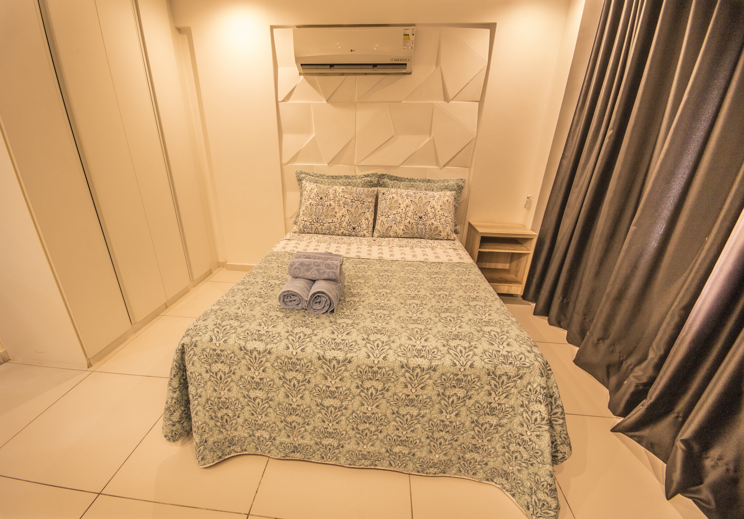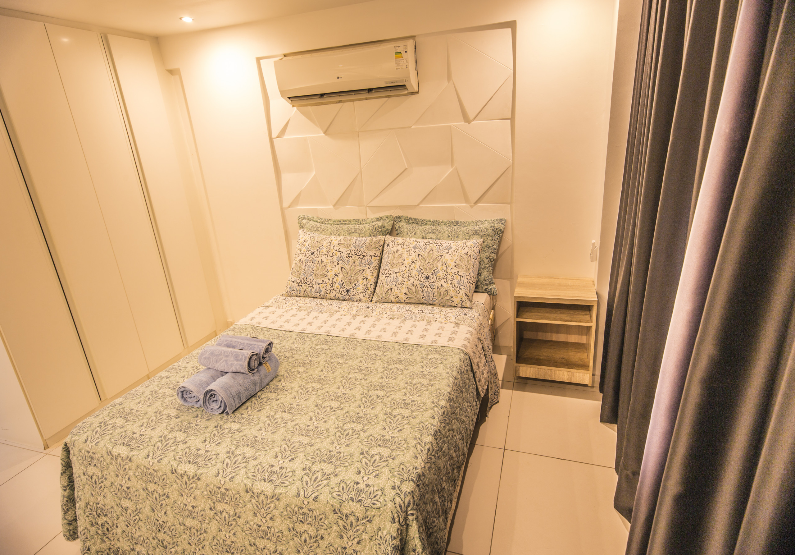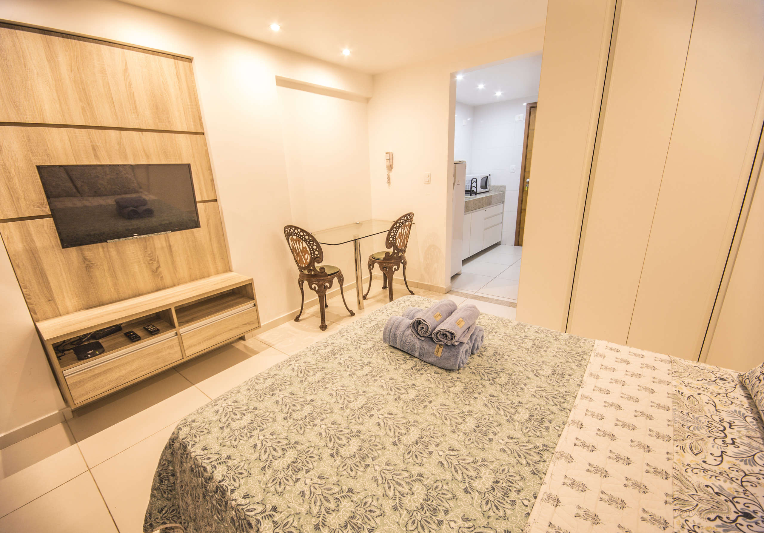 O Apart-hotel possui um Quarto sendo suíte(banheiro dentro do quarto), Cozinha equipada, Espaço de estar/ jantar. No Quarto tem uma Cama de Casal e Ar-condicionado, Banheiro com chuveiro de água quente, Cozinha com diversos utensílios de cozinha, Mesa com Cadeiras, Tv a Cabo no quarto, Internet Wi-Fi, Secador de cabelo, Ferro de passar.