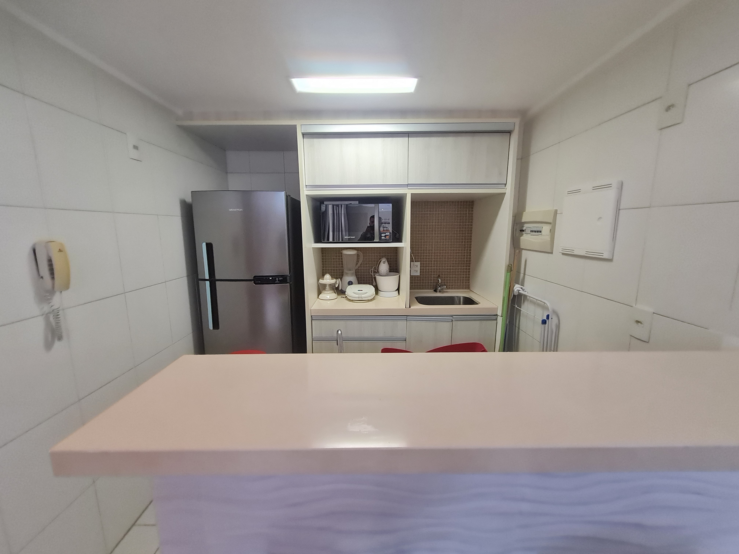 Possui dois Quartos sendo um Suíte (banheiro dentro do quarto) e um Quarto social, Banheiro social, Cozinha equipada com utensílios de cozinha, Sala de estar, Sala de jantar e duas Sacadas. No Quarto Suite tem uma cama de casal e ar-condicionado e no Quarto Social tem um Beliche (duas camas solteiro) e ar-condicionado, Banheiros com chuveiro de água quente, Cozinha com diversos utensílios de cozinha, Sala com sofá e ar-condicionado, Tv a Cabo na sala e quarto suite, Internet Wi-Fi, Secador de cabelo, Ferro de passar, Rede e uma bela Varanda com Vista para a Praia.