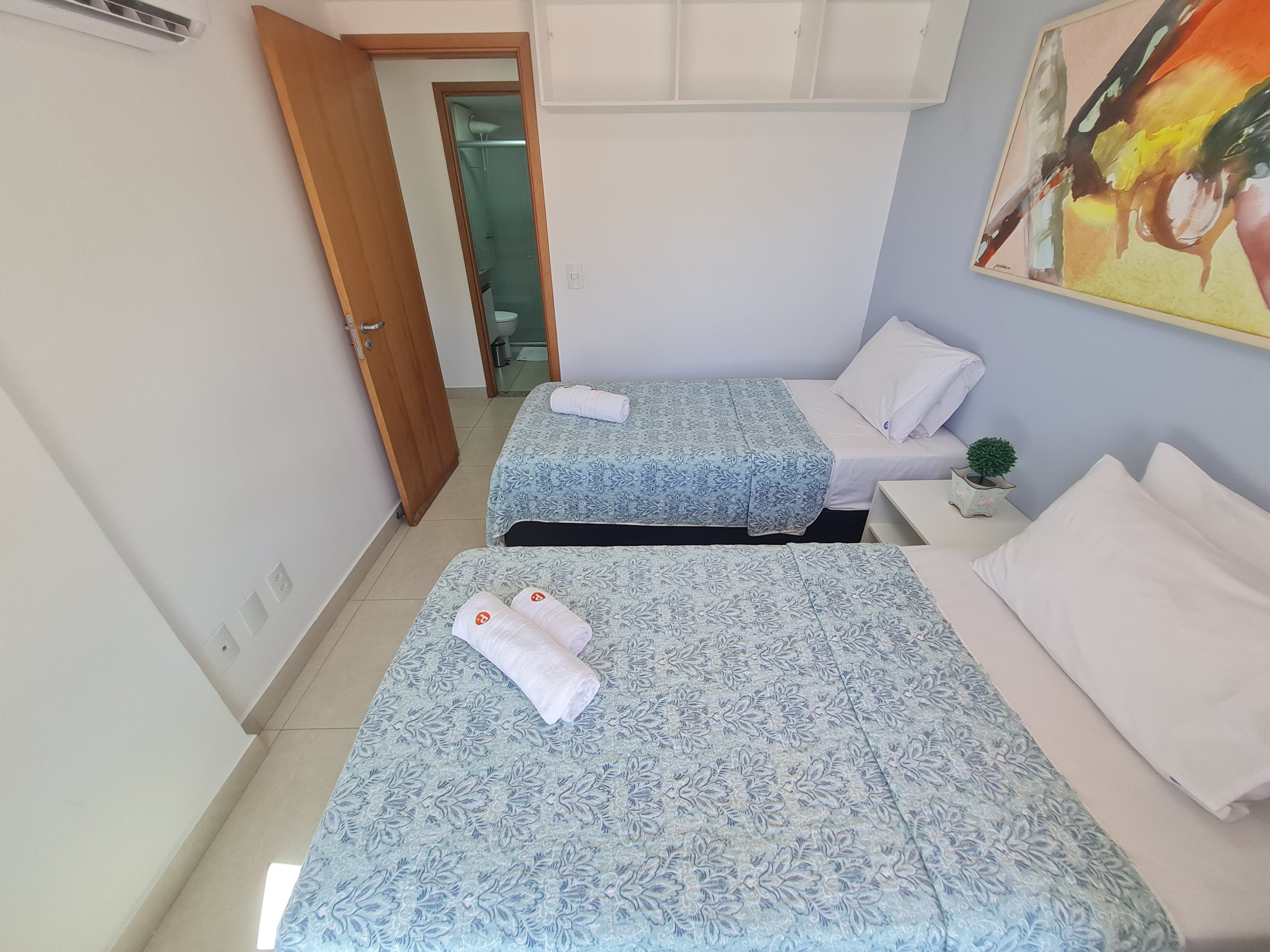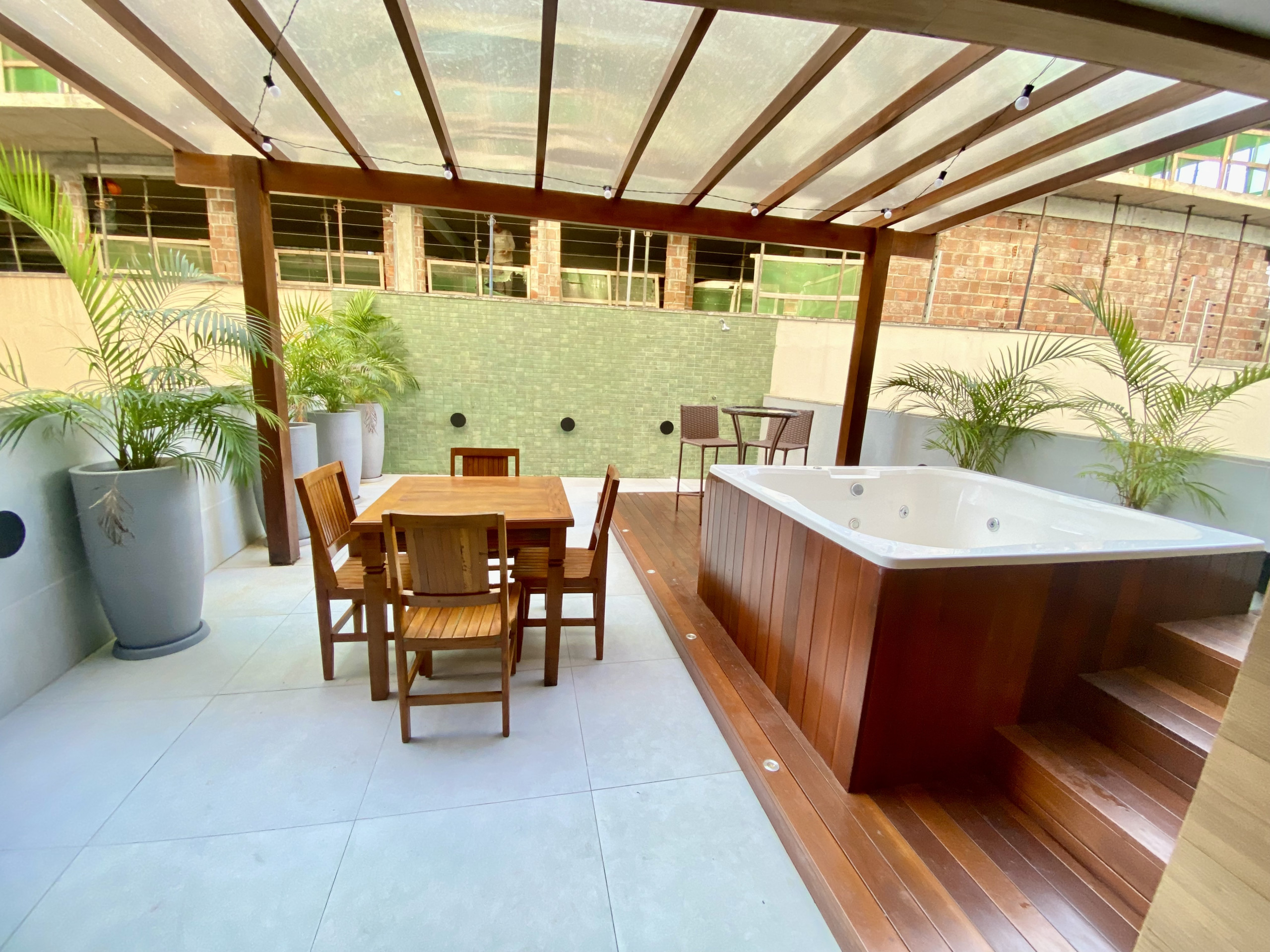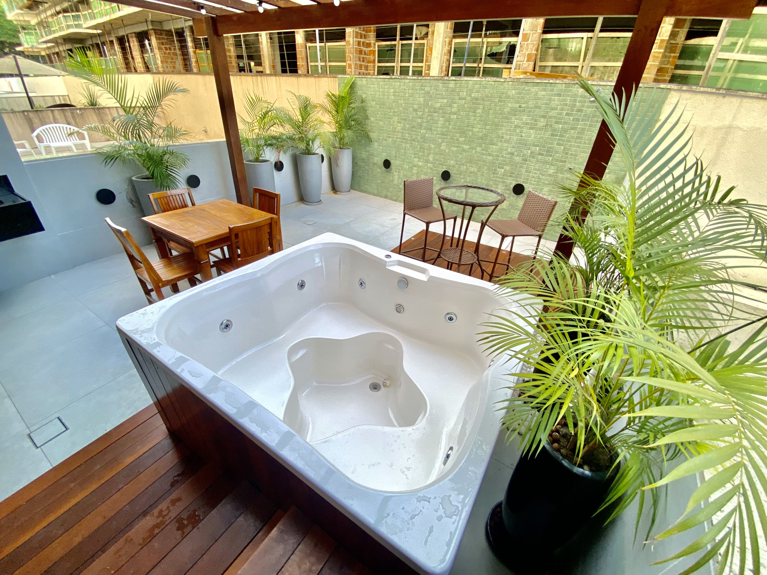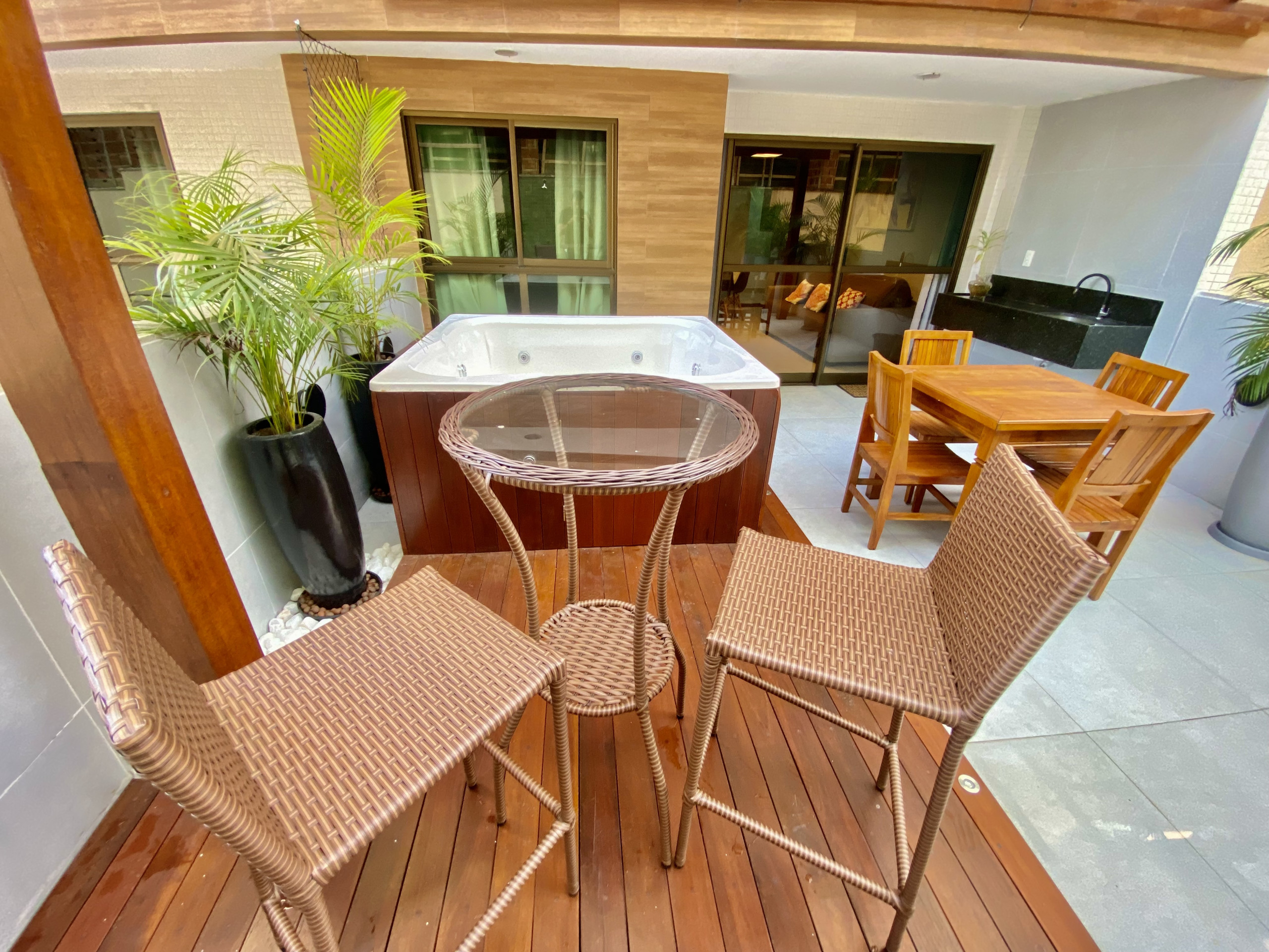 Na parte exterior possui um terraço com JACUZZI e área gourmet, na parte interna o apto tem dois Quartos sendo um Suíte (banheiro dentro do quarto) e um Quarto social, Banheiro social, Cozinha equipada com utensílios de cozinha, Sala de estar/jantar e uma Sacada com terraço. No Quarto Suíte tem cama de casal e ar-condicionado e no Quarto Social tem 2 camas de solteiro e ar-condicionado, Banheiros com chuveiro de água quente, Cozinha com diversos utensílios de cozinha, Sala com sofá e ar-condicionado, Tv a Cabo na Sala e Quarto Suíte, Internet Wi-Fi, Secador de cabelo, Ferro de passar e um belo terraço para lazer com mesa e cadeiras de exterior.