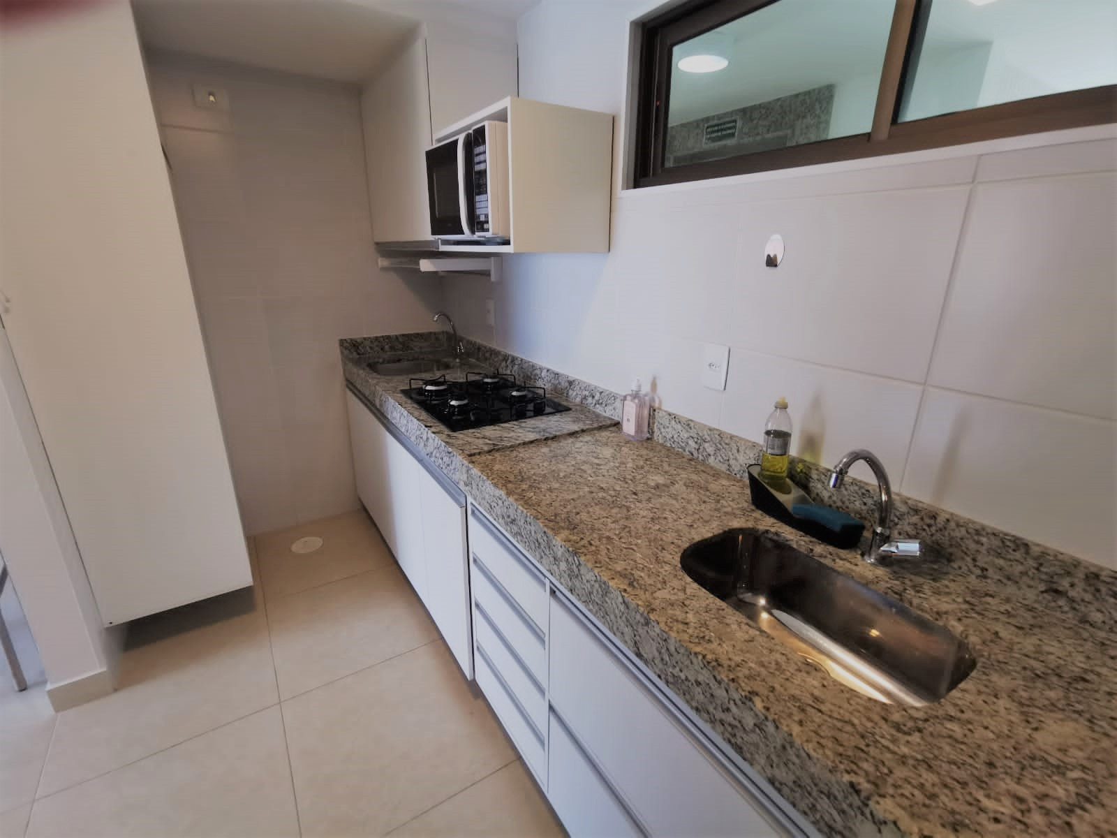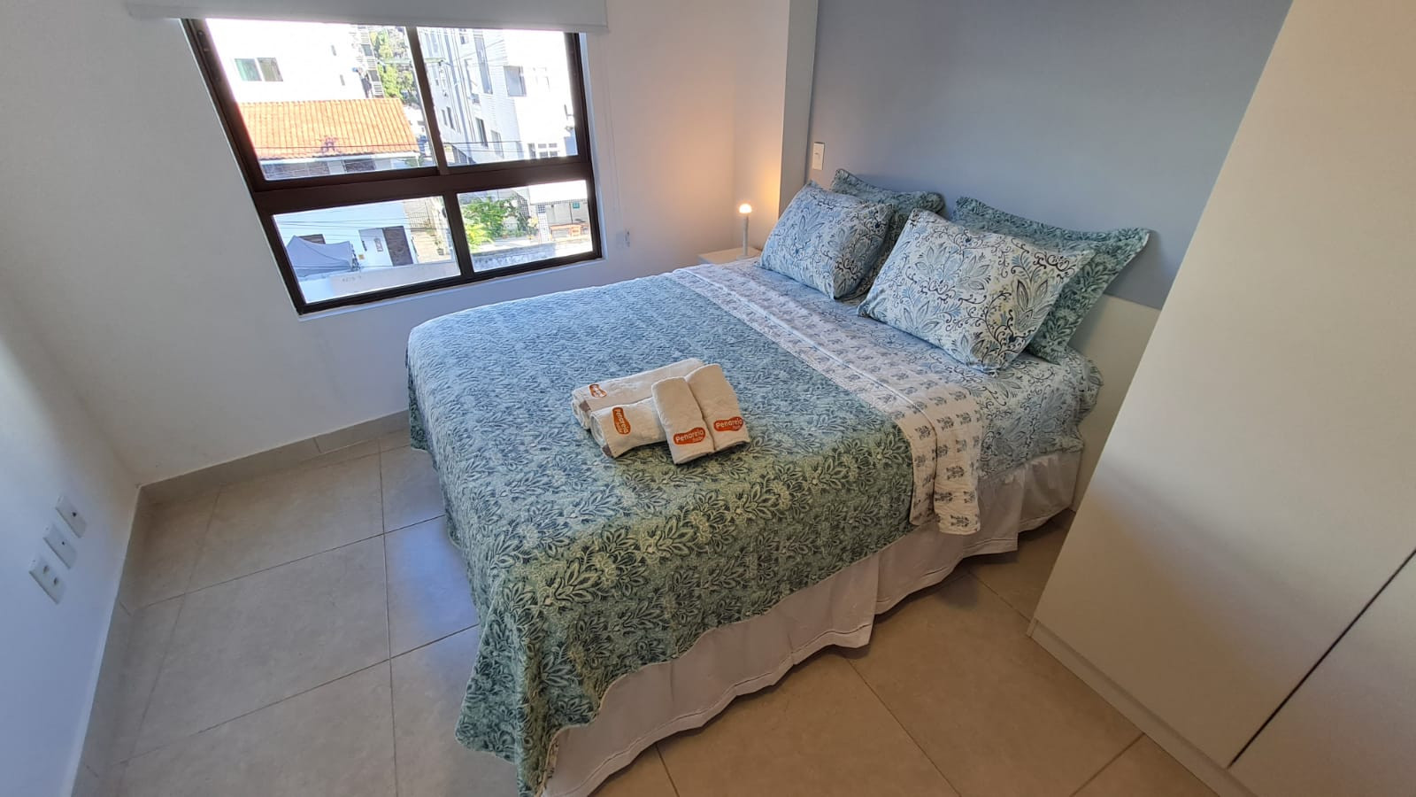 Possui dois Quartos sendo um Suíte (banheiro dentro do quarto) e um Quarto social, Banheiro social, Cozinha equipada com utensílios de cozinha, Sala de estar, Sala de jantar e uma Sacada. Nos dois Quartos cama de casal e ar-condicionado, Banheiros com chuveiro de água quente, Cozinha com diversos utensílios de cozinha, Sala com sofá-cama e ventilador, Tv a Cabo na sala, Internet Wi-Fi, Secador de cabelo, Ferro de passar e uma bela Varanda com Vista para a Praia.