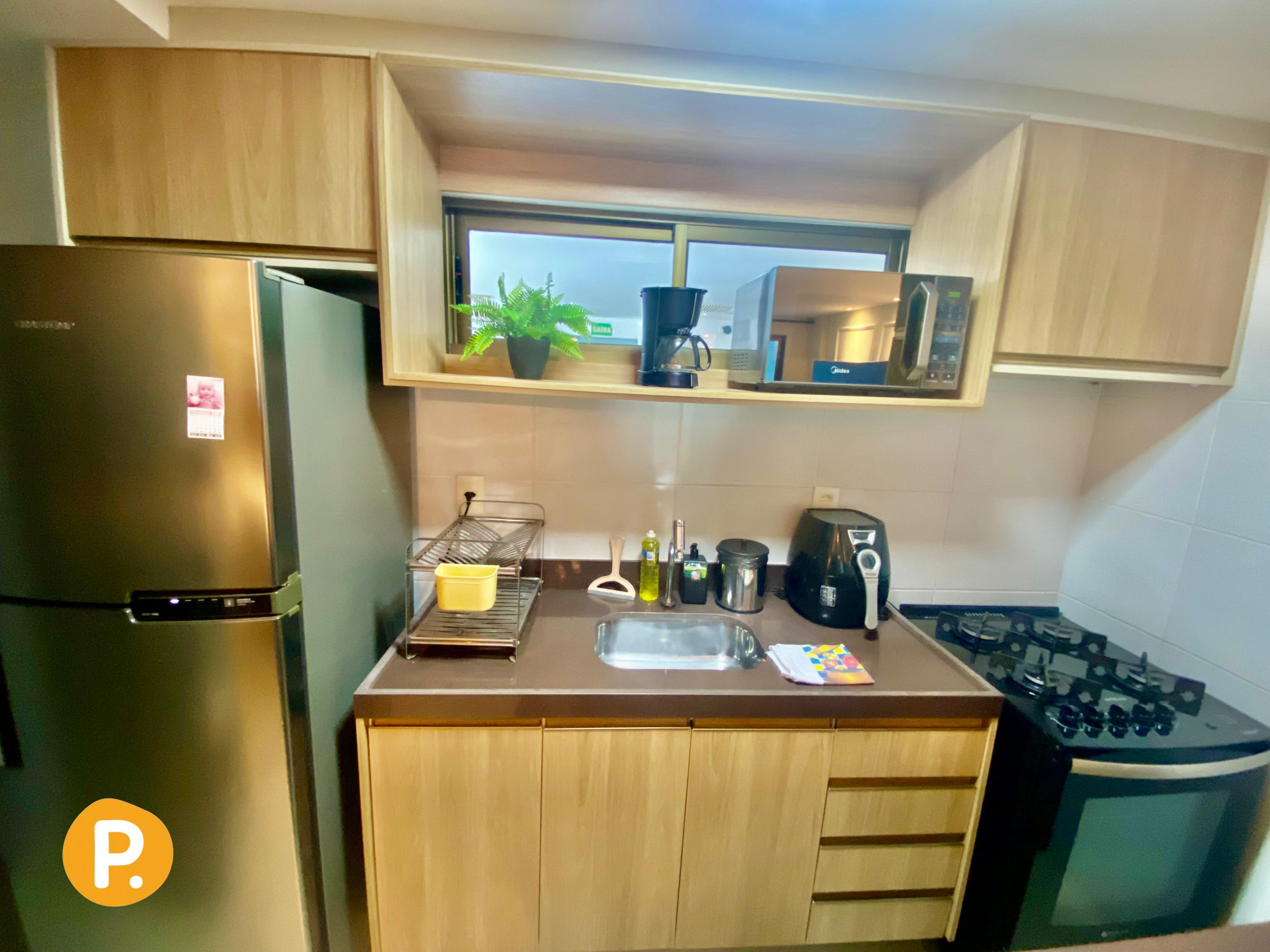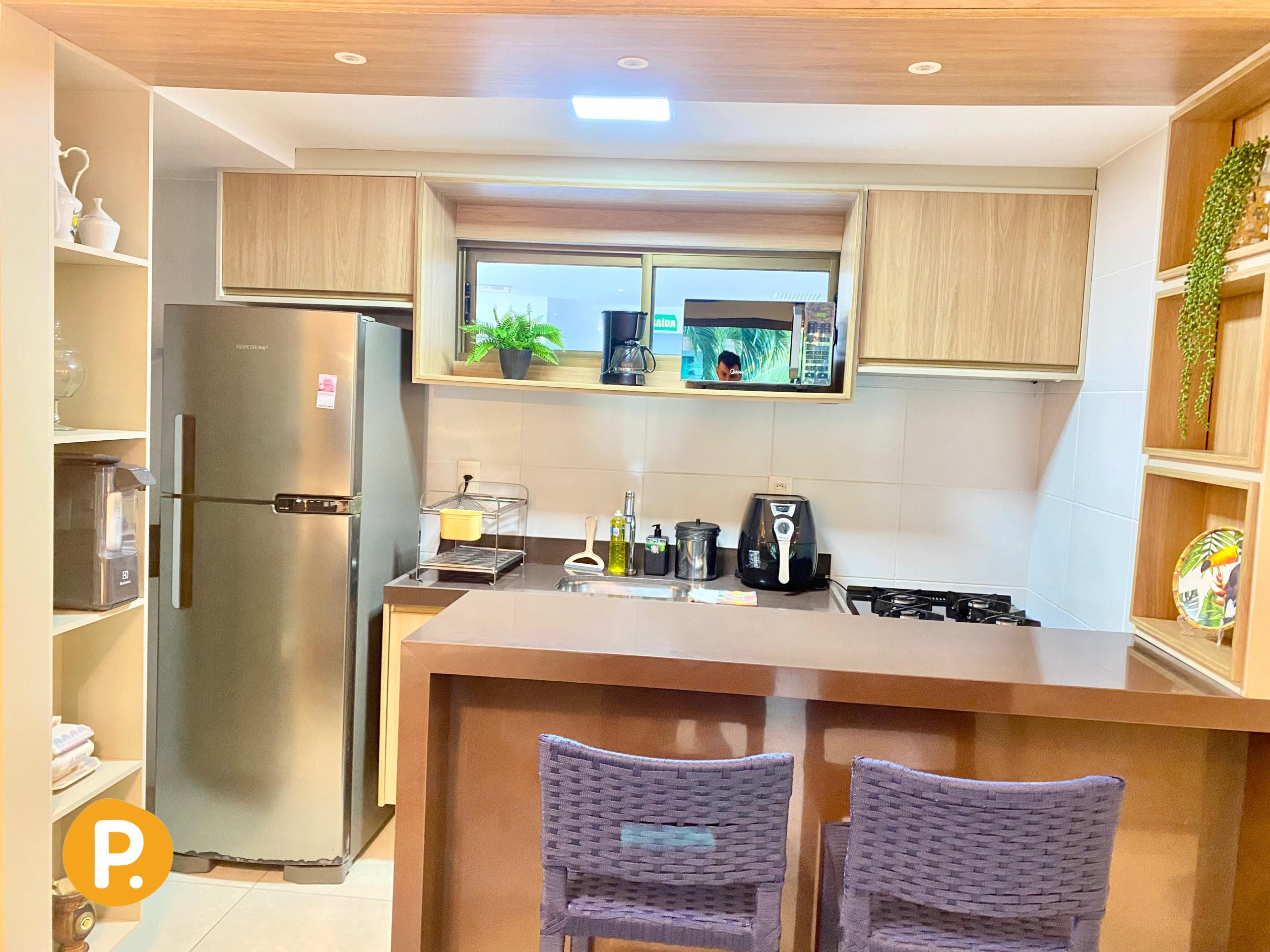 A cozinha americana totalmente equipada é um verdadeiro destaque, com eletrodomésticos modernos como geladeira, freezer, máquina de café, fritadeira, micro-ondas, além de utensílios completos para preparar refeições deliciosas. Perfeita para quem gosta de cozinhar e desfrutar de momentos em família.