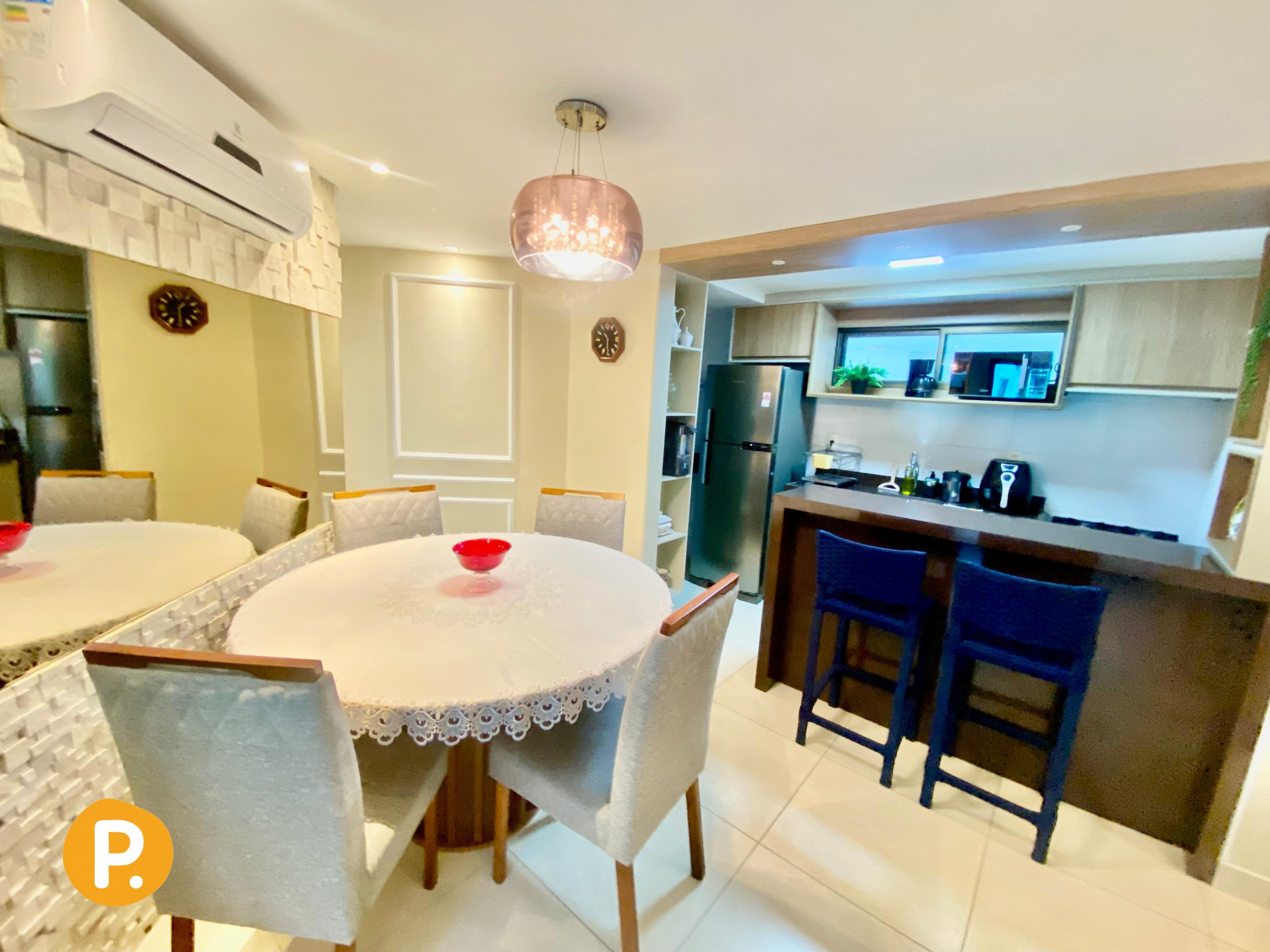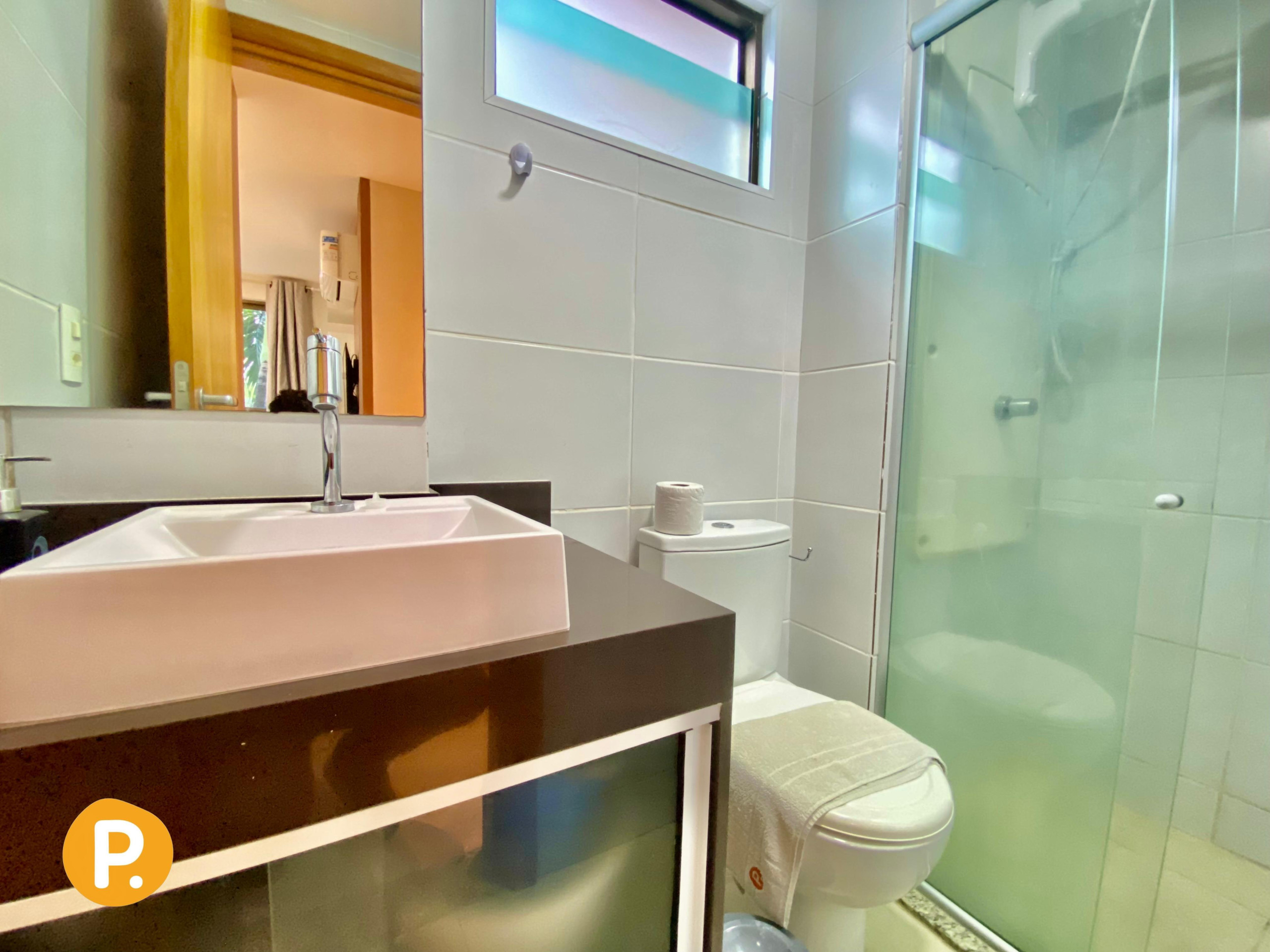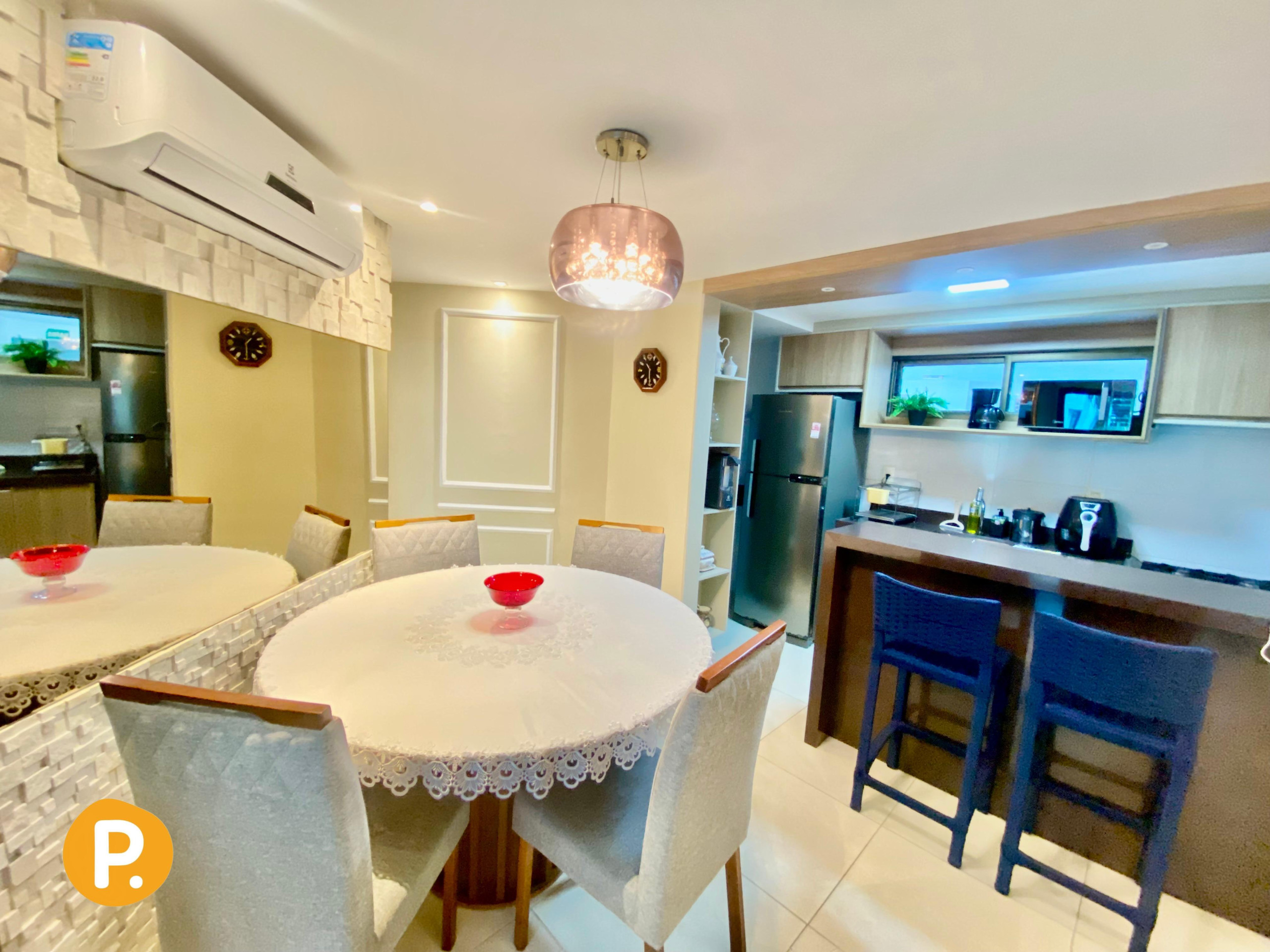 O apartamento dispõe de dois banheiros, ambos com chuveiro, facilitando a rotina de todos os hóspedes. A climatização é garantida por ar-condicionado em todos os ambientes, proporcionando conforto em qualquer época do ano.