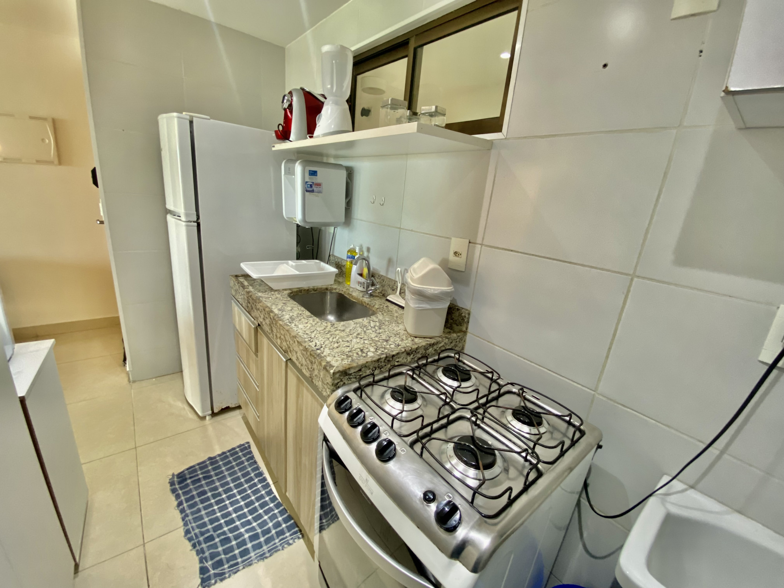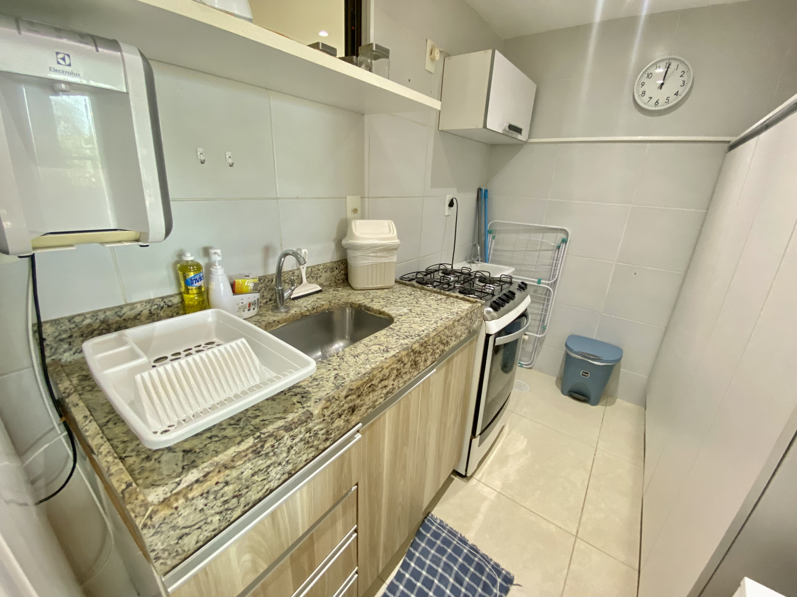 A cozinha em estilo americano, aberta para a sala, é abastecida com equipamentos a gás, incluindo geladeira, micro-ondas e congelador. Além disso, a cozinha está completa com louças, talheres, utensílios diversos, cafeteira e liquidificador, proporcionando todas as comodidades necessárias para preparar e desfrutar de refeições no local.