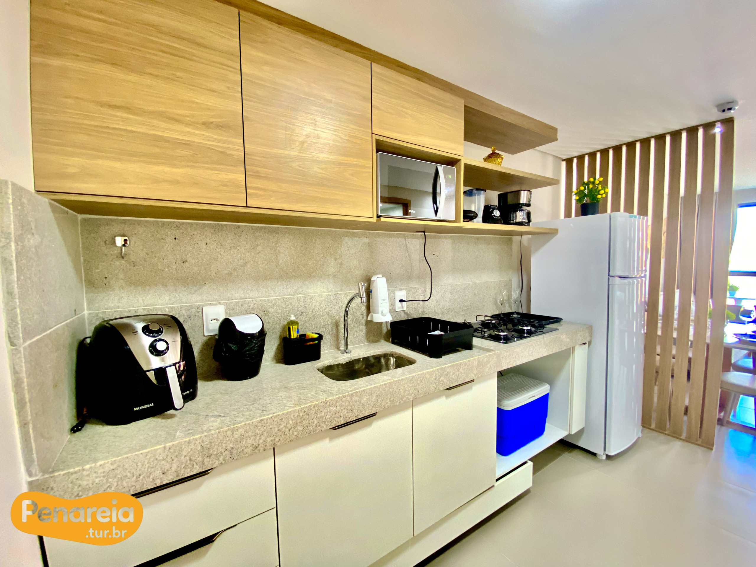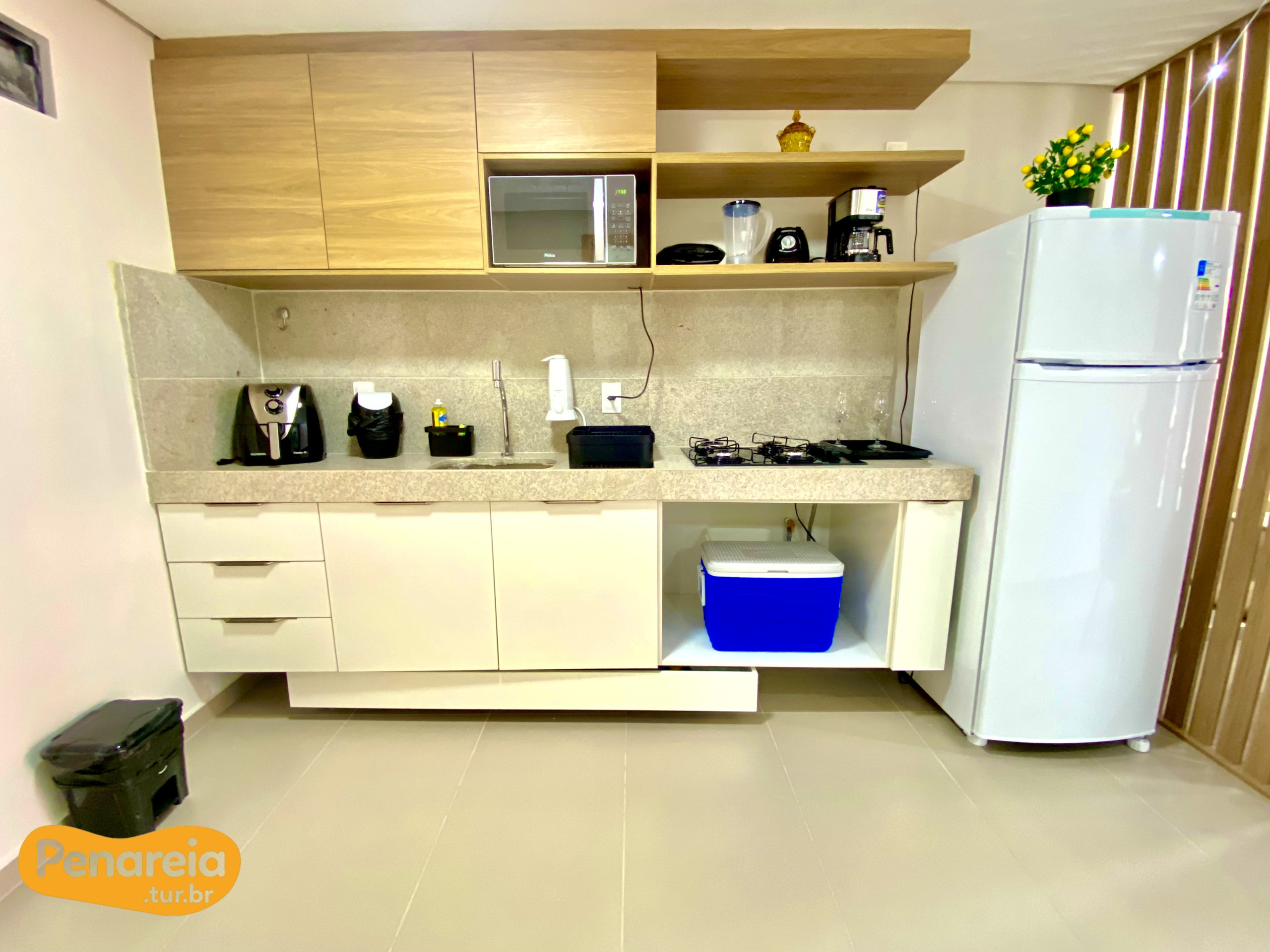 A cozinha americana, equipada com fogão a gás, inclui geladeira, micro-ondas, congelador, louça e talheres, utensílios de cozinha, cafeteira e liquidificador, proporcionando todo o necessário para uma estadia confortável.