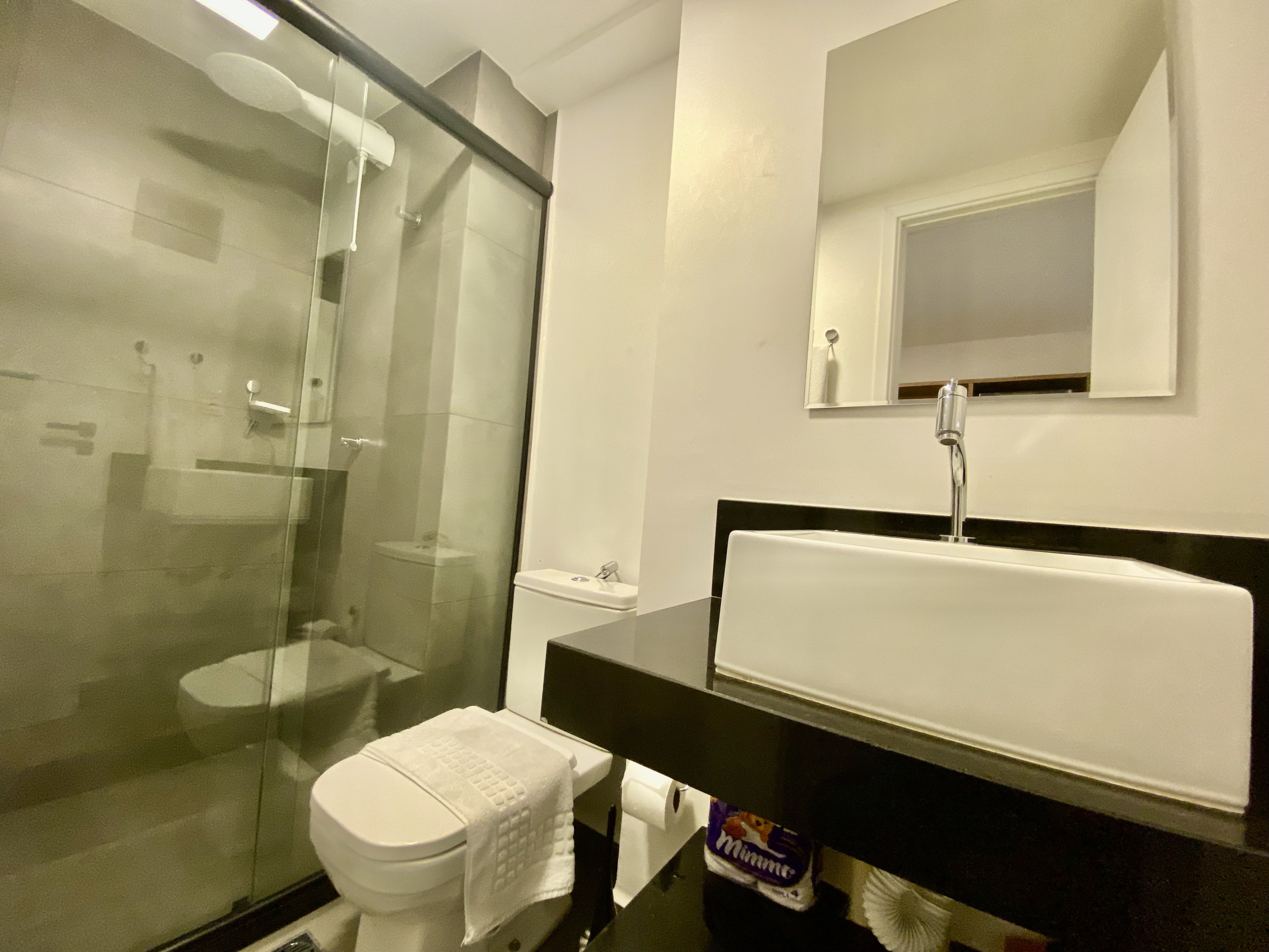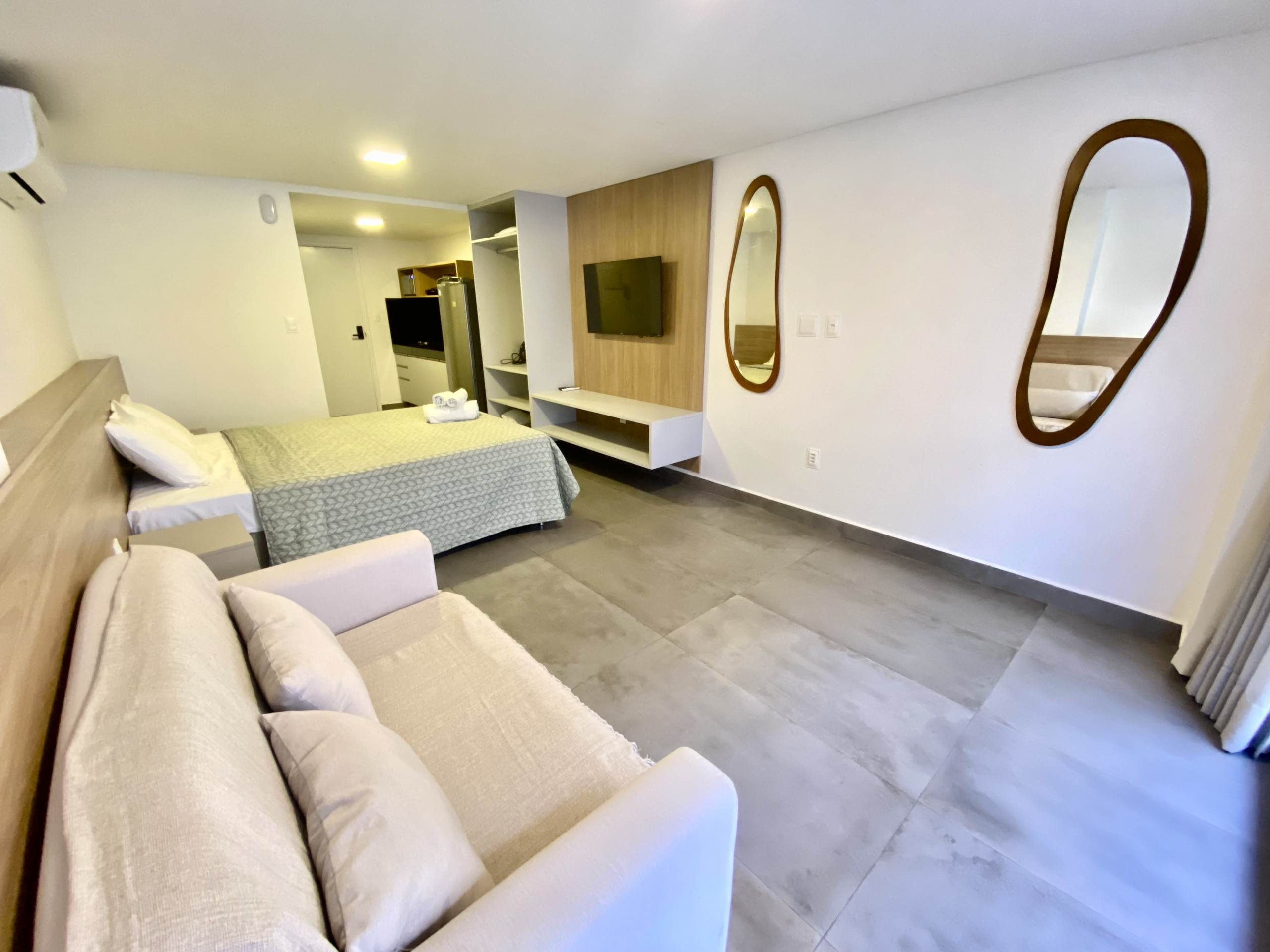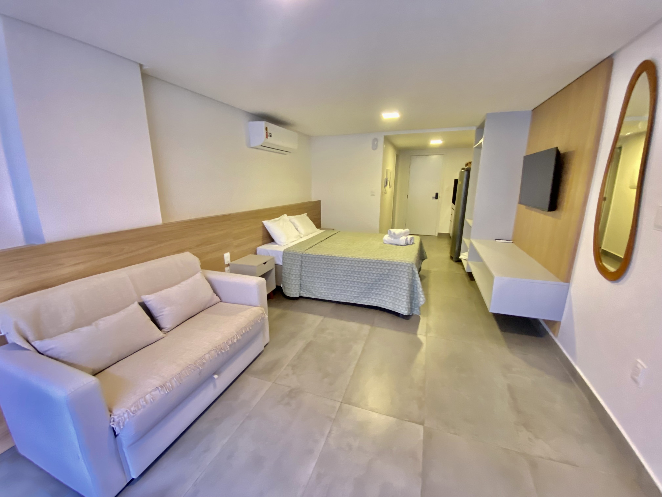 O apartamento studio com cama casal e sofá-cama possui cozinha equipada com utensílios de cozinha, sala de estar/jantar. O ambiente é climatizado por ar-condicionado. O banheiro com chuveiro de água quente. A Internet Wi-Fi, Secador de cabelo, Ferro de passar serão disponibilizados.