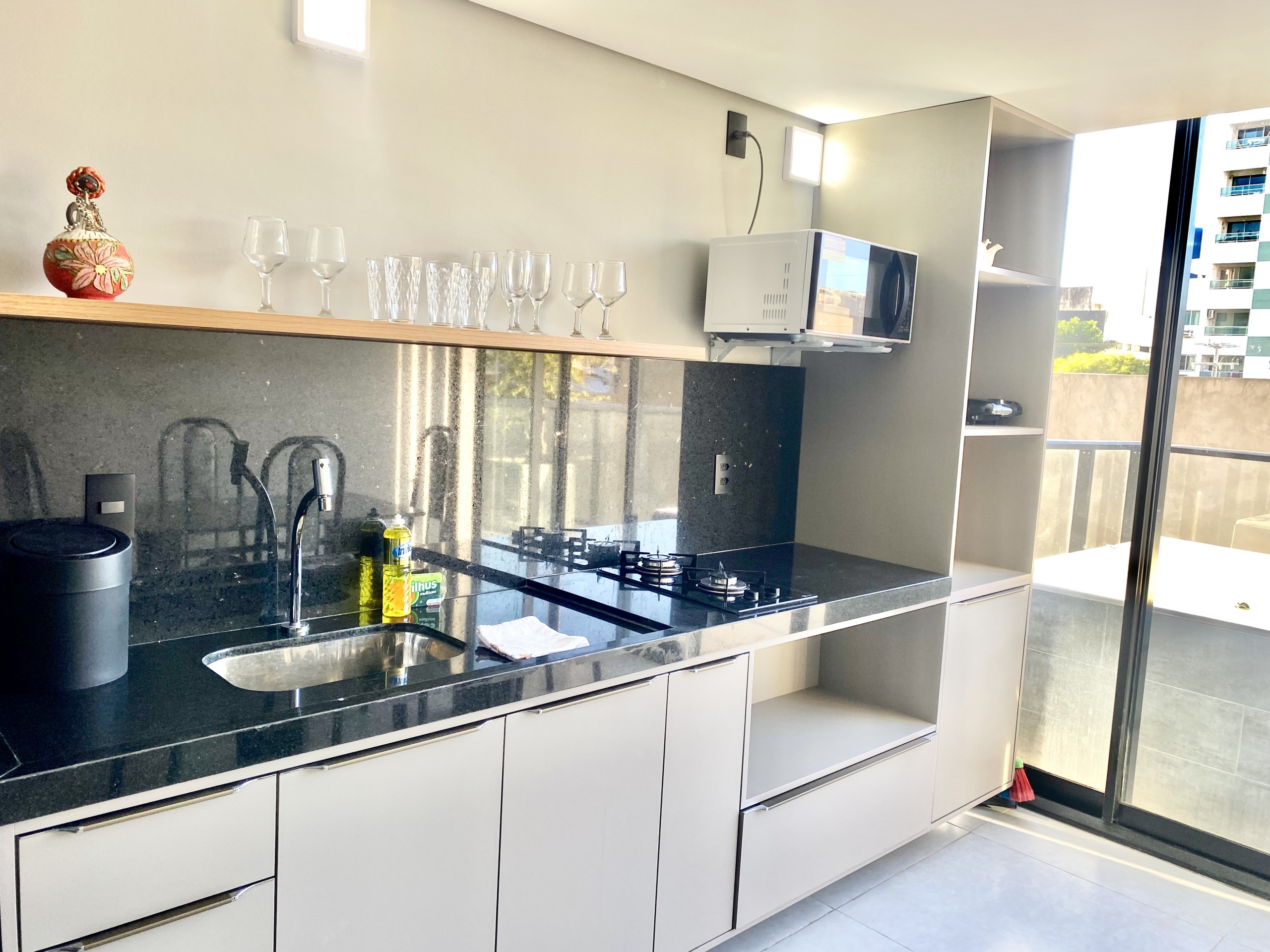 A cozinha americana, de gás, está equipada com geladeira, micro-ondas, congelador, louça/talheres, utensílios/cozinha, cafeteira e liquidificador.