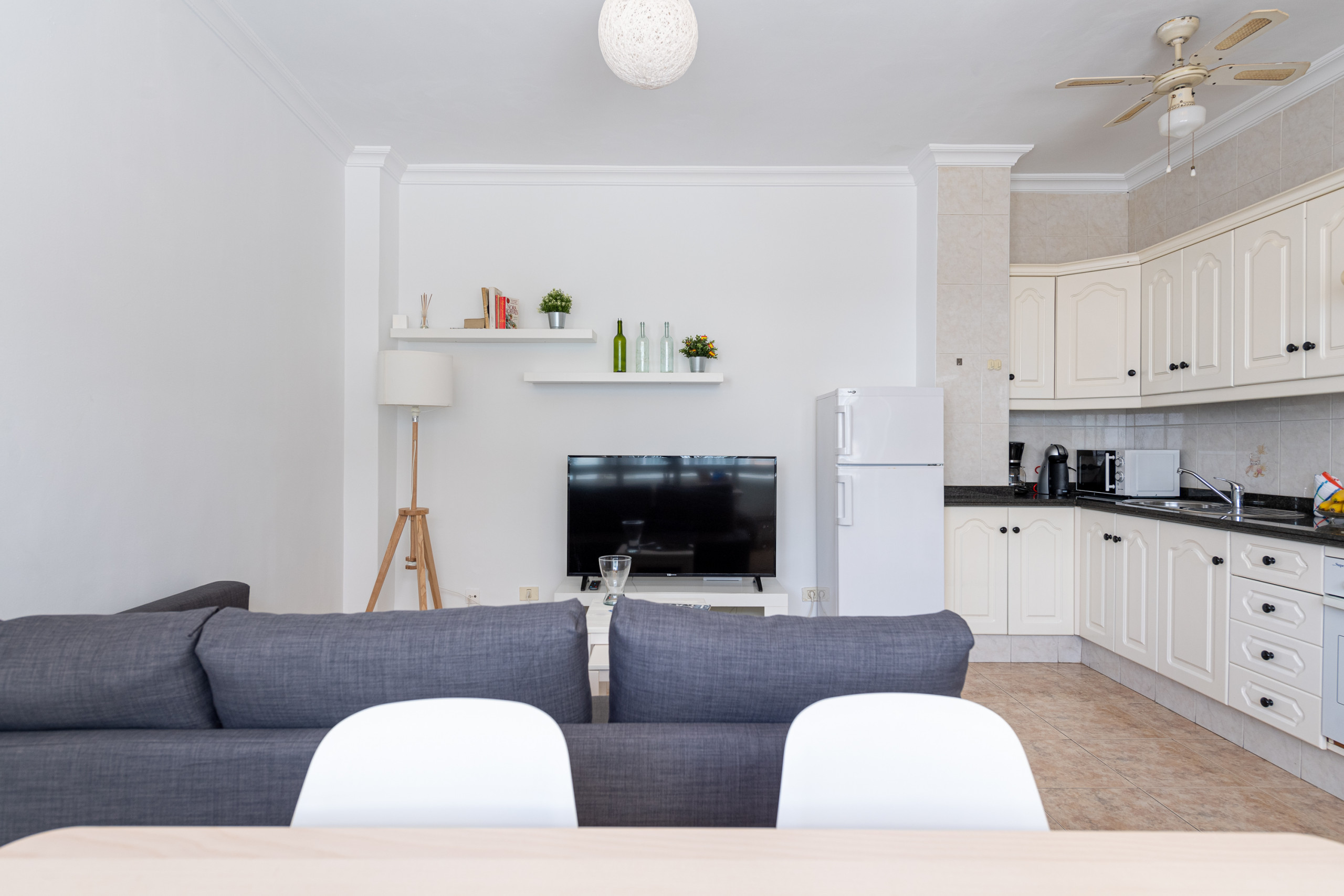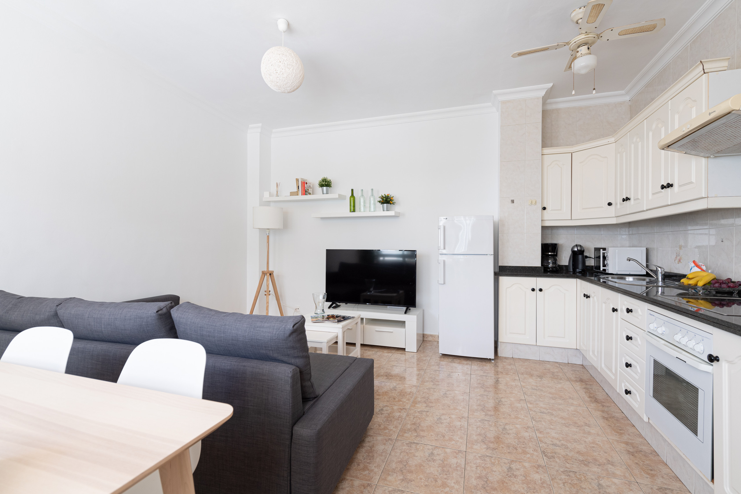 A cozinha americana, de vitrocerâmica, está equipada com geladeira, micro-ondas, forno, congelador, louça/talheres, utensílios/cozinha, cafeteira, torradeira, jarro elétrico e liquidificador.
