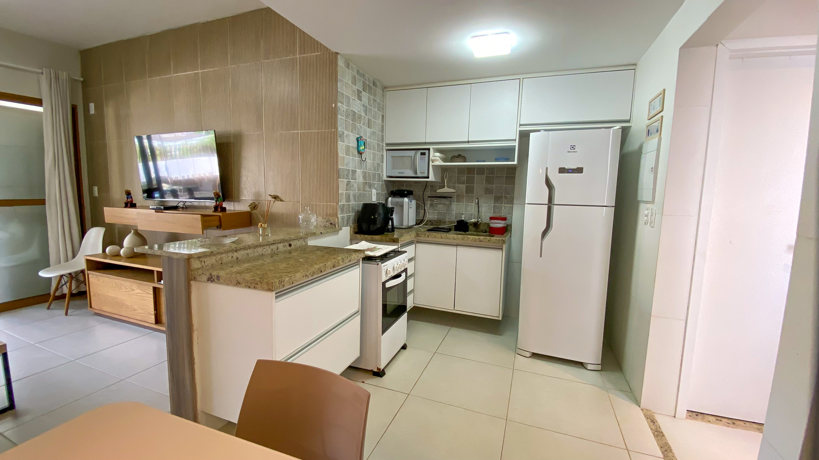 - Cozinha equipada com fogão, forno, geladeira, micro-ondas, liquidificador, cafeteira, fritadeira e utensílios completos(exceto óleo e sal)