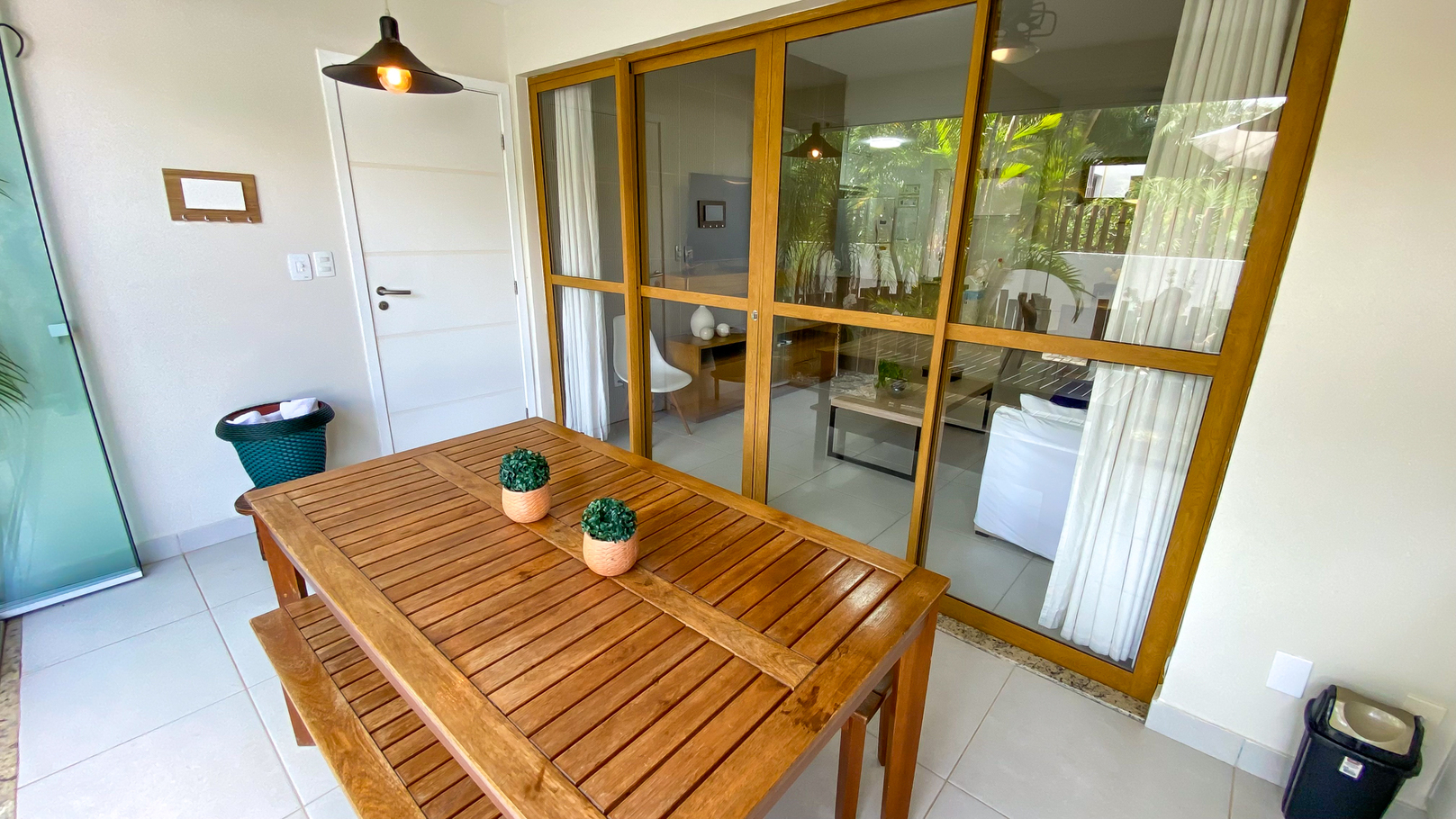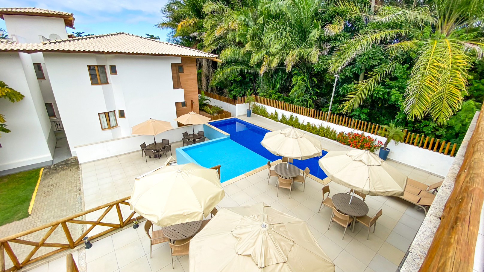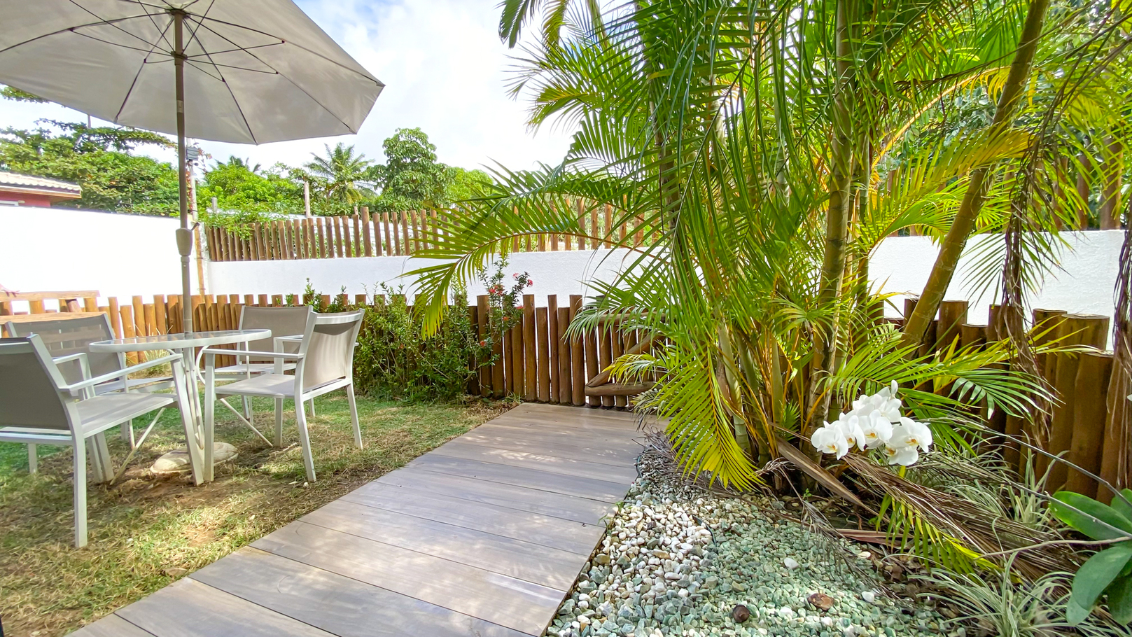 - Jardim térreo com mesas, cadeiras e ducha externa