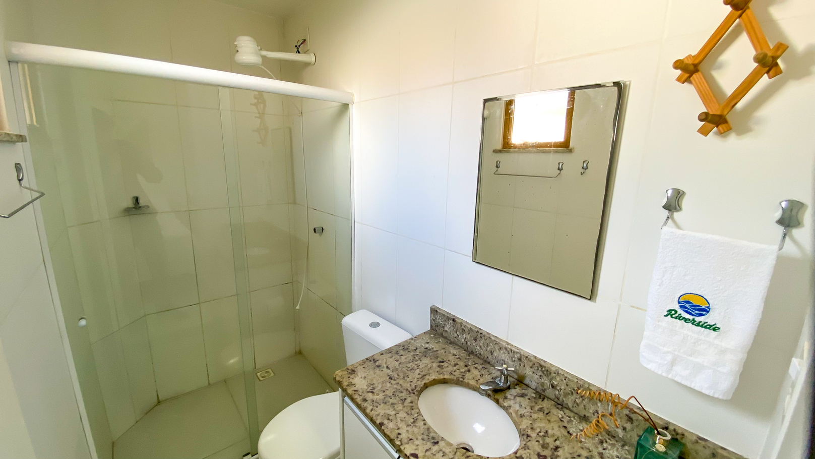 - Quarto 2 (suíte): 2 camas de solteiro e 1 colchão extra, ar-condicionado, armário e banheiro privativo com chuveiro elétrico, box de vidro/acrílico e secador