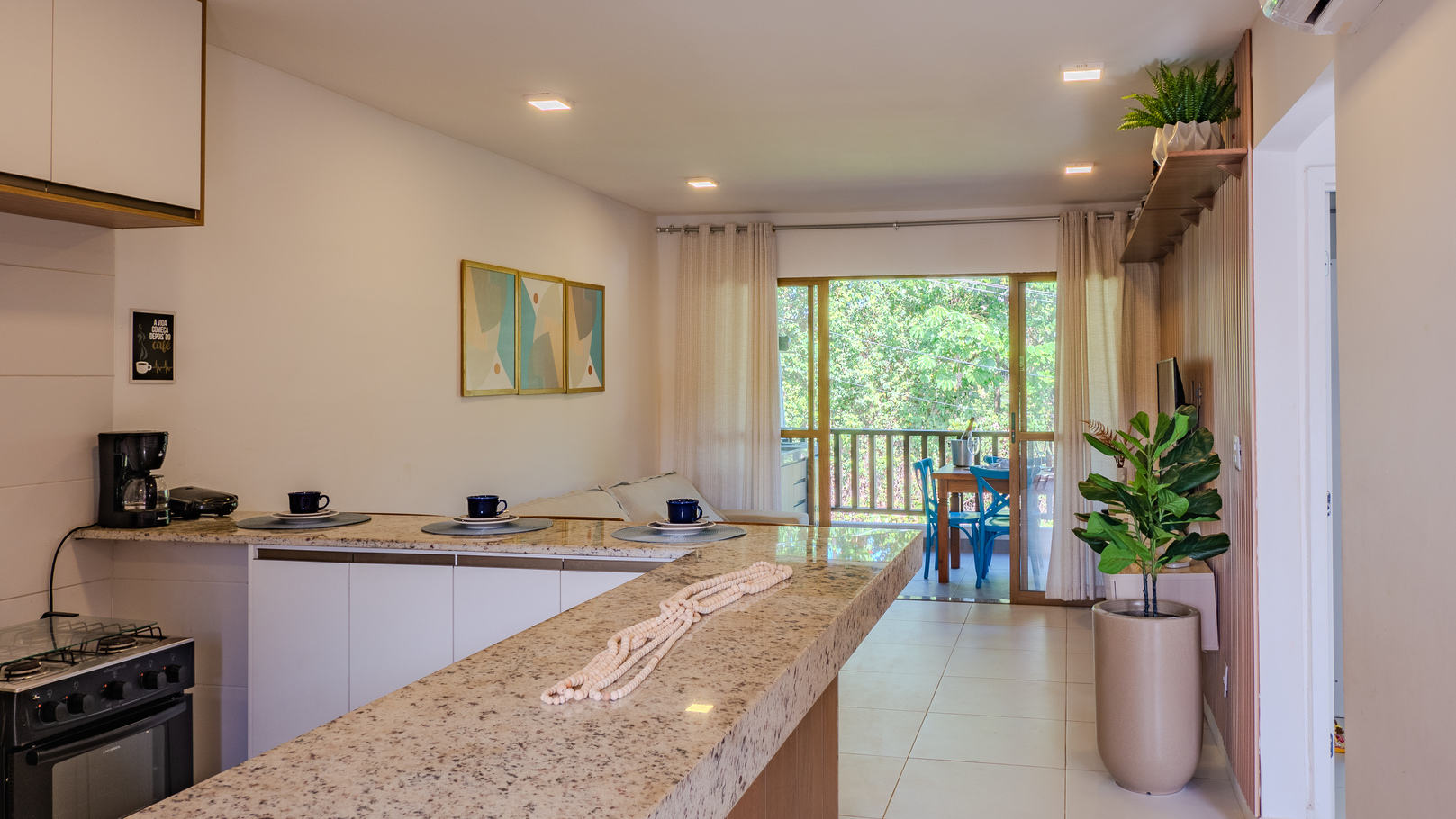 - Sala com ar-condicionado, sofá-cama, smart TV e mesa de jantar