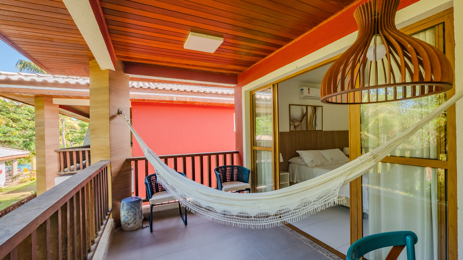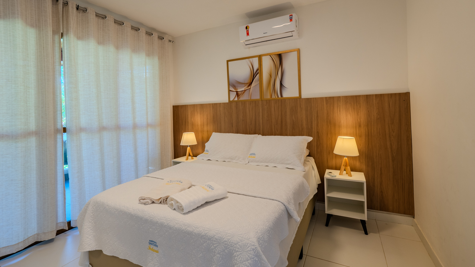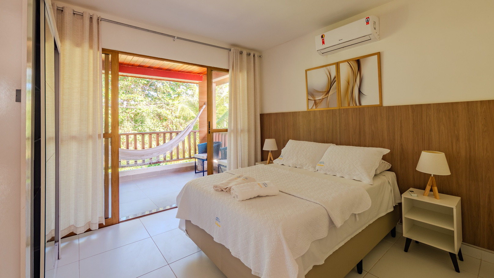 - Quarto 1 (suíte): cama de casal, ar-condicionado, armário, edredom e banheiro privativo com chuveiro elétrico, box de vidro/acrílico e secador de cabelo