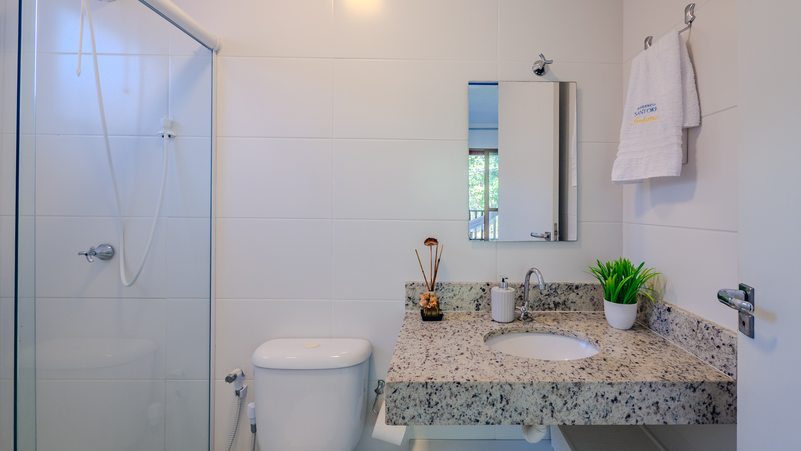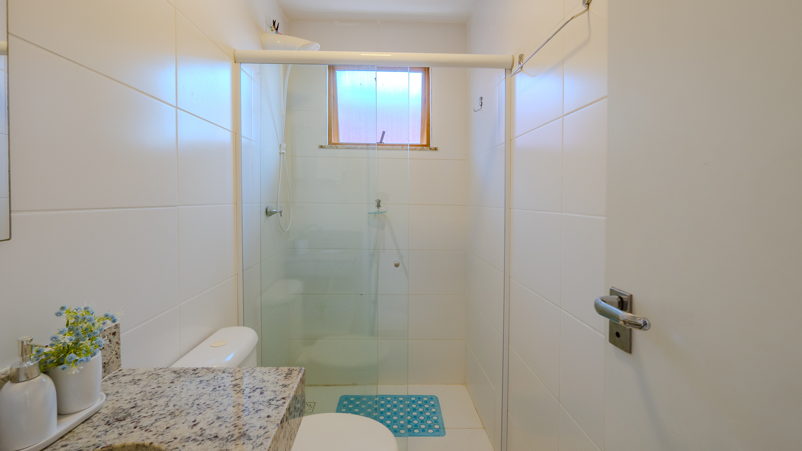 - Banheiro social com chuveiro elétrico e box de vidro