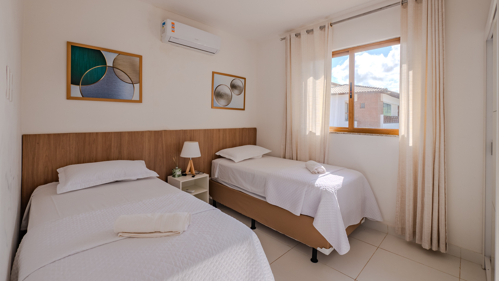 - Quarto 2: cama de solteiro e cama de solteiro, ar-condicionado, armário e edredom