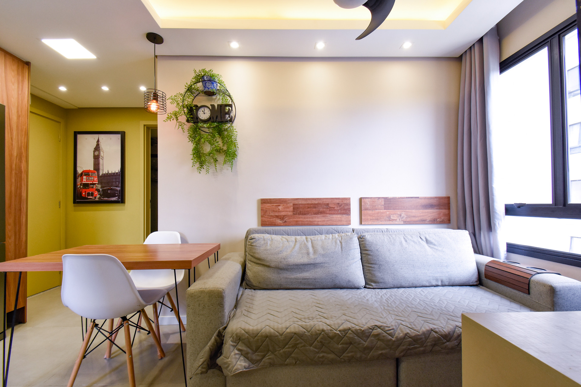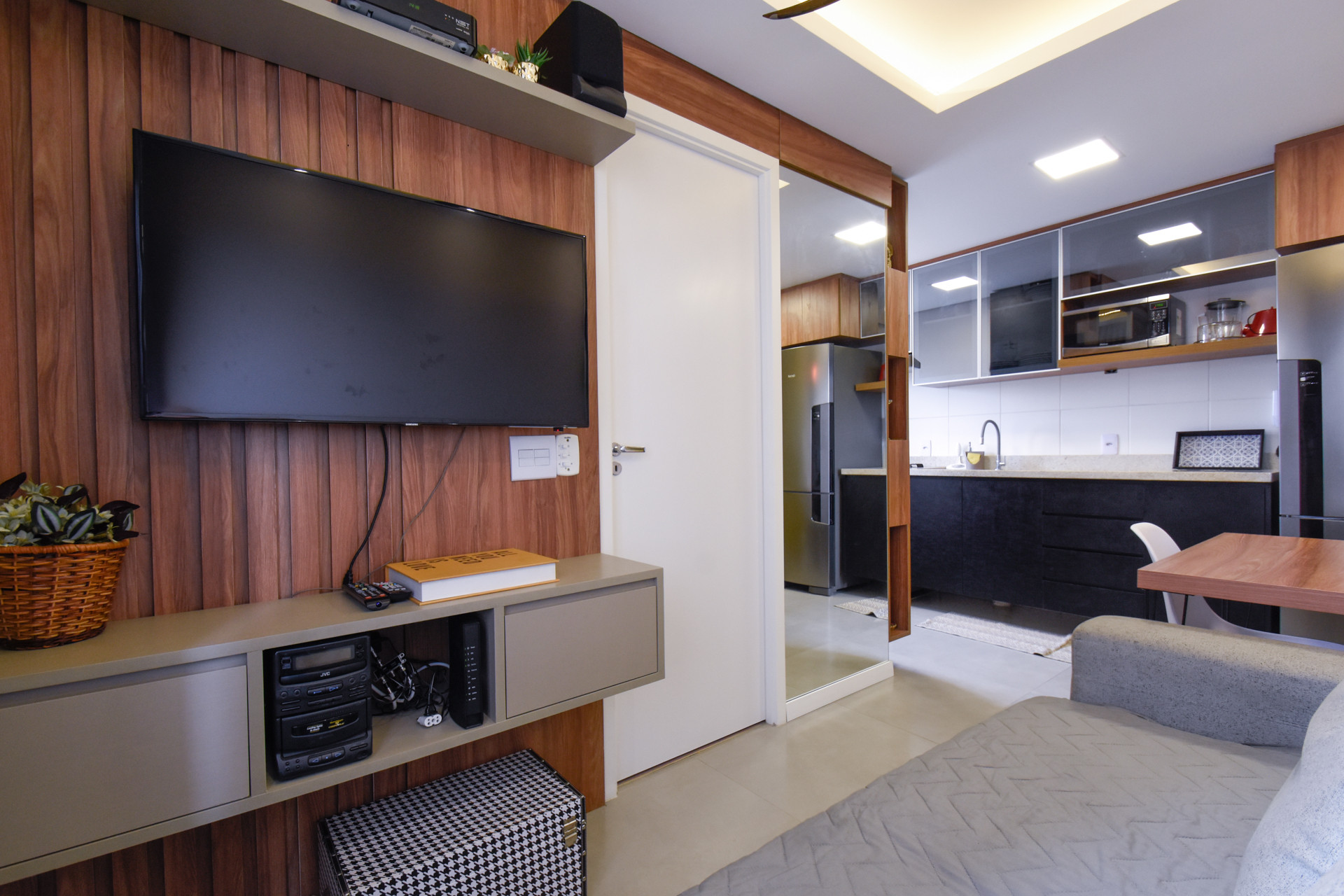 - A sala conta com sofá-cama, som e ventilador de teto