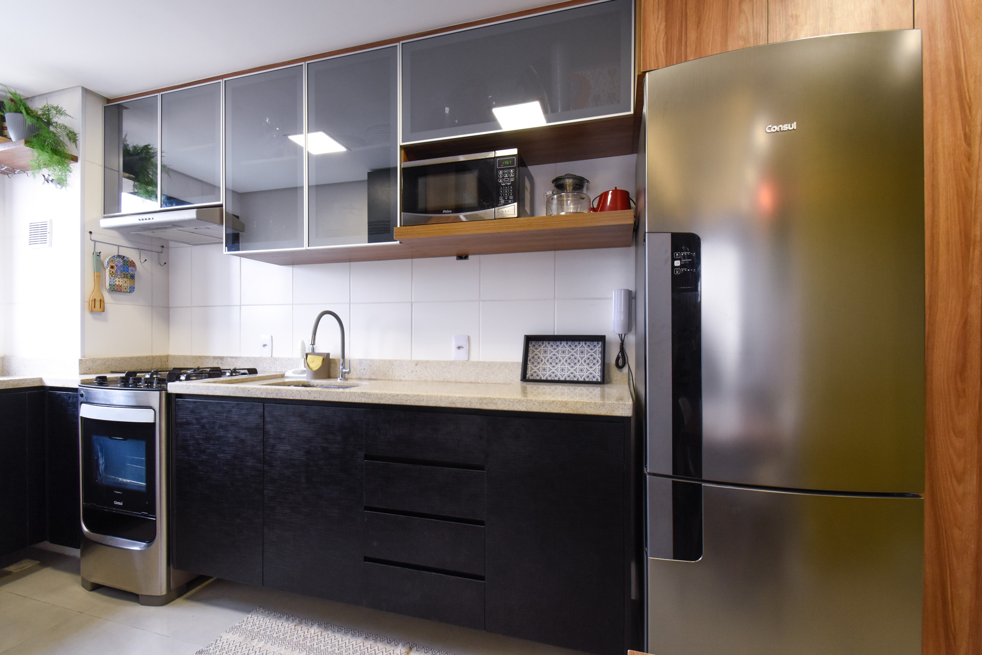 - Cozinha equipada com todos os utensílios necessários para suas refeições, incluindo fogão, geladeira, liquidificador, micro-ondas, torradeira, exaustor, balcão e mesa