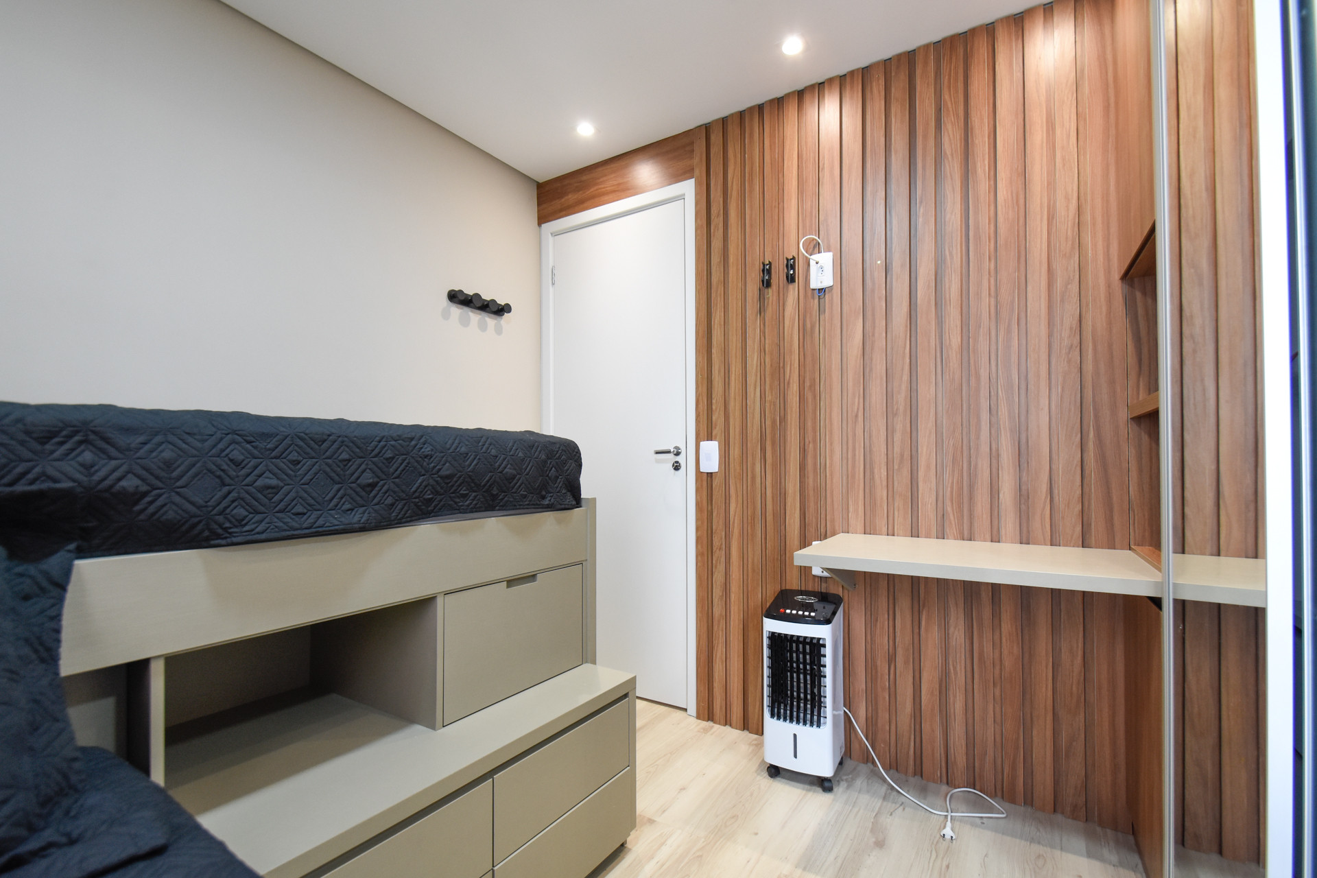 - Espaço home office com cadeira, escrivaninha e gavetas