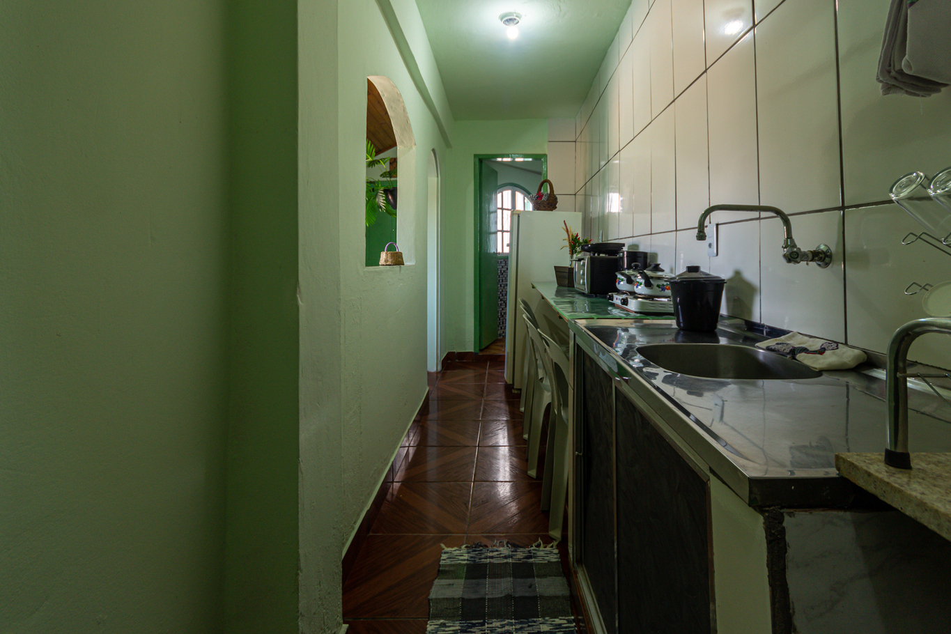 - Cozinha equipada com pratos, copos, panelas e pano de prato, além de eletrodomésticos como cafeteira, fogão elétrico 2 bocas, forno elétrico, geladeira com congelador interno, sanduicheira, forninho elétrico e utensílios de cozinha(exceto óleo e sal)