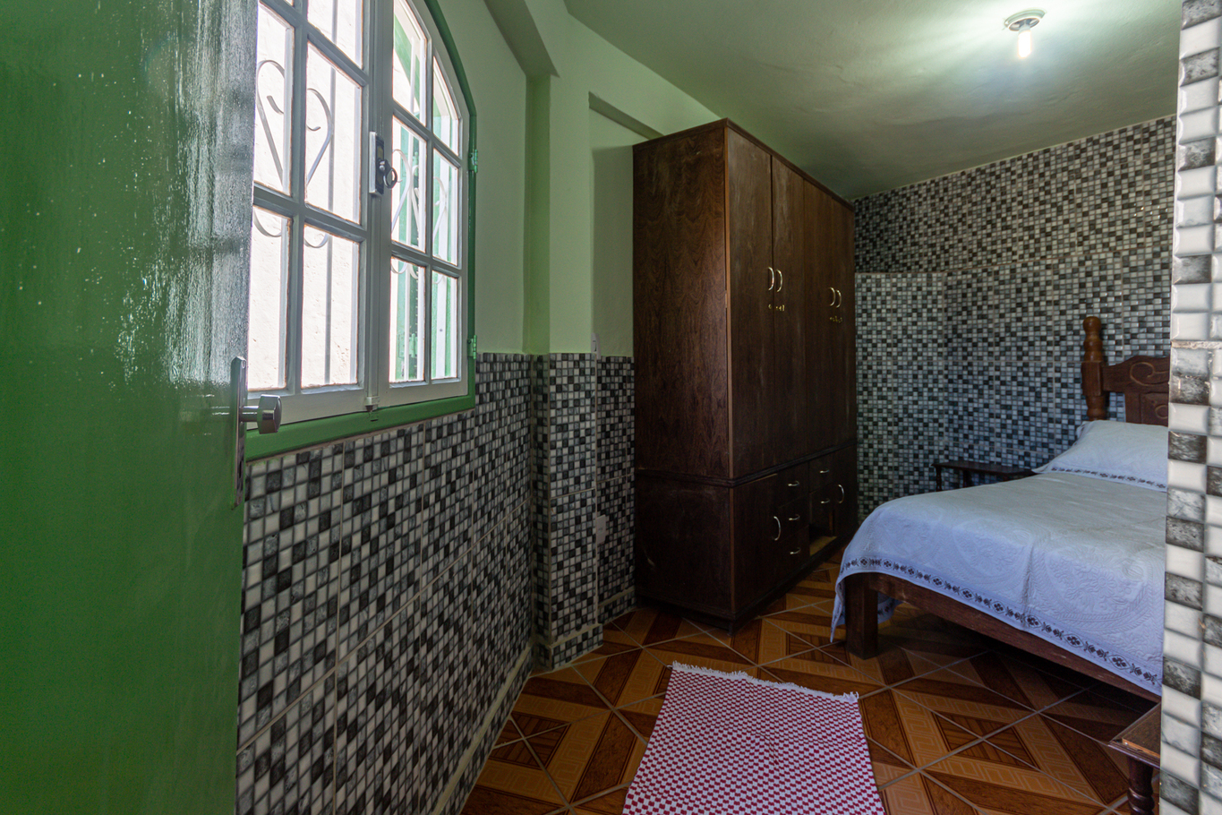 - Quarto arejado com cama queen, armário e mesas de cabeceira