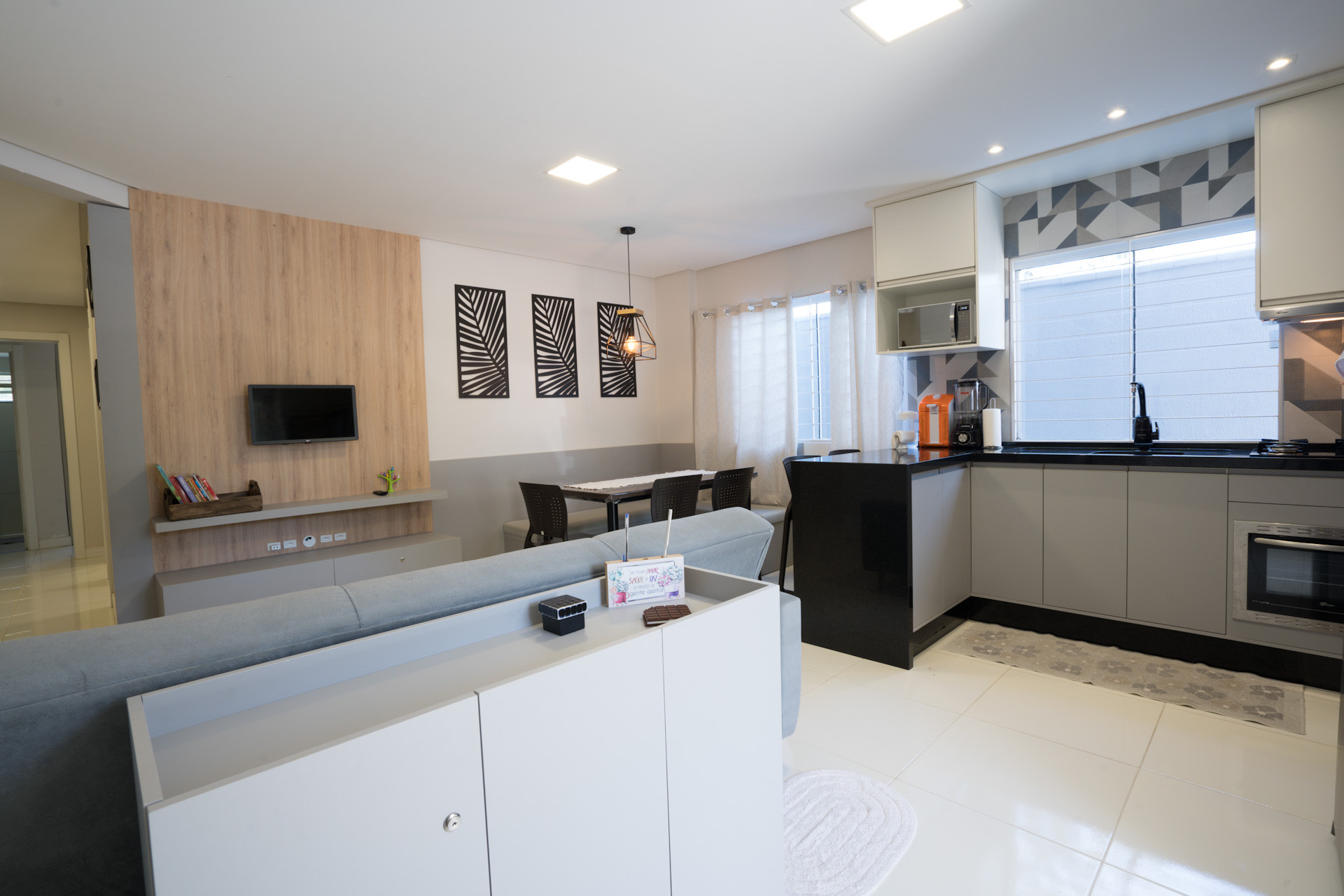- Cozinha americana com cooktop, exaustor, forno elétrico, geladeira, micro-ondas, liquidificador, panelas, louças e utensílios