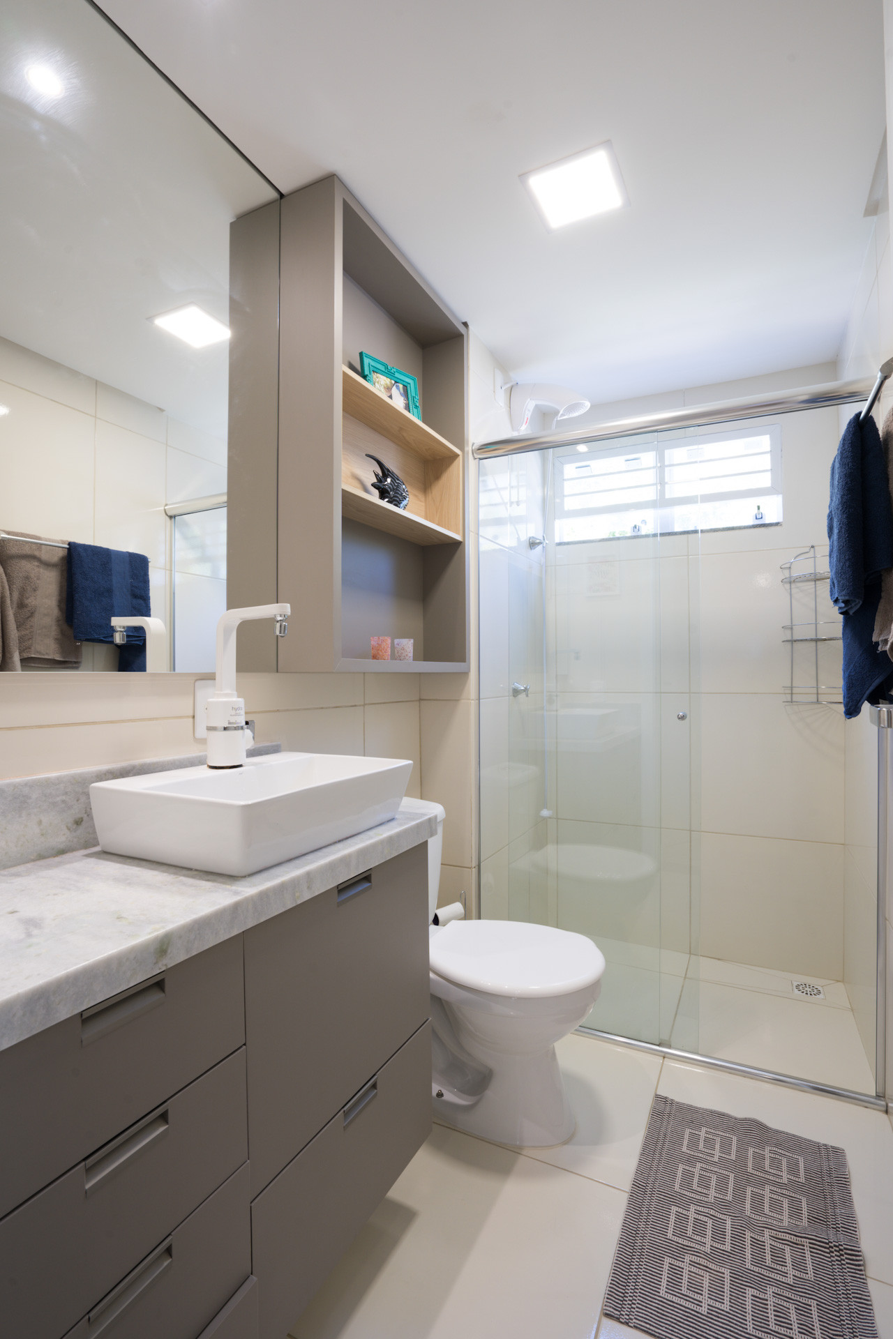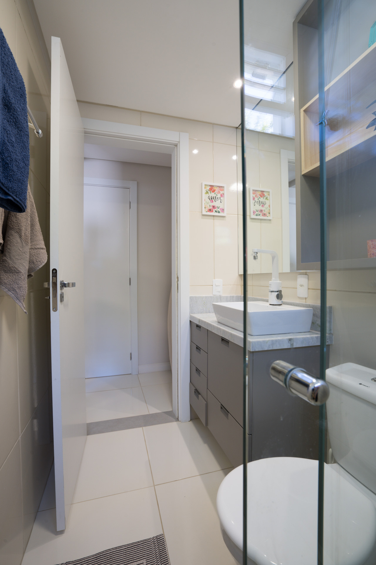 - Banheiros com chuveiro elétrico, box de vidro, armário e espelho
