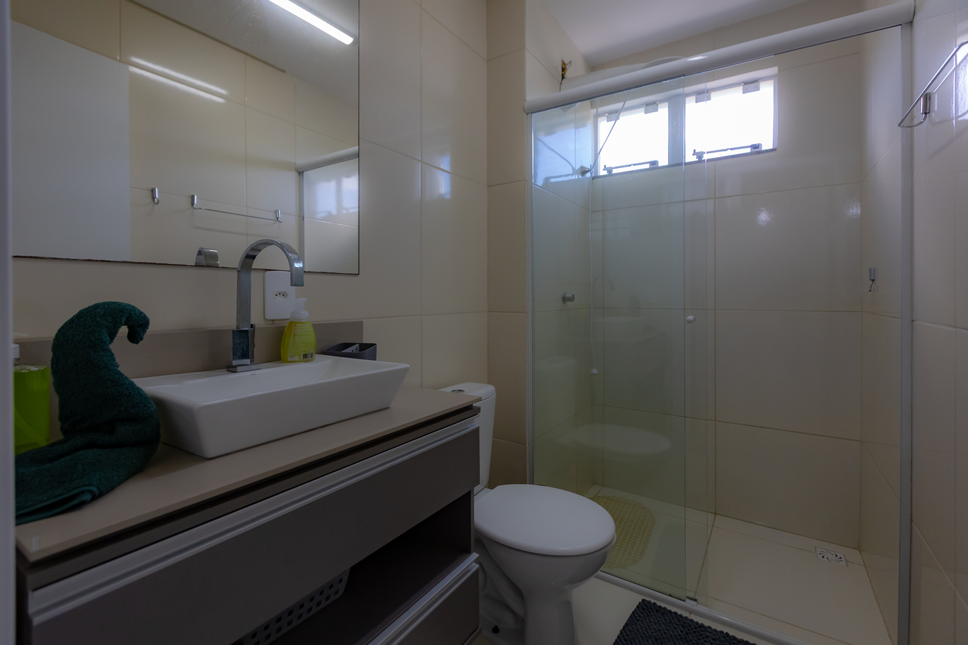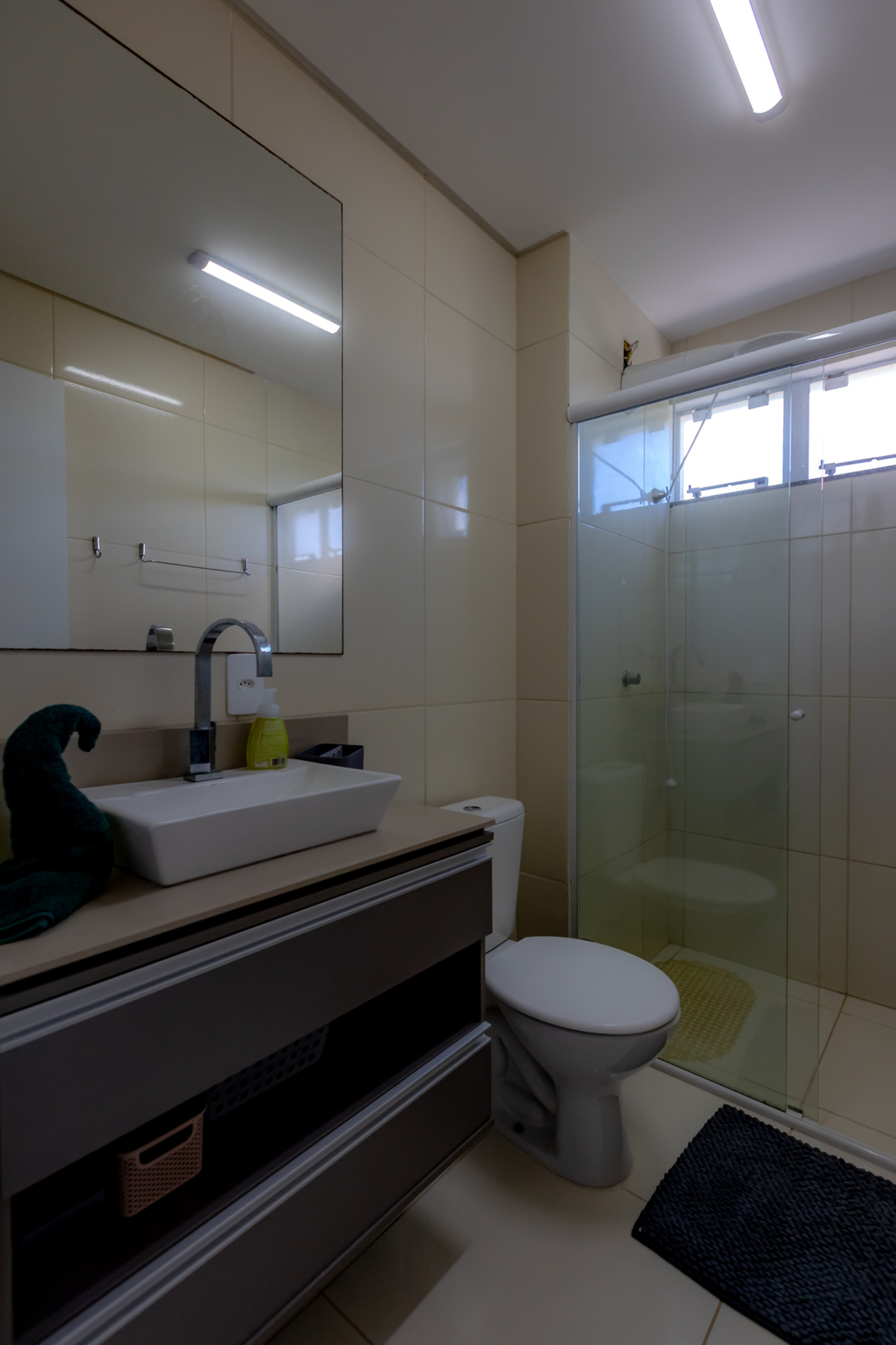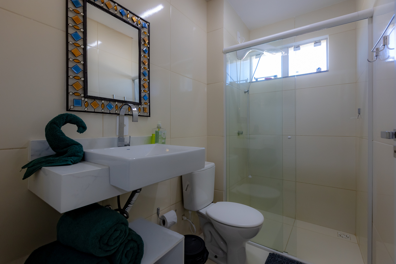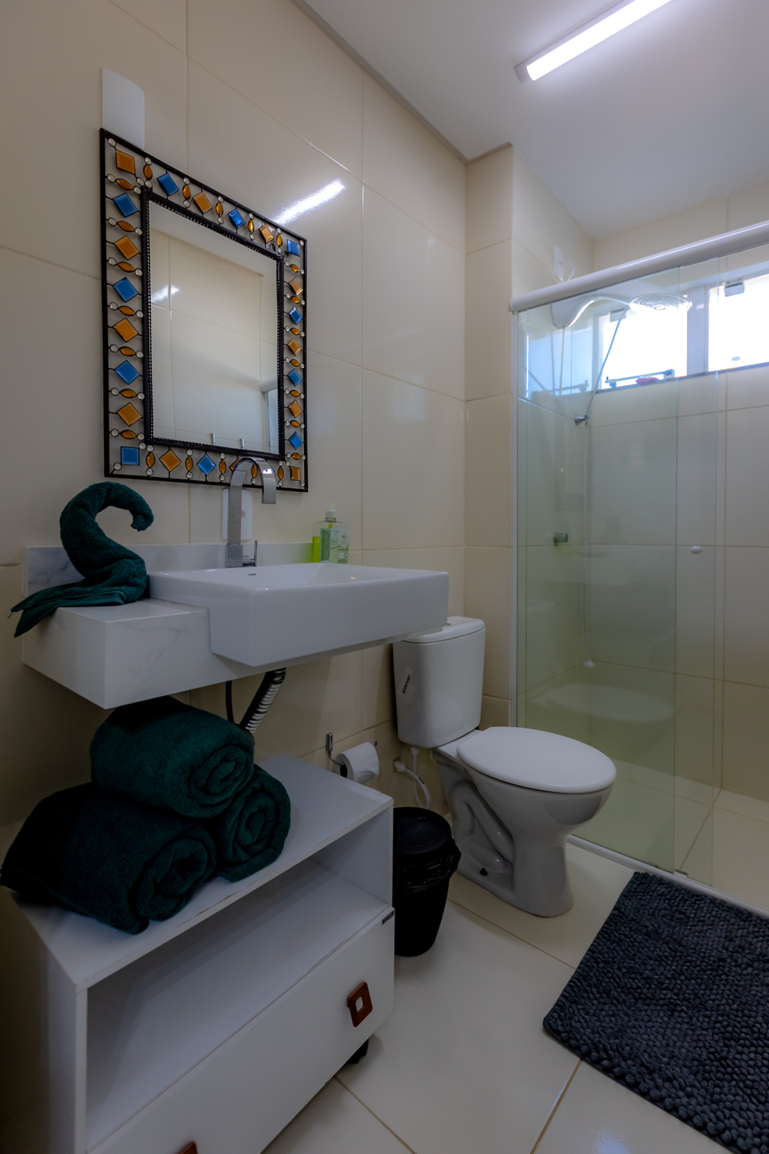 - Banheiro Social: Conta com chuveiro elétrico e box de vidro/acrílico