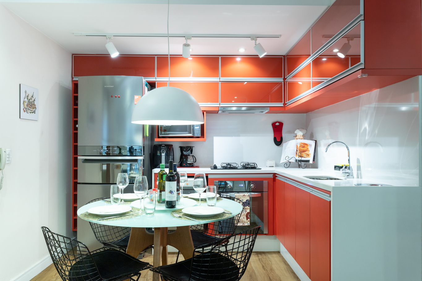 - Cozinha completa com fogão, forno, microondas, geladeira com freezer e adega, fritadeira, cafeteira, torradeira e utensílios diversos(exceto óleo e sal)