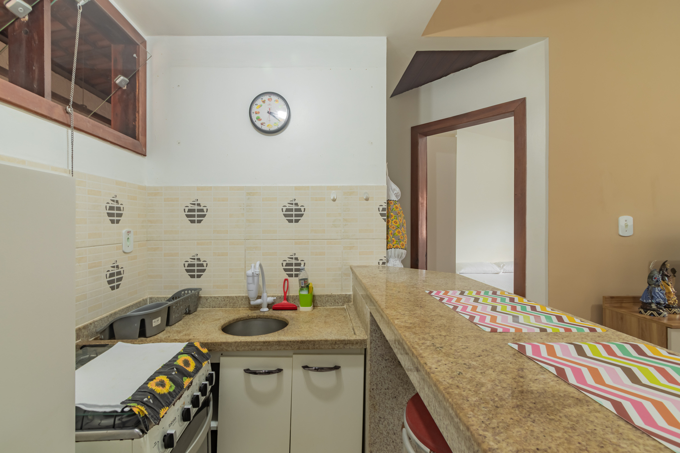 - A cozinha é equipada com diversos utensílios incluindo cafeteira, fogão, forno, geladeira , liquidificador, torradeira e espremedor de frutas (exceto sal, pimenta e óleo)