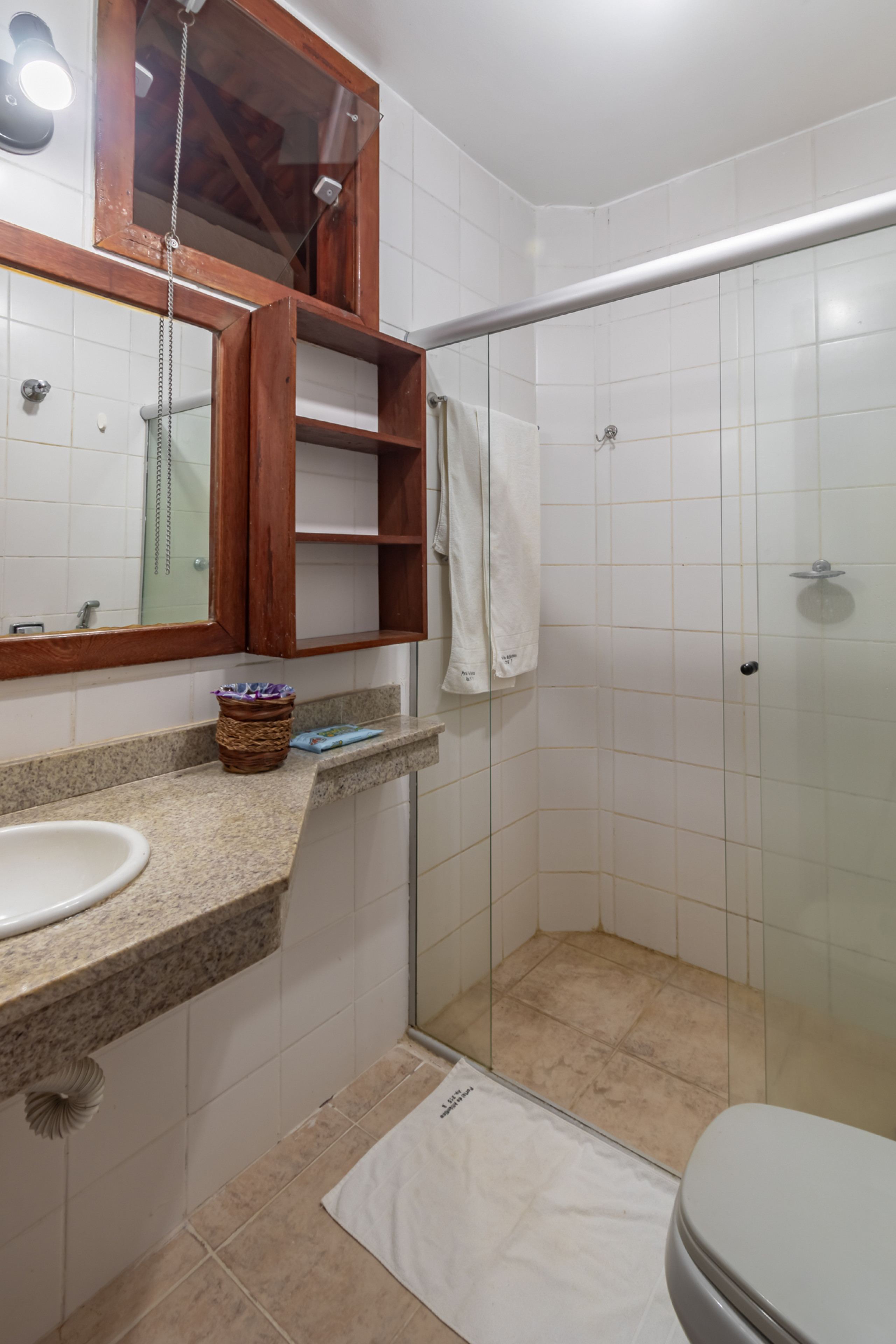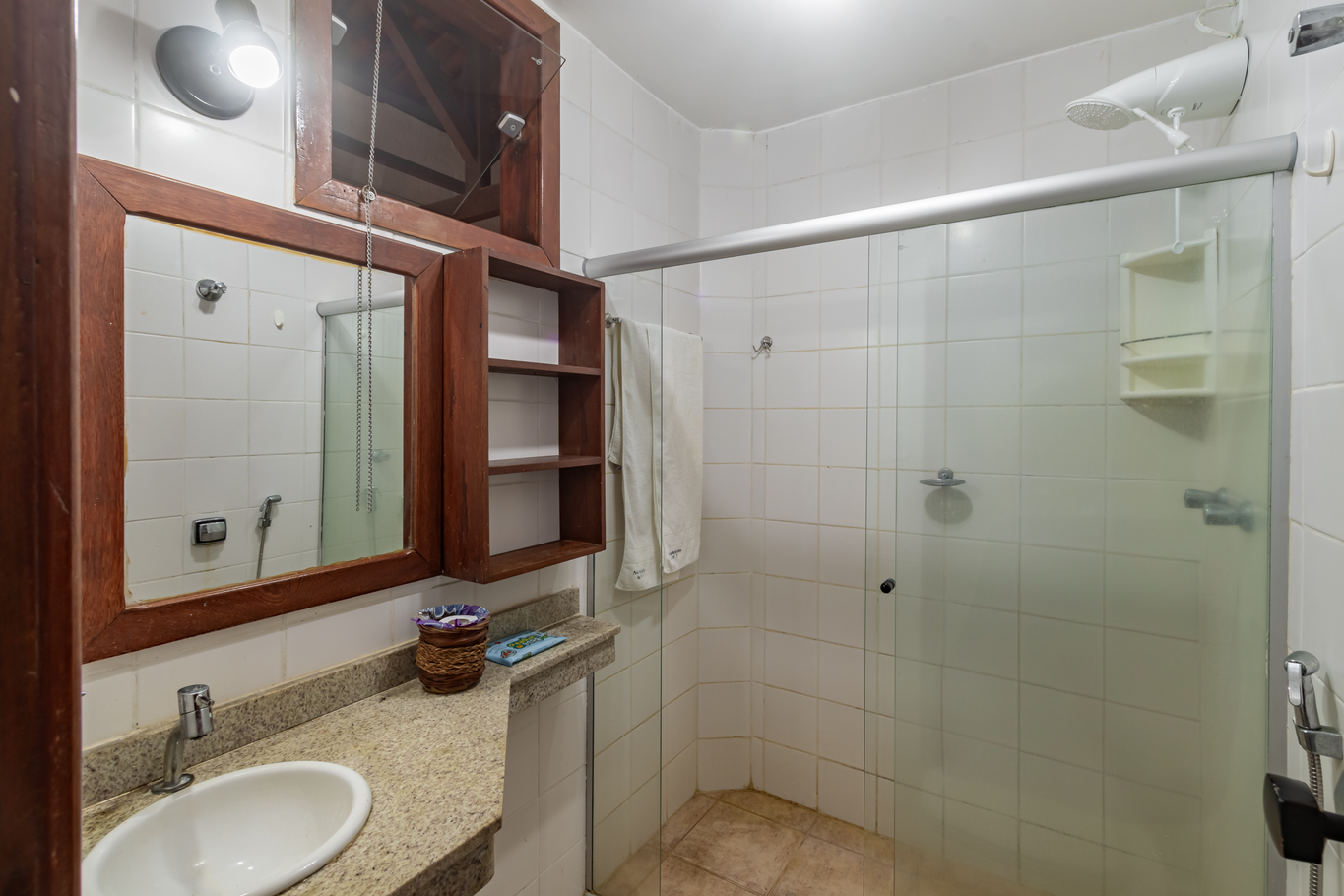 - O banheiro possui chuveiro elétrico e box de vidro/acrílico