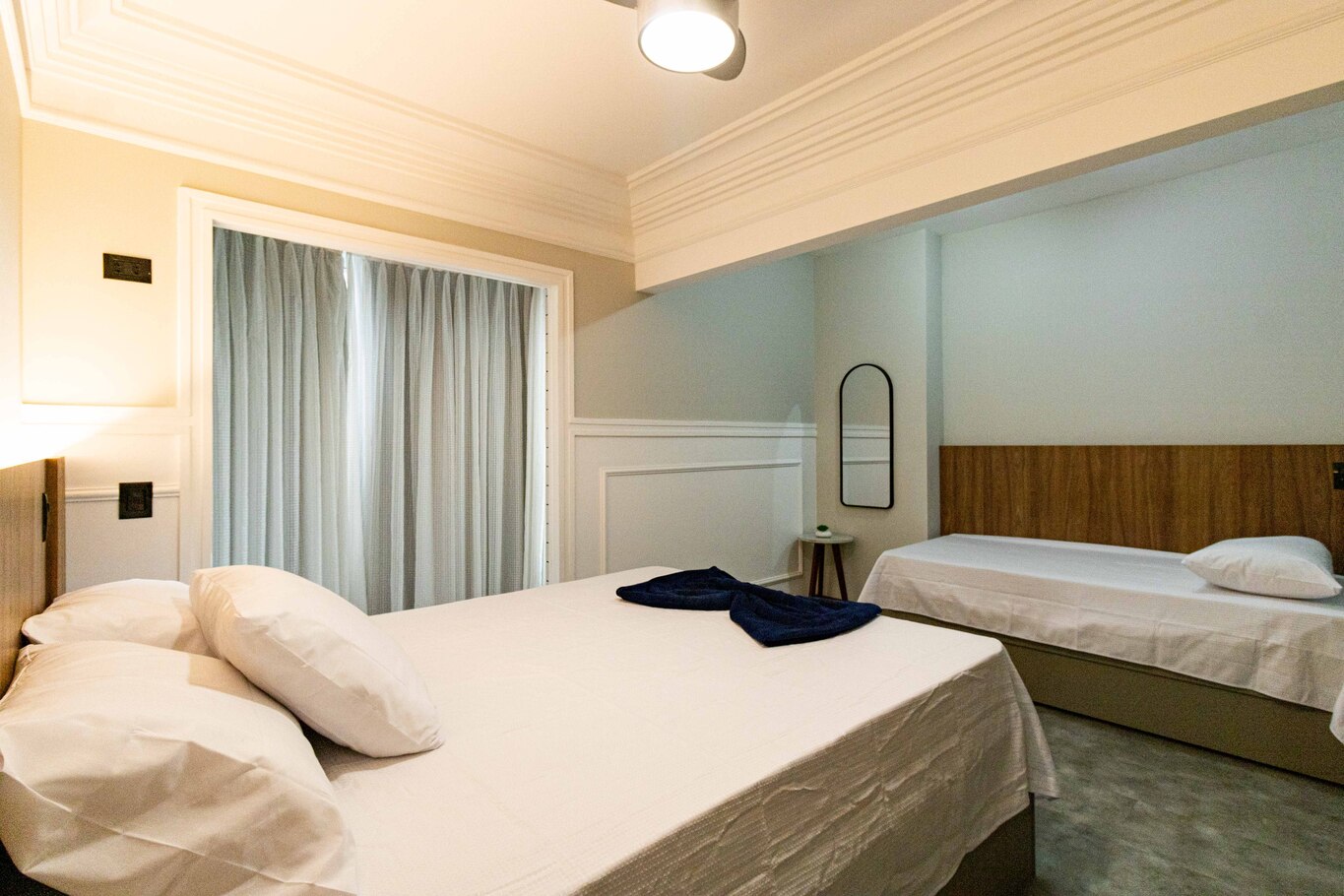 - No quarto há 1 cama de solteiro e 1 cama queen size