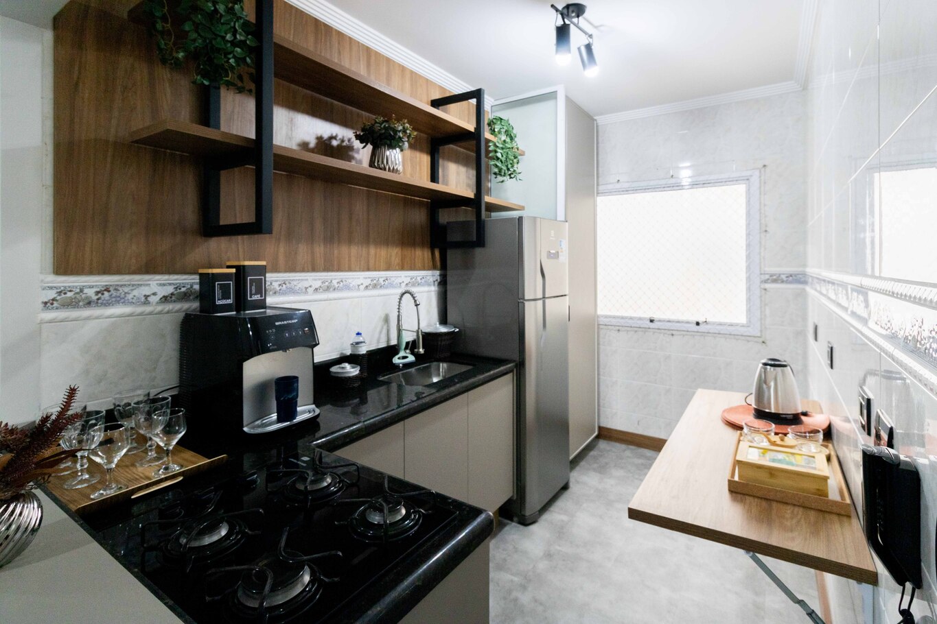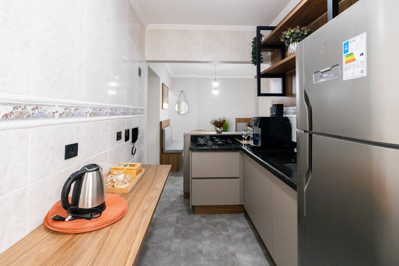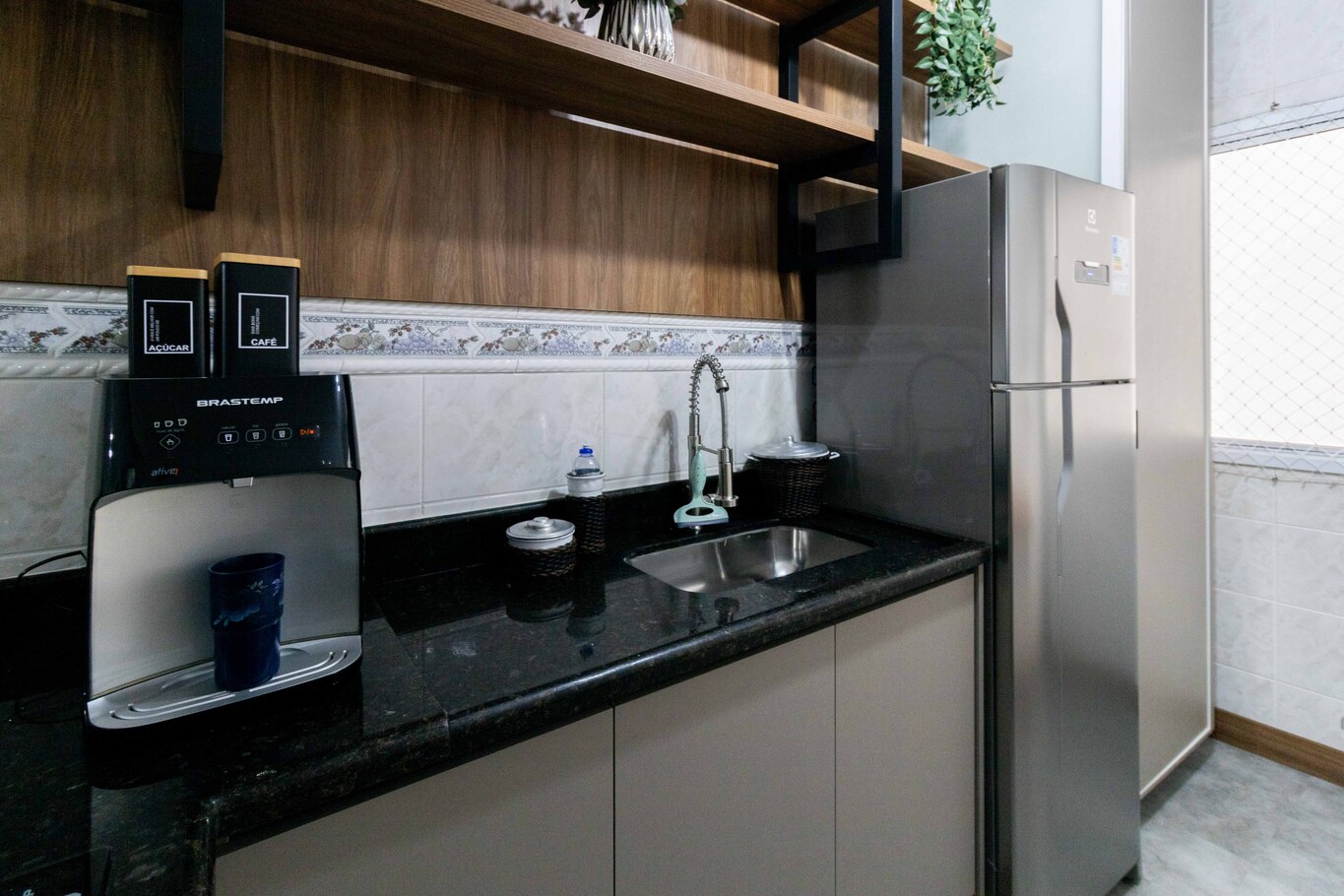 - A cozinha é equipada com diversos utensílios necessários para preparar deliciosos pratos, incluindo fogão, geladeira, purificador de água e liquidificador