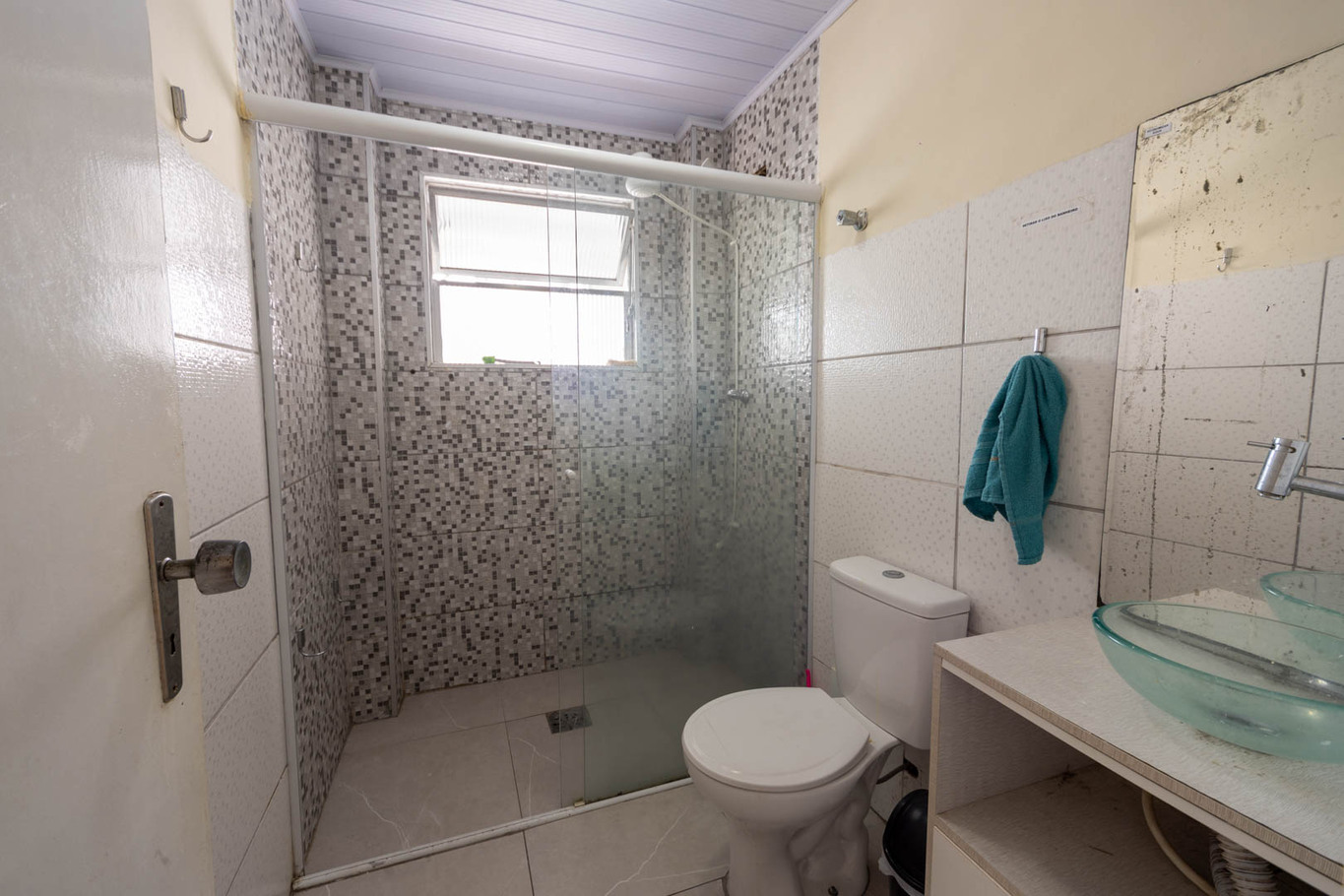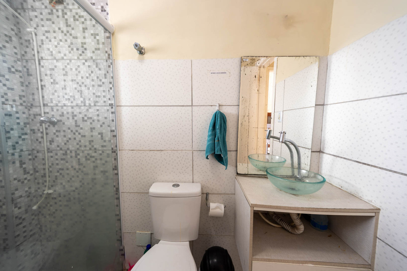 - Banheiro com box blindex, chuveiro elétrico, gabinete, pia com espelho e secador de cabelo