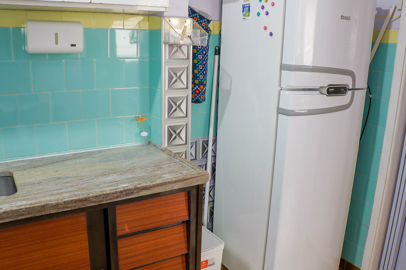 - O banheiro social possui chuveiro elétrico e box de vidro. Além de um um prático tanque com varal retrátil de teto