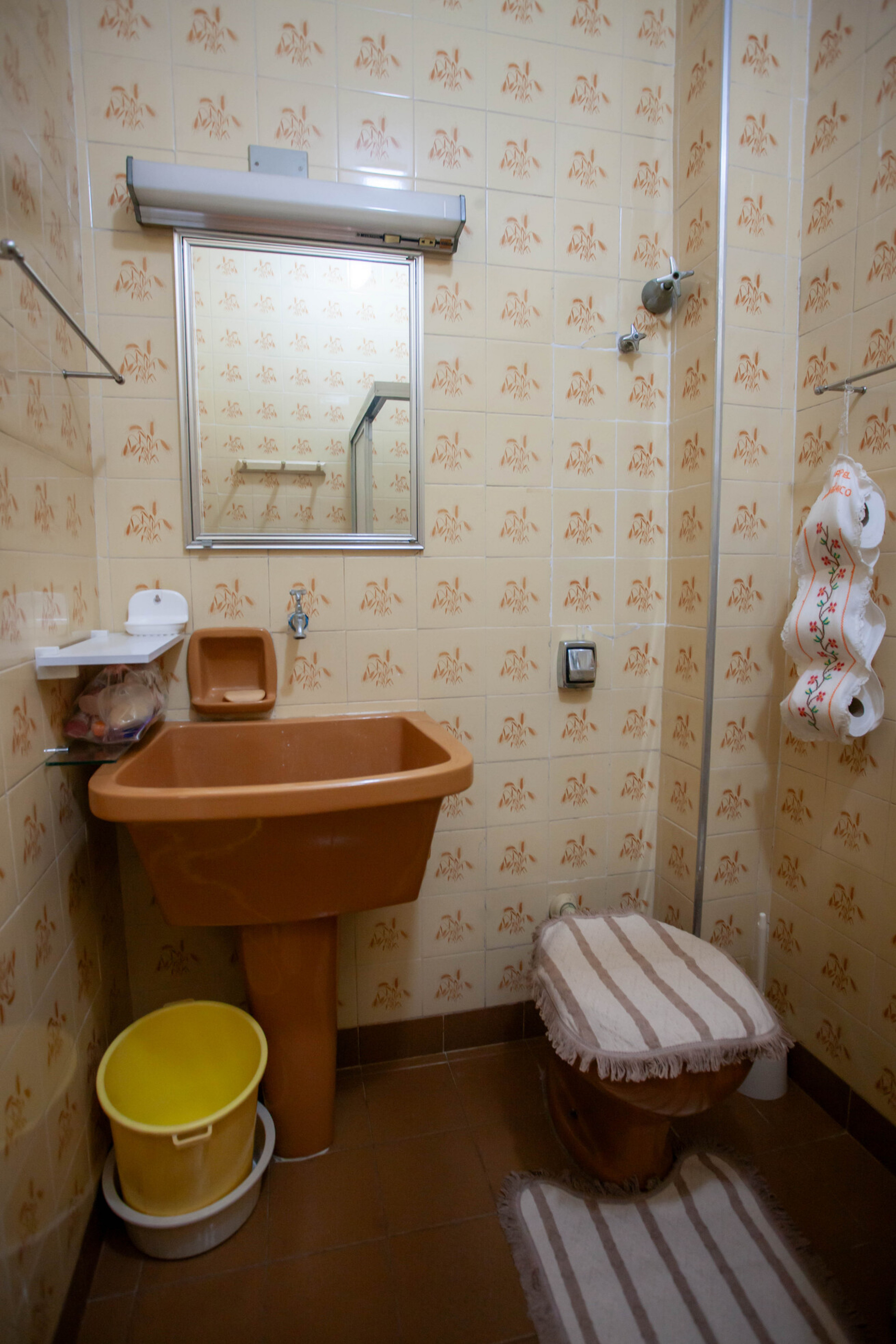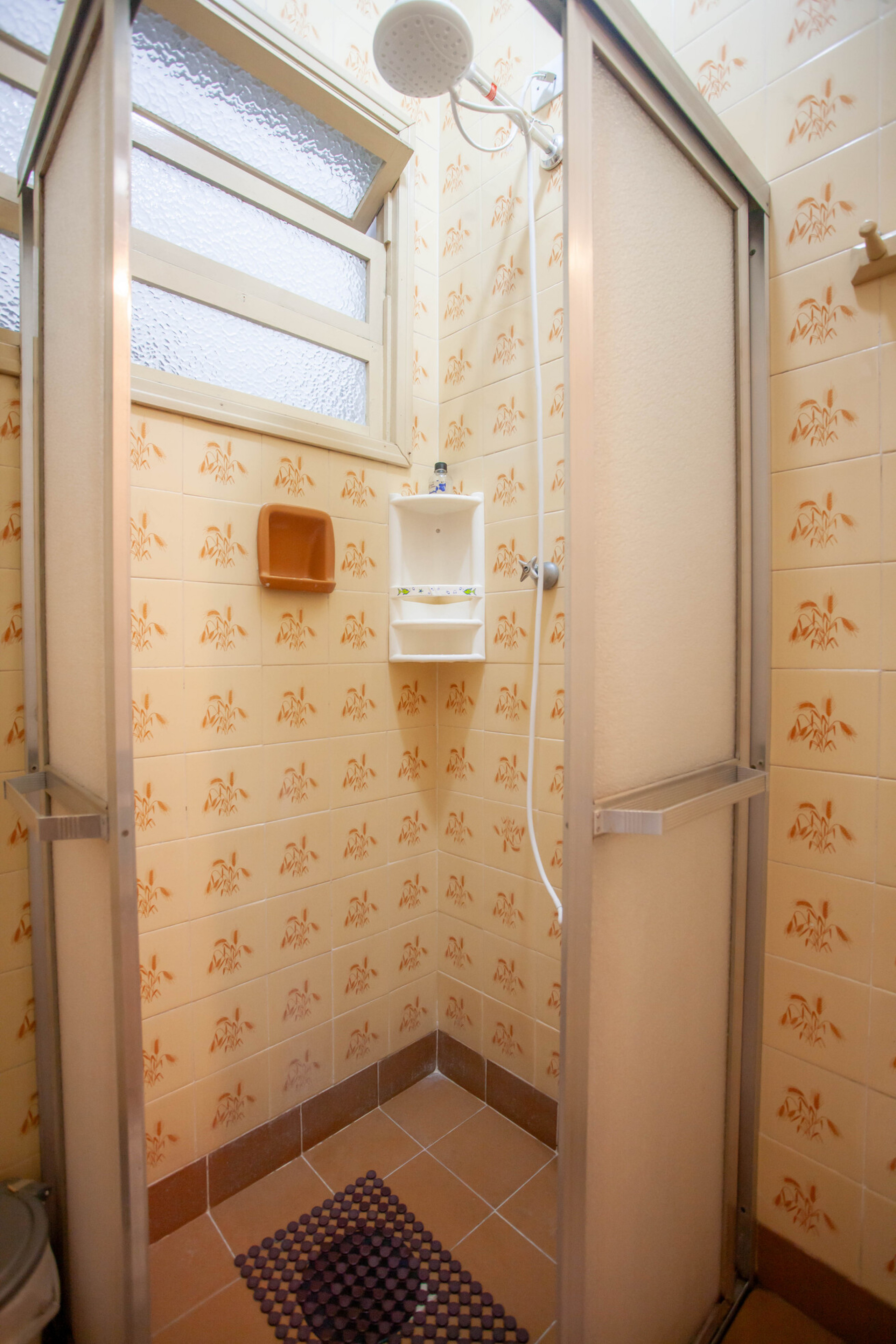 - O banheiro possui chuveiro elétrico, box de vidro/acrílico e secador de cabelo
