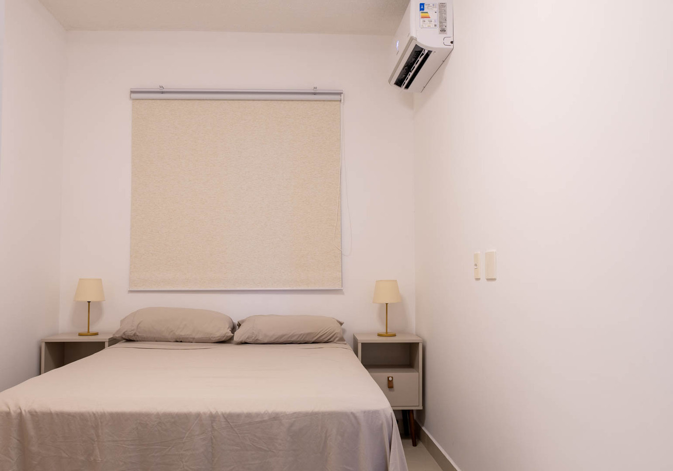 - Os dormitórios têm ar-condicionado, armário, edredom / cobertor e protetor de colchão