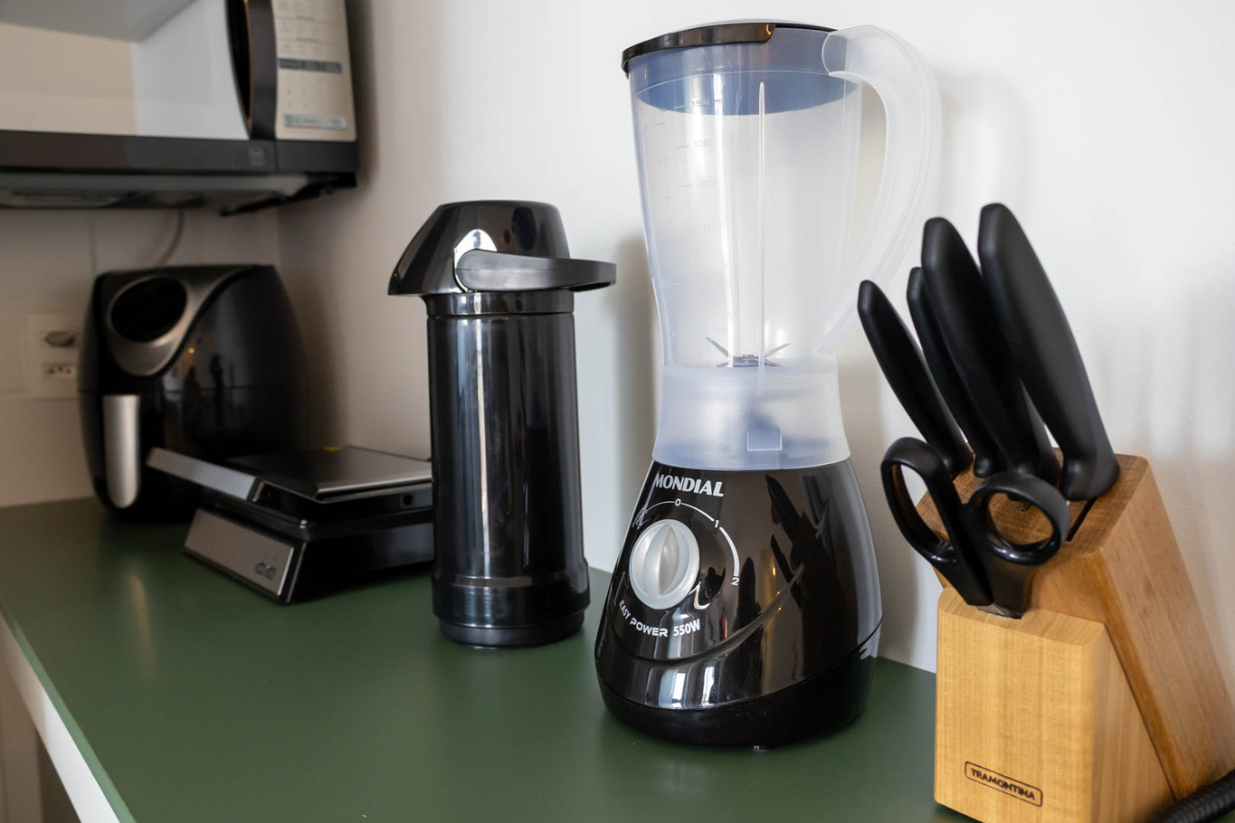 - A cozinha é equipada com diversos utensílios, incluindo batedeira, fogão, forno, geladeira, liquidificador, micro-ondas, sanduicheira, copos térmicos, taças, kit vinho e kit espumante (exceto sal, pimenta e óleo)