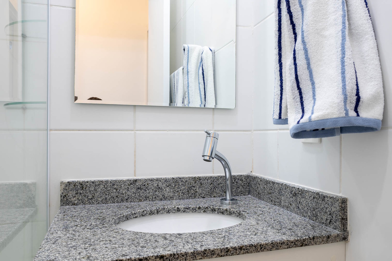 - O banheiro social possui chuveiro elétrico e box de vidro/acrílico