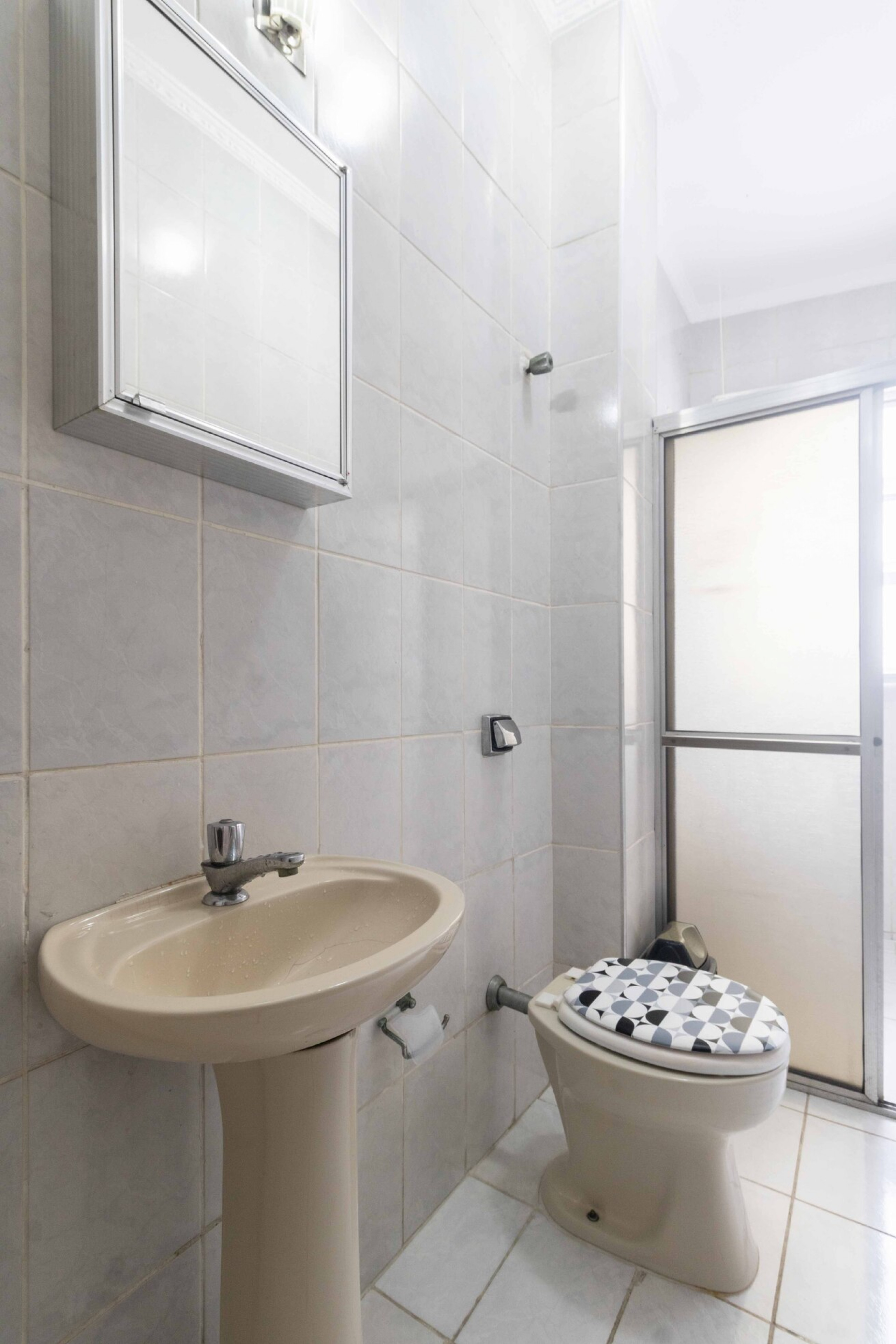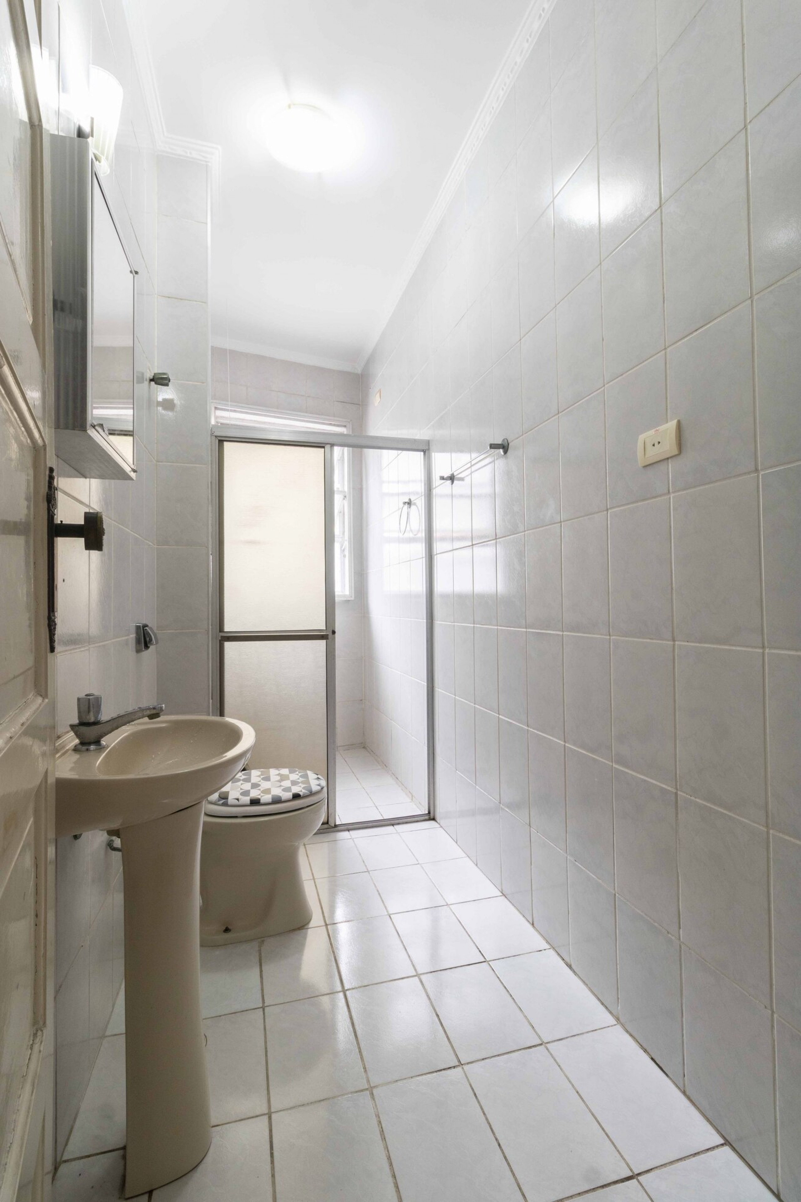 - Banheiro com box de vidro e chuveiro elétrico
