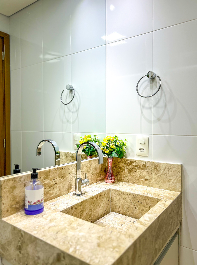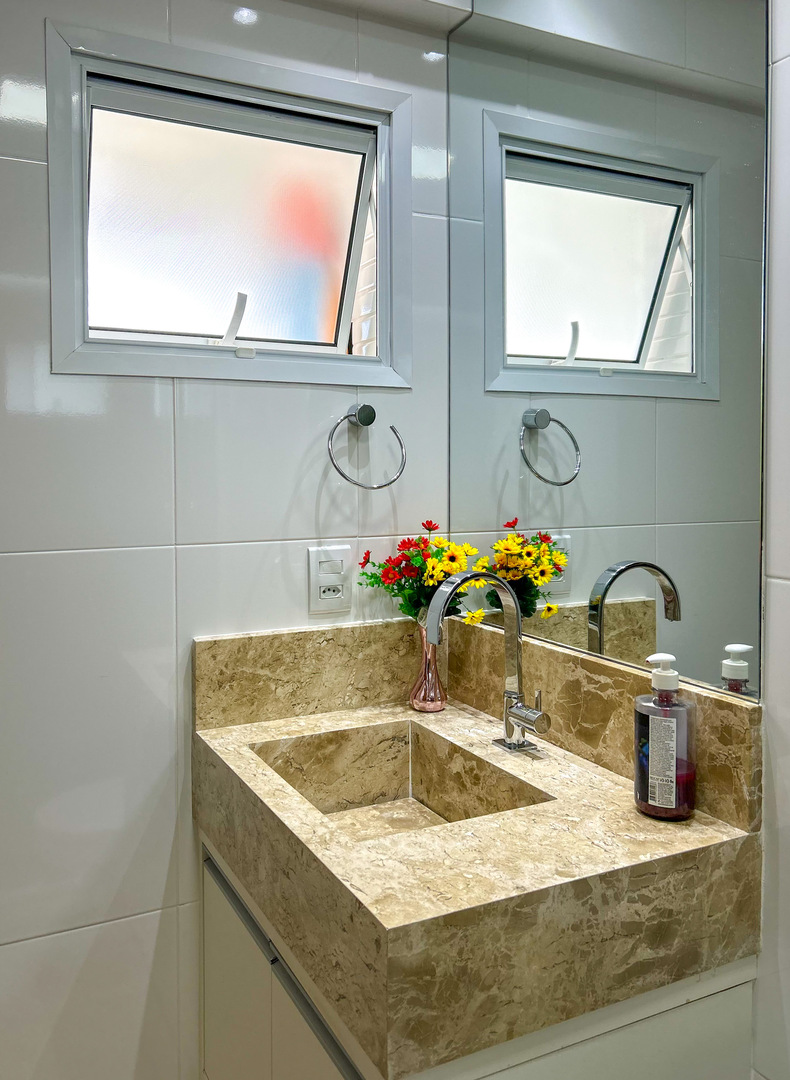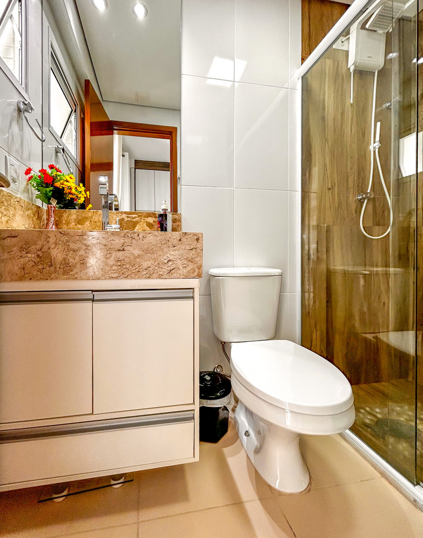 - Os banheiros possuem chuveiro elétrico e box de vidro/acrílico