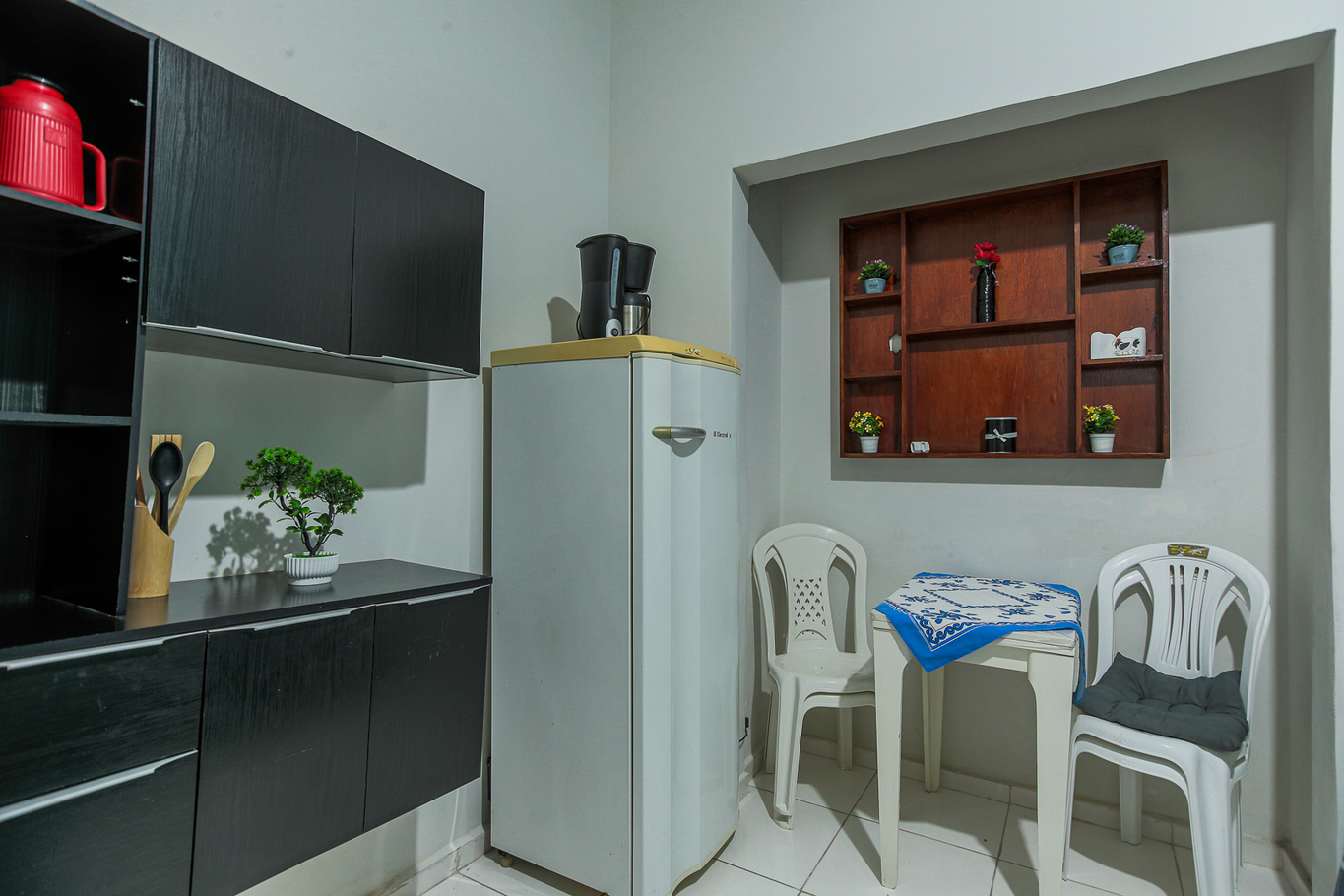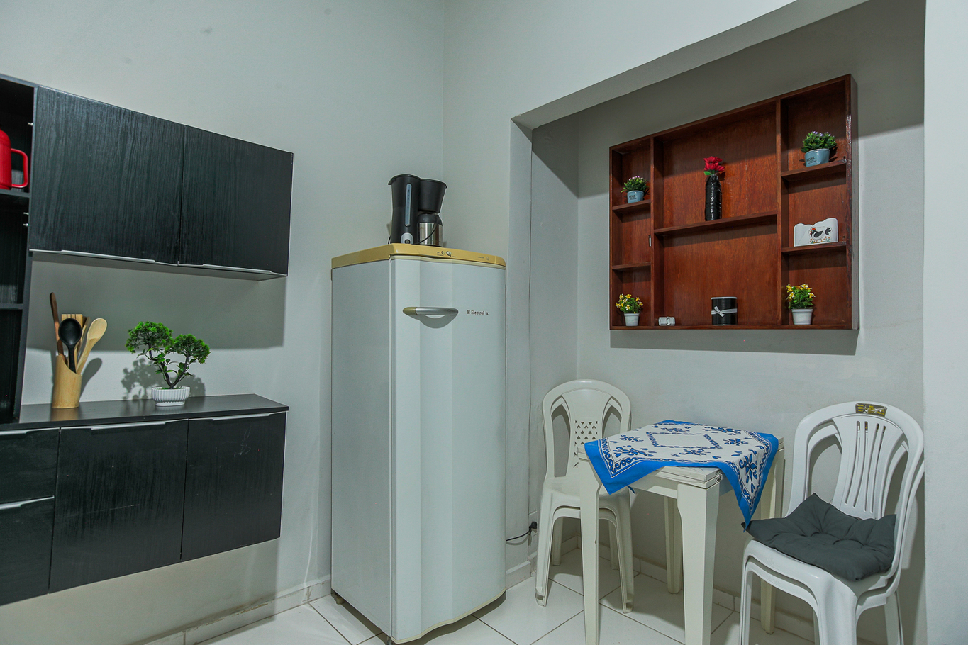 - A cozinha é equipada com diversos utensílios, incluindo cafeteira, fogão, forno e geladeira (exceto sal, pimenta e óleo)